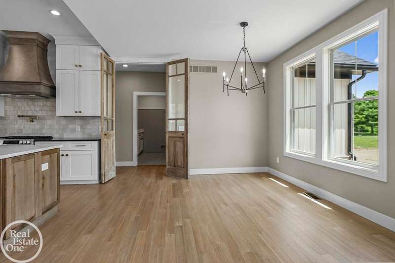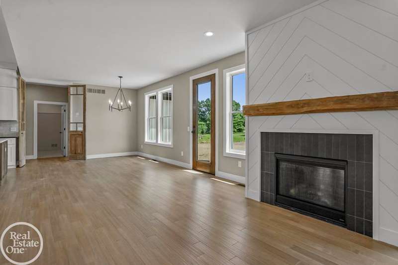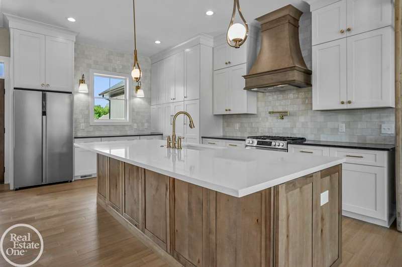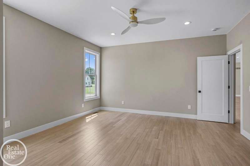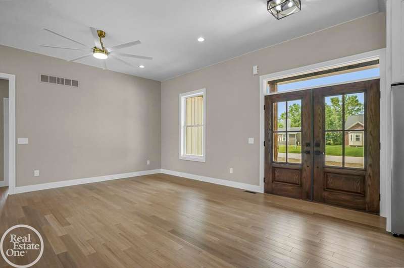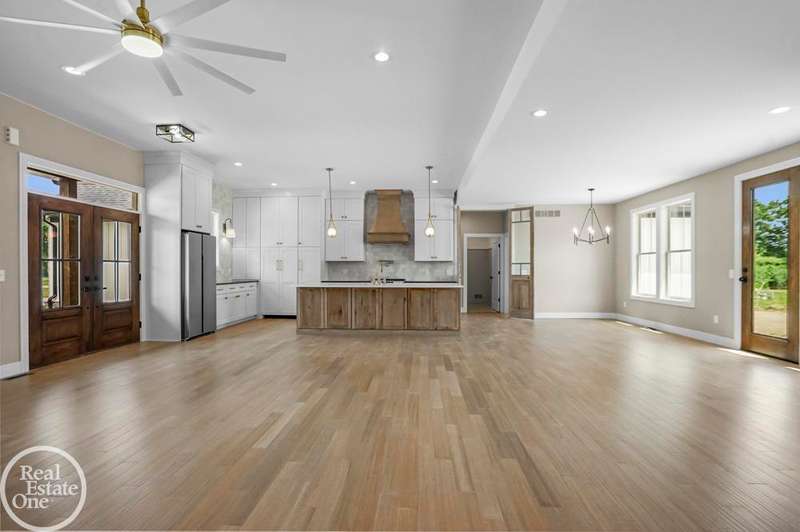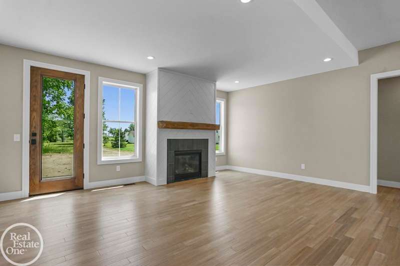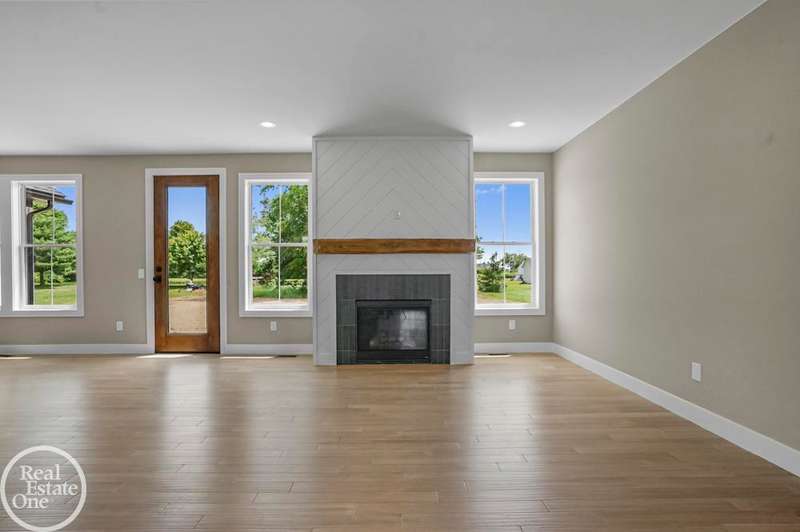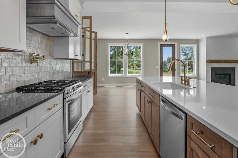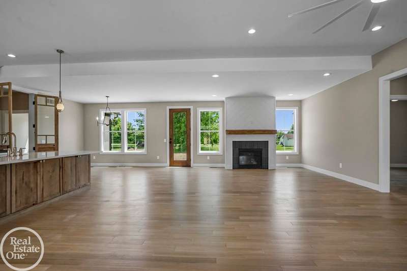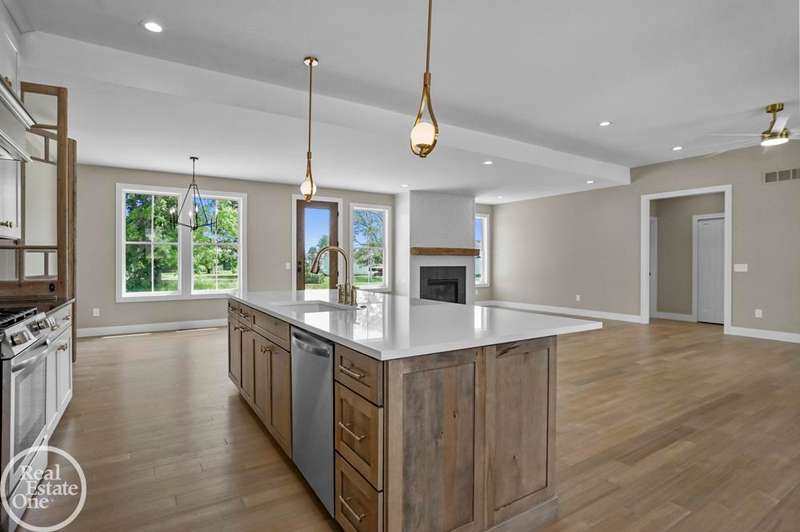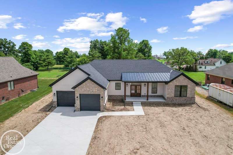 Stunning New Construction Split Ranch From the moment you arrive, you'll be impressed by the gorgeous stone accents, inviting front porch, elegant double wood doors, and stately columns. Inside, an open and airy floor plan combines elegance and comfort. The chef's kitchen is a true showstopper--featuring champagne bronze fixtures, cabinets to the ceiling with crown molding, a massive quartz island with sink, ceramic tile backsplash, pot filler at the stove, and abundant soft-close cabinetry. Don't miss the cleverly concealed walk-in pantry with a "Costco door" to the garage for effortless grocery unloading. The great room is flooded with natural light from large windows and offers soaring ceilings, recessed lighting, a ceiling fan, warm wood floors, and a gas fireplace. Unique 100-year-old antique French doors lead to the primary suite, laundry, and mudroom. The mudroom features a custom cubby, while the laundry boasts porcelain tile floors, quartz counters, a sink, and cabinetry. The primary suite offers recessed lighting, a ceiling fan, and a spa-like bath with quartz counters, dual sinks, porcelain tile flooring, a Euro glass shower, a soaking tub, towel warmer, and an expansive walk-in closet. Two additional bedrooms and a stylish main bath with black-and-gold fixtures are located on the opposite side of the great room. The lower level includes a large basement with egress window, high-efficiency furnace, 50-gallon water heater, and rough-in for a third full bath. Outside, enjoy a spacious backyard with exposed aggregate patio and views of Lake St. Clair. This home is complete and move-in ready--don't miss your chance to own this exceptional property!