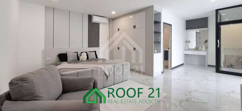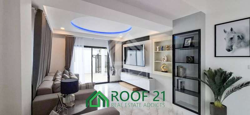 Additional features include a laundry area, two indoor parking spaces, and a remote-controlled gate for added security and convenience. The title is held under a Thai company name, making the transfer process simple and cost-effective for a new owner.