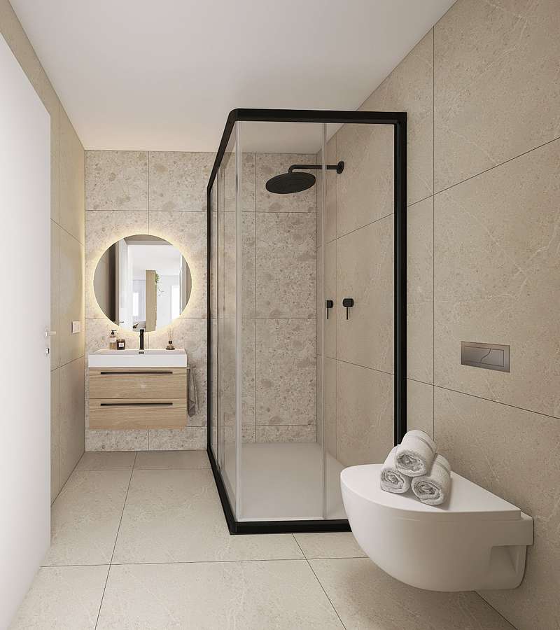 These elegant villas feature a contemporary design with spacious open-plan living areas filled with natural light. The homes offer 4 bedrooms, 3 stylish bathrooms, and a fully equipped kitchen with high-end appliances that seamlessly connects to the dining and living space. A standout feature is the 39 m² private solarium, providing breathtaking panoramic views of the surrounding landscape. High-quality materials and modern finishes enhance the luxurious appeal of these homes.