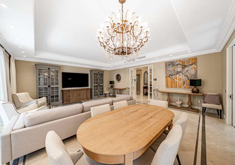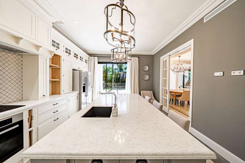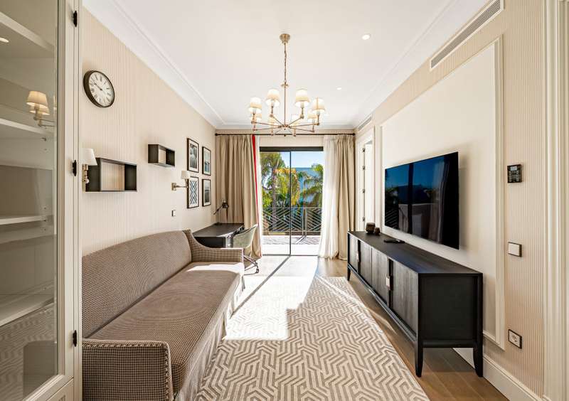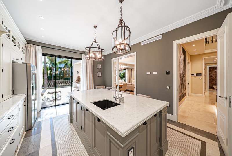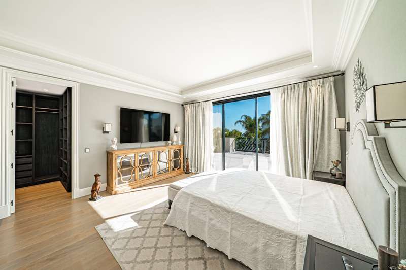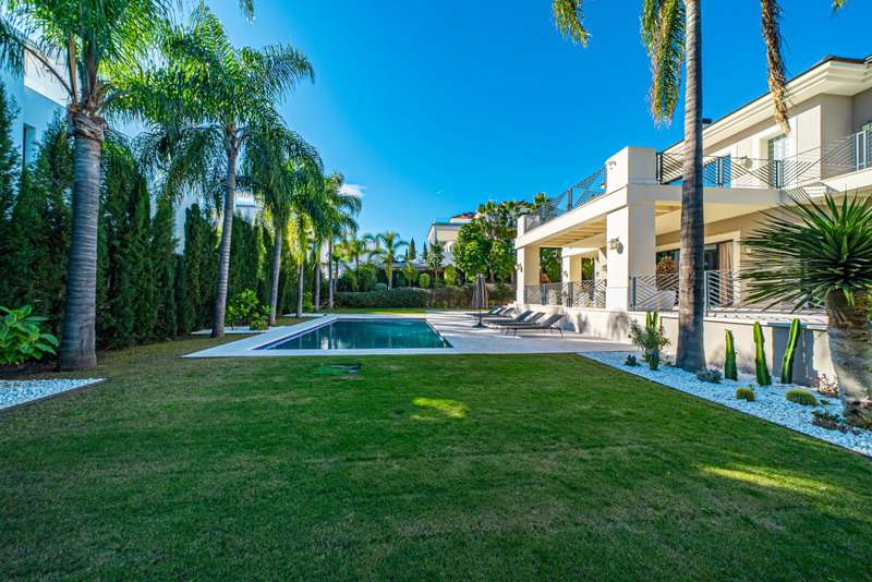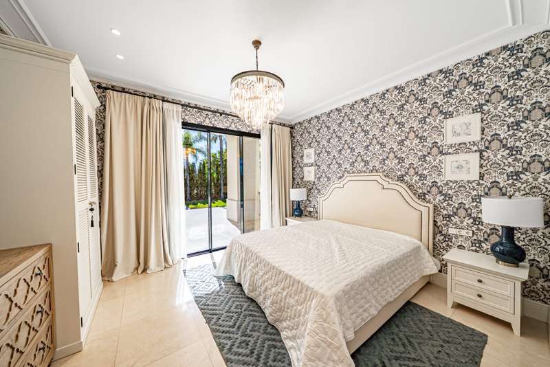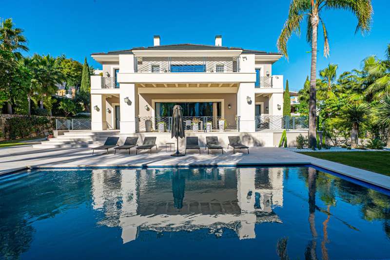Located in the prestigious Los Flamingos Urbanization, above the New Golden Mile in Cancelada, this luxurious villa enjoys a prime location just 10 minutes from Puerto Banús. With panoramic views of the sea, mountains, and golf courses, it perfectly balances the tranquility of nature with the vibrancy of city life. Newly built, the villa stands out for its elegant and sophisticated design, where soft pastel tones and geometric shapes create a harmonious aesthetic. Equipped with smart home technology, it offers modern convenience without sacrificing the warmth of a cozy home. Fully furnished and move-in ready, it features six spacious en-suite bedrooms, making it ideal for families or hosting guests in total comfort. On the main floor, a state-of-the-art kitchen, a bright living room, and a large covered terrace connect to the pool and garden, while a guest bedroom with a private terrace provides additional privacy. Thinking of making a move to Marbella? Reach out!