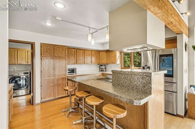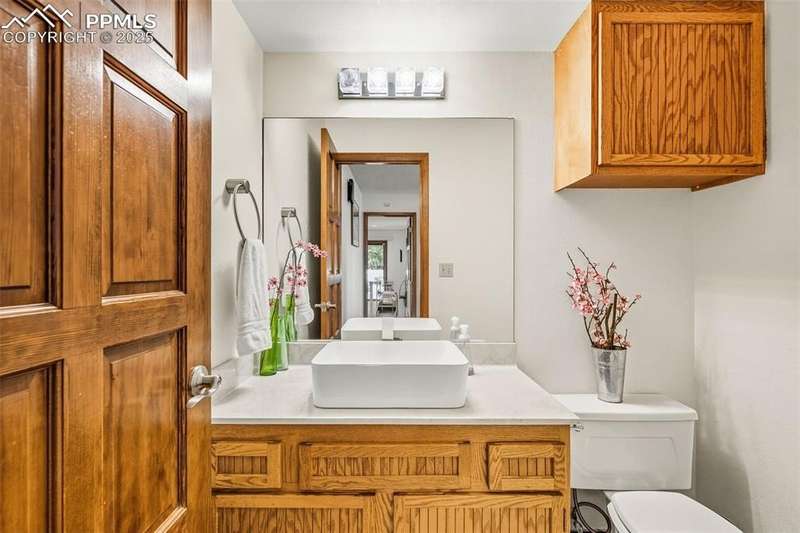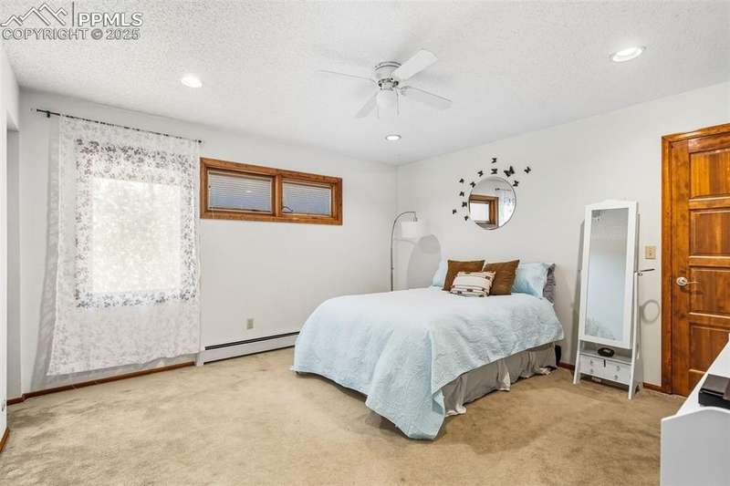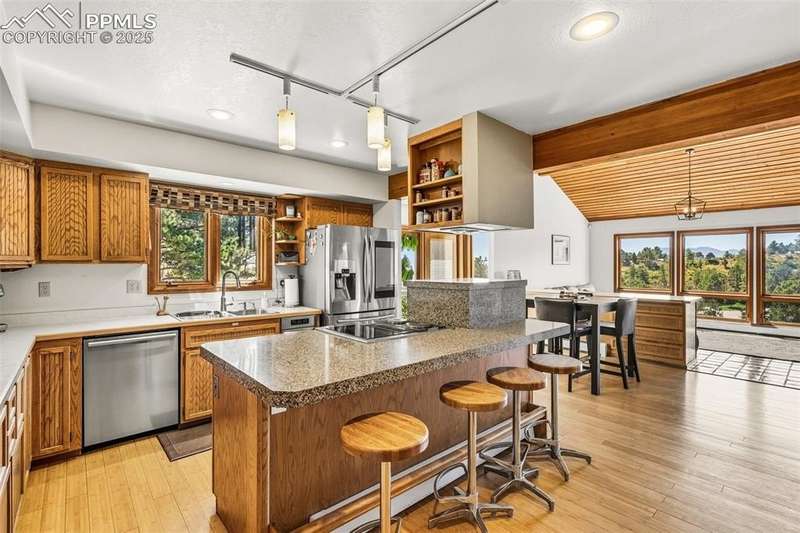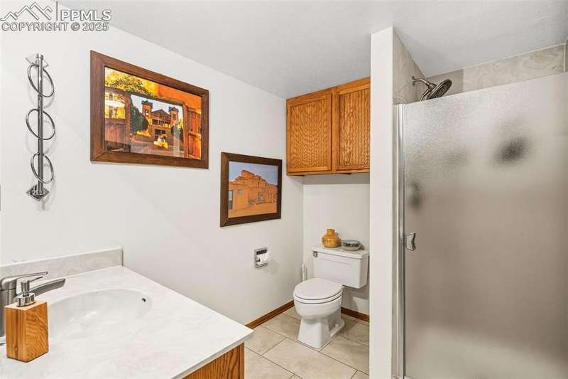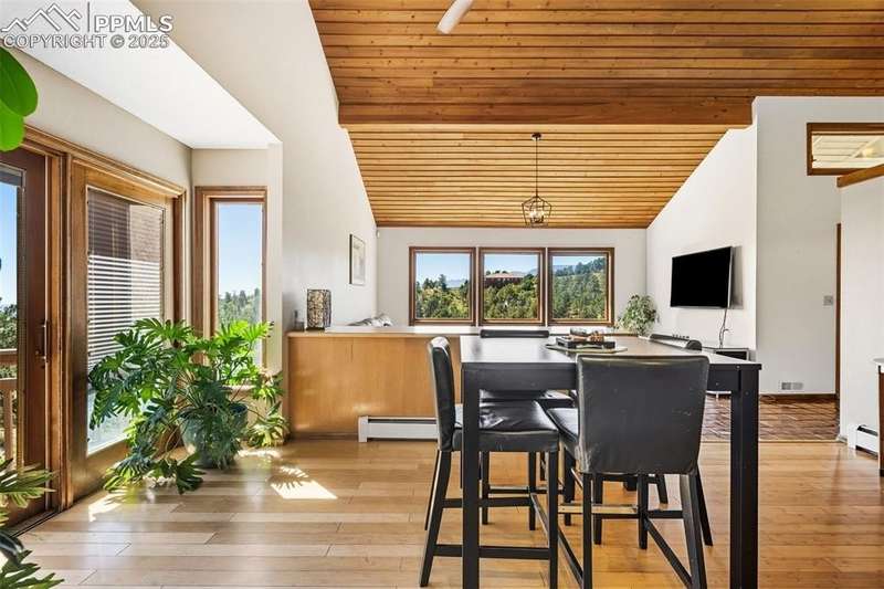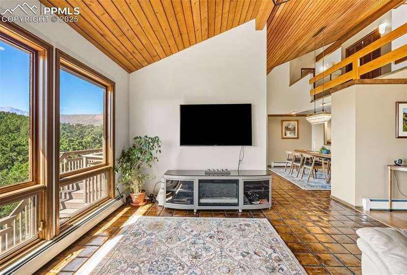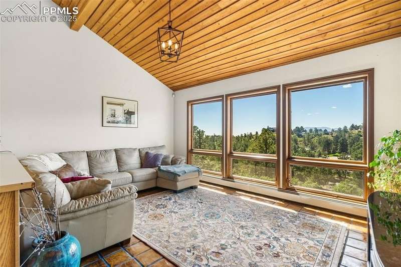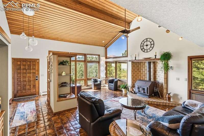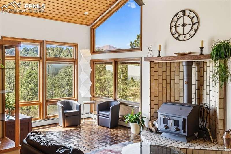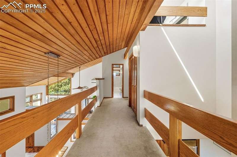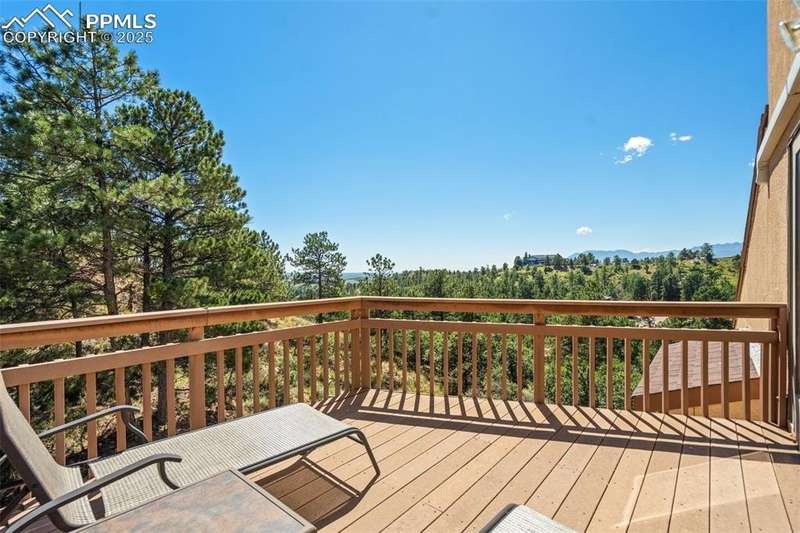 Nestled in the desirable Oak Hills neighborhood in Northwest Colorado Springs, this one-of-a-kind home offers breathtaking mountain, city, and bluff views from every window. Set on over an acre, the property delivers more than 1,200 sq ft of deck and patio space for the ultimate Colorado outdoor living experience. Inside, the main-level master suite features a spacious 5-piece bath, walk-in closet, and direct access to its own private deck with hot tub. A newly converted office with skylights and fresh finishes showcases dramatic mountain views, while a striking living room with fireplace and hand-painted tile floors by a local artist serves as a centerpiece. The expansive dining room and open kitchen with island, stainless steel appliances, and breakfast nook flow seamlessly to the deck for outdoor dining or entertaining. A family room with a wall of windows frames the sweeping vistas, creating an ideal gathering space. Upstairs, a versatile loft with private deck and adjacent ¾ bath is perfect for guests, an office, or playroom, and is complemented by two bedrooms, a full dual-vanity bathroom, and a charming reading loft. The oversized heated garage features its own zone and tall door for a conversion van. The walkout basement offers a spacious rec room with wet bar, projector screen, bedroom, ¾ bath, and large wine cellar/storage room. Updates include a new boiler (Sept 2024), newer mini-split A/C (2021), stucco exterior, and fresh touches throughout. With its rare privacy, custom floorplan, and resort-like feel, this home evokes the charm of a mountain retreat while being just minutes from I-25, shopping, hiking and biking trails, schools and parks. Located in award-winning Academy District 20, this home combines unique character with unmatched convenience. Don’t miss your chance to experience this extraordinary property—schedule your private showing today!