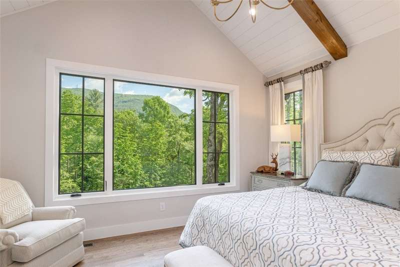 Built in late 2022, this beautiful home offers an incredible opportunity to live in the desirable Burlingame Country Club. Situated on a level-entry lot, it features a fenced and landscaped yard for added privacy and curb appeal. An abundance of windows fills the modern open floor plan with natural light and provides stunning year-round views of Hogback Mountain. The chef's kitchen is a dream, complete with high-end appliances and finishes. A soaring stone fireplace serves as the centerpiece of the inviting living area, perfect for relaxing or entertaining. The primary suite is a personal sanctuary with a luxurious bathroom, while two additional ensuite bedrooms offer comfort and privacy for guests. A finished room with a full bathroom above the garage is ideal for an office or overflow accommodations. Enjoy mountain living on the screened porch or open deck, designed for relaxation and taking in the views. Additional features include a whole-house generator and numerous thoughtful upgrades throughout. Don't miss the chance to own this remarkable home! Membership to Burlingame Country Club is by invitation, offering access to world-class golf, tennis, fitness, dining, and a welcoming social calendar - but is not required for ownership.