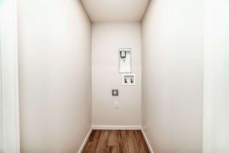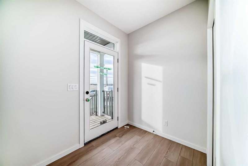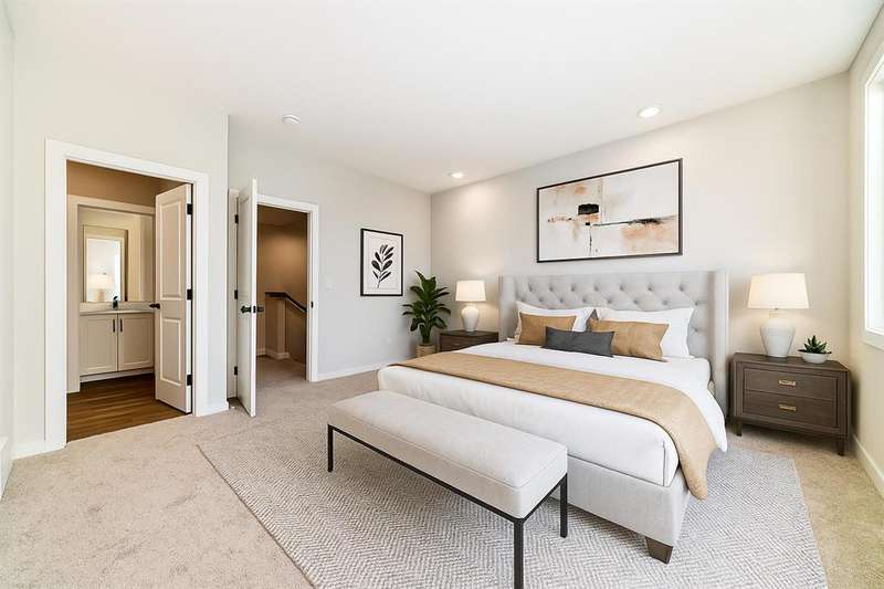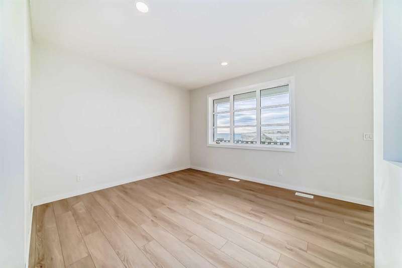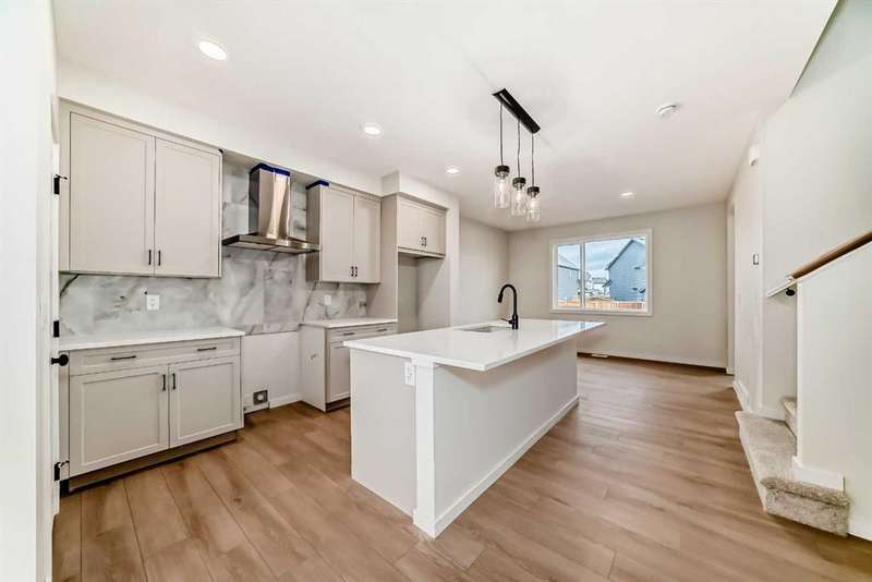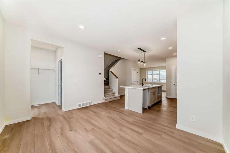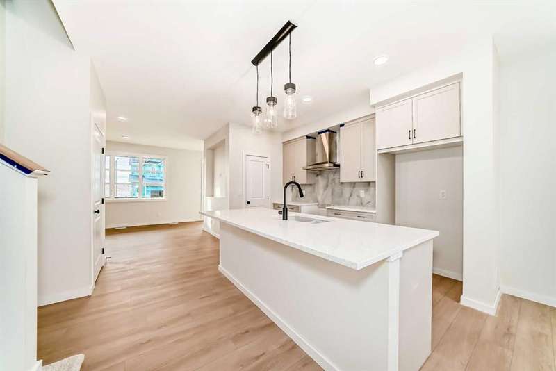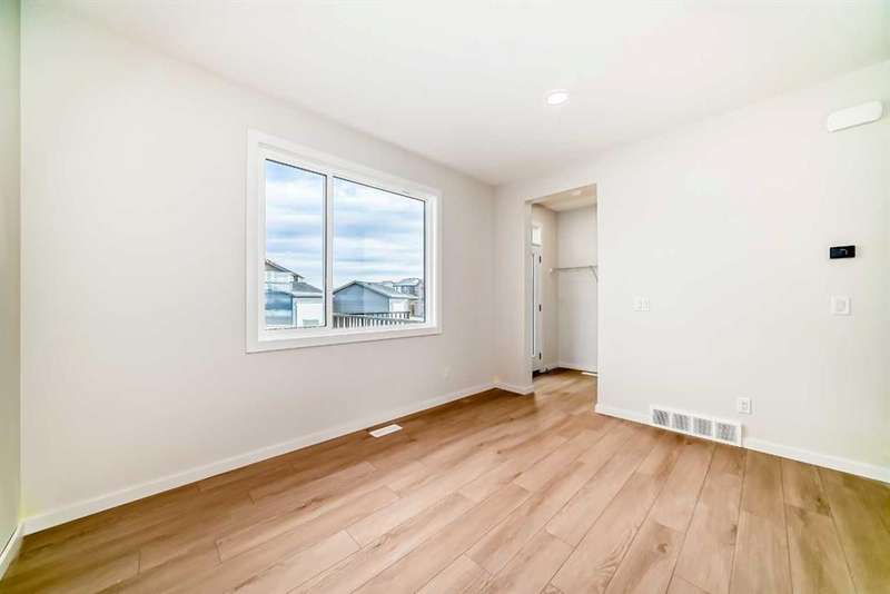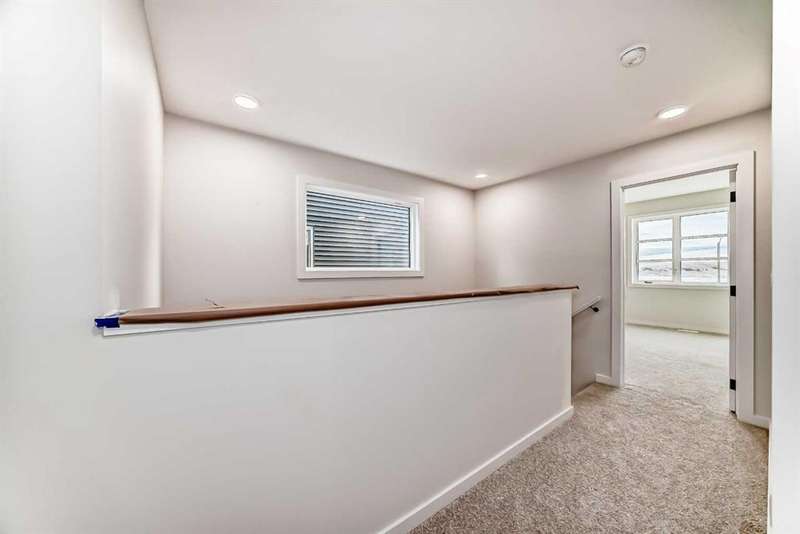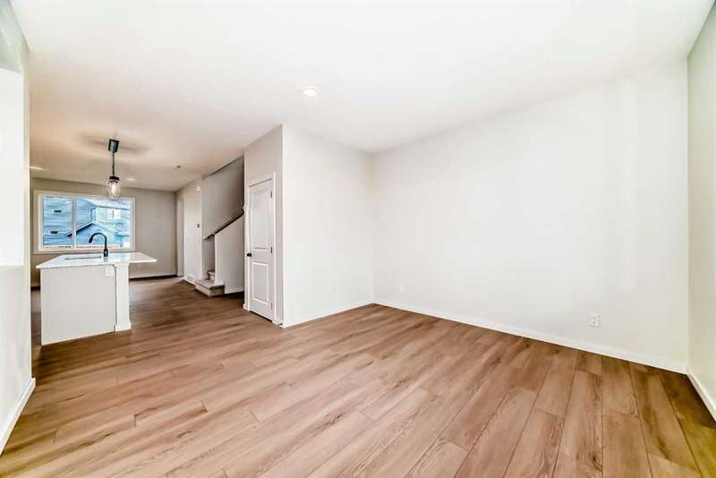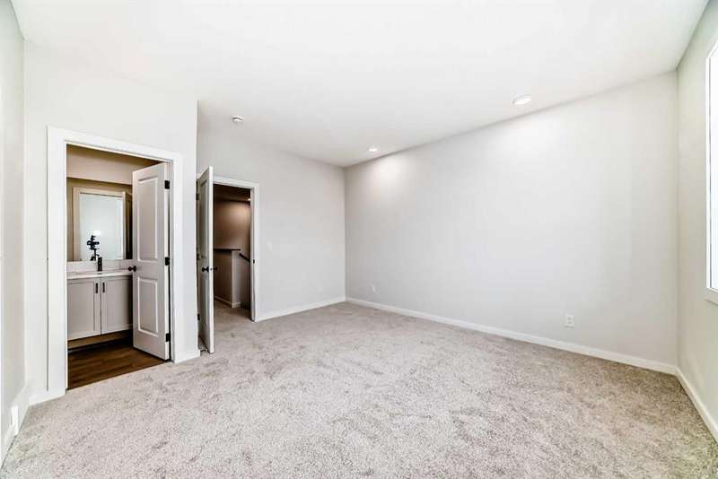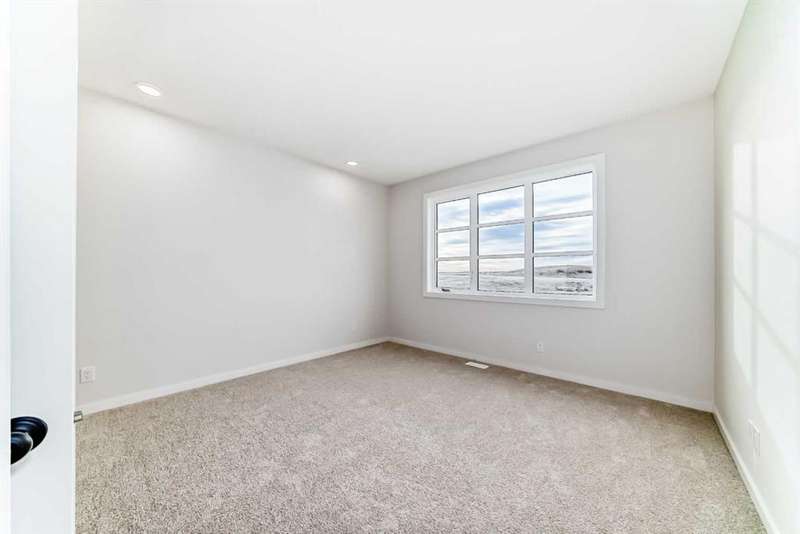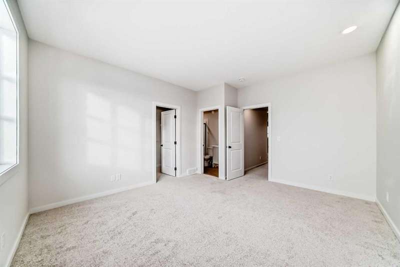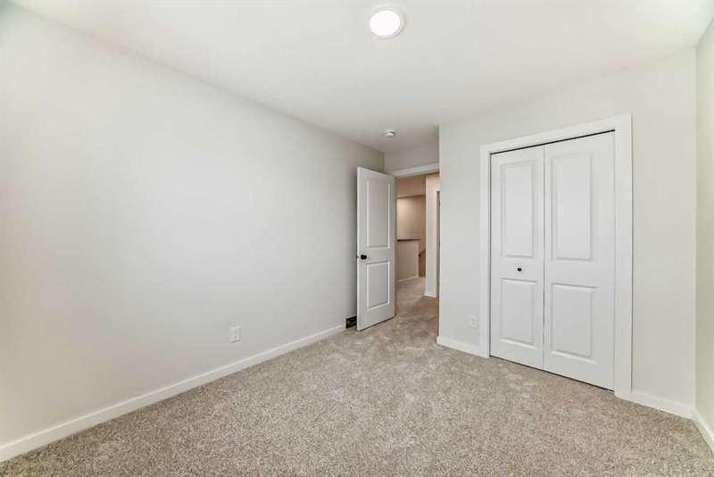 INVEST IN YOUR FUTURE WITH NO CONDO FEES, no yard work to inherit, and no waiting for the right townhome to appear—this one is already taking shape. BUILT BY HOMES BY AVI - this model puts everyday function first, without sacrificing light, flow, or storage. As the END UNIT in a four-plex, it enjoys extra windows and a quieter side wall while keeping all the efficiencies of shared living. The covered FULL-WIDTH FRONT PORCH opens to a bright main floor that moves naturally from front lounge to dining to kitchen—each space distinct but connected. The kitchen’s LARGE QUARTZ ISLAND anchors the room, surrounded by clean-lined cabinetry, 42-INCH UPPERS, and a pantry that’s more “walk-in closet for snacks” than cupboard. Stainless appliances include a CHIMNEY-STYLE HOOD FAN, BUILT-IN MICROWAVE, and upgraded refrigerator, with a gas line rough-in ready if you ever trade the included electric range for flame. Upstairs, the layout solves the daily choreography of family life: a central laundry room, two secondary bedrooms that make smart use of their space, and a well-separated primary retreat with a TILE-AND-GLASS SHOWER ensuite plus generous closet storage. The unfinished basement adds room to grow—storage today, gym or hobby space tomorrow—and the rear entry opens to a double parking pad, prepped for future garage potential. Belmont keeps you close to what matters without the sprawl: NEW PARKS AND PLAYGROUNDS ALREADY IN PLACE, the future library and field house on the way, and quick access to both Macleod Trail and the Ring Road. Whether you’re stepping out for coffee or staying in for a quiet weekend, the balance here just works—modern, manageable, and ready for the kind of ownership that doesn’t come with monthly fees. Come see how naturally this one fits. • PLEASE NOTE: Photos are of a DIFFERENT Spec Home of the same model – fit and finish may differ. Interior selections and floorplans shown in photos.