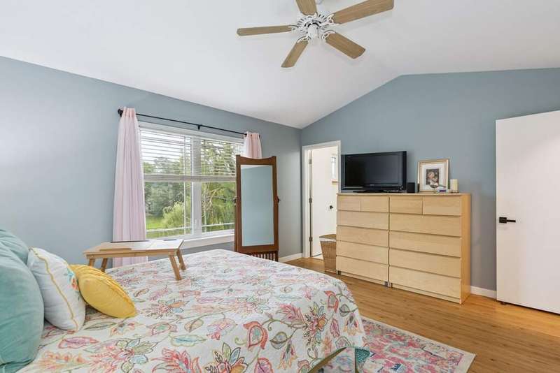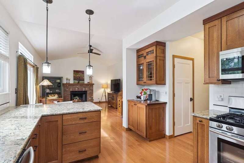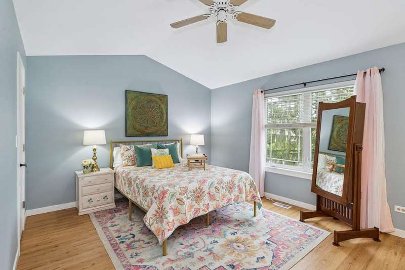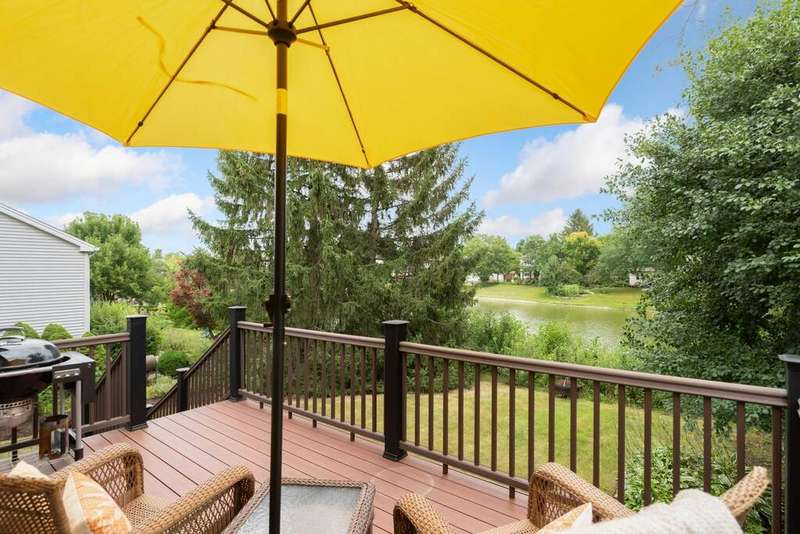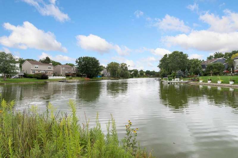WATER FRONT LOT in College Trails! Rarely available, this stunning home is one of just a handful that backs to the community's tranquil pond with it's natural landscaping; offering year-round views of wildlife, serene beauty and water activities like fishing, paddle boats, kayaks and ice skating. Lovingly maintained by the original owner, the exterior was completely re-styled in 2011 with stone accents, updated siding, and Prairie-style windows/sliders to complement its unique surroundings. Step inside to find a thoughtfully reimagined first floor (2013) featuring a reconfigured kitchen with high-quality, custom solid wood two-tier cabinetry (upper cabinets with glass fronts and lighting to showcase your finest pieces), Cambria quartz countertops, subway tile backsplash, and all stainless steel appliances (microwave replaced this month). The powder room was also updated, and solid-core doors with upgraded hardware were added throughout. The striking Mission-style ThermaTru front door makes a bold statement upon entry. The open-concept layout seamlessly connects the kitchen, dining, and family room with wood-burning fireplace-perfect for cozy fall evenings. Just off the family room, step out to the expansive TimberTech composite deck (2012) where you'll enjoy the sunrise over the water, while sunsets can be savored from the charming front porch. Upstairs, the primary suite offers a private ensuite bath, along with two additional bedrooms and a full hall bath. The full English basement is bright with natural light, framed with canned lighting and drywalled-ready for your finishing touch. College Trails offers unmatched convenience and lifestyle-just 5 minutes from historic downtown Grayslake's shops, cafes, farmer's market, and festivals, and only a few miles to 3 Metra stations. Outdoor lovers will appreciate nearby Rollins Savannah Forest Preserve with 53 acres of trails for hiking and biking, as well as College Trail Park with tennis, basketball, fishing, playground, and even ice skating in winter. Don't miss this rare opportunity to own a beautifully updated home in an extraordinary setting!