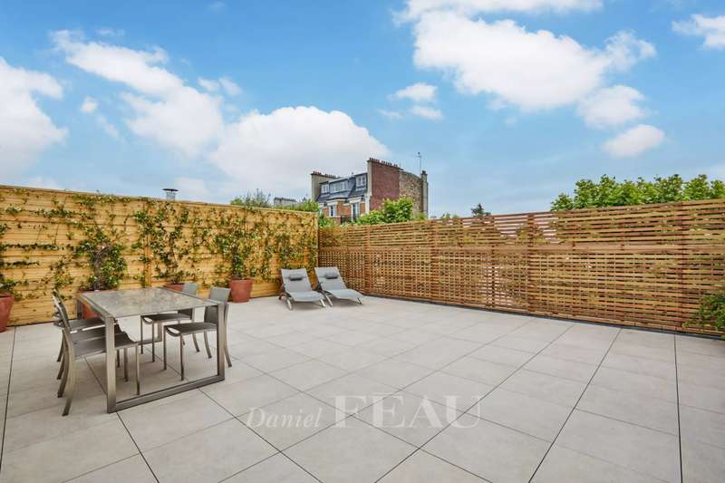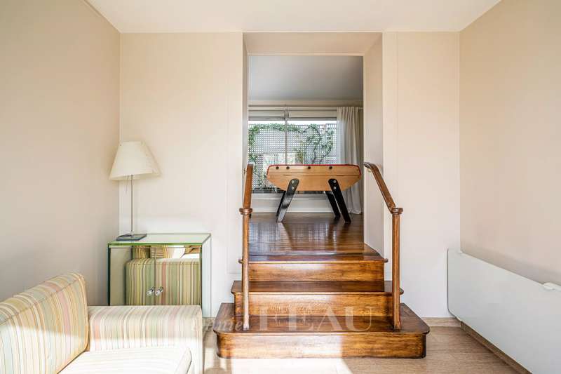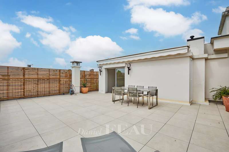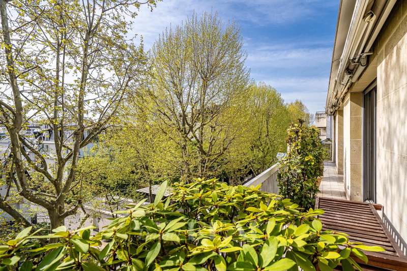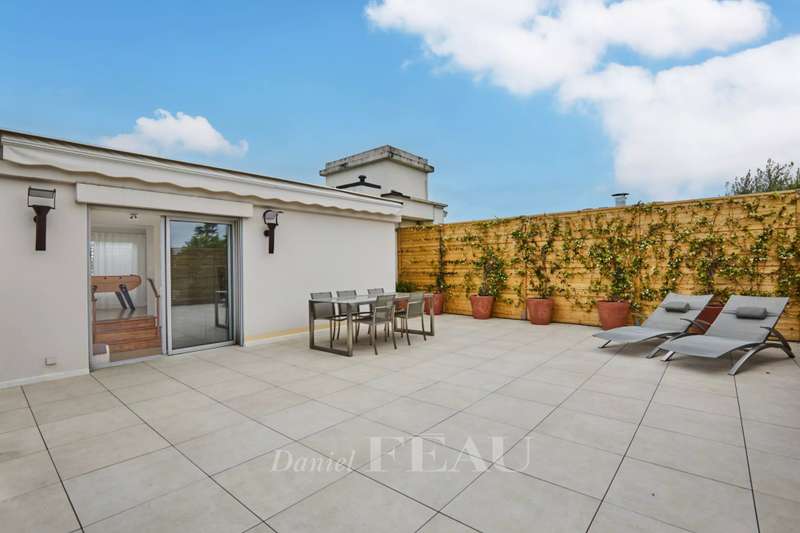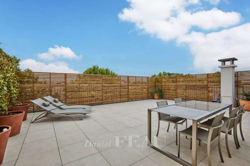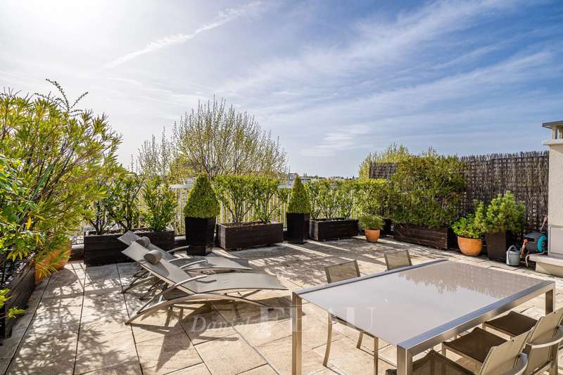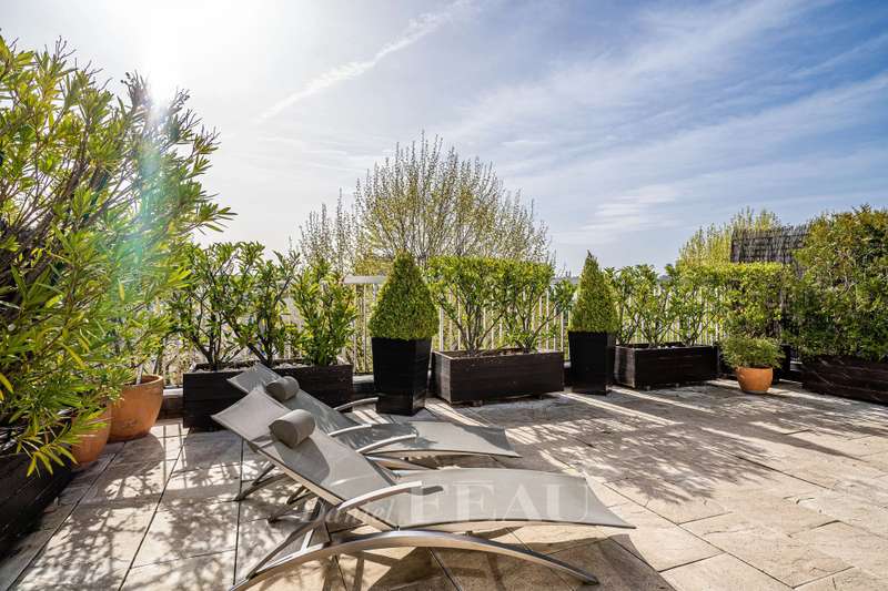 Rue de Chézy. This bright 195 sqm apartment on the 4th and 5th floors of a relatively recent building is in mint condition. It includes a 46.60 sqm living/reception room, a fitted and equipped 15 sqm kitchen, four spacious bedrooms with fitted cupboards, a bathroom, two shower rooms and two separate wc. The lower floor opens onto a continuous balcony, and the fifth floor boasts a superb 70 sqm terrace benefiting from no facing neighbours. With a double basement parking space and a cellar. Ample fitted storage space.