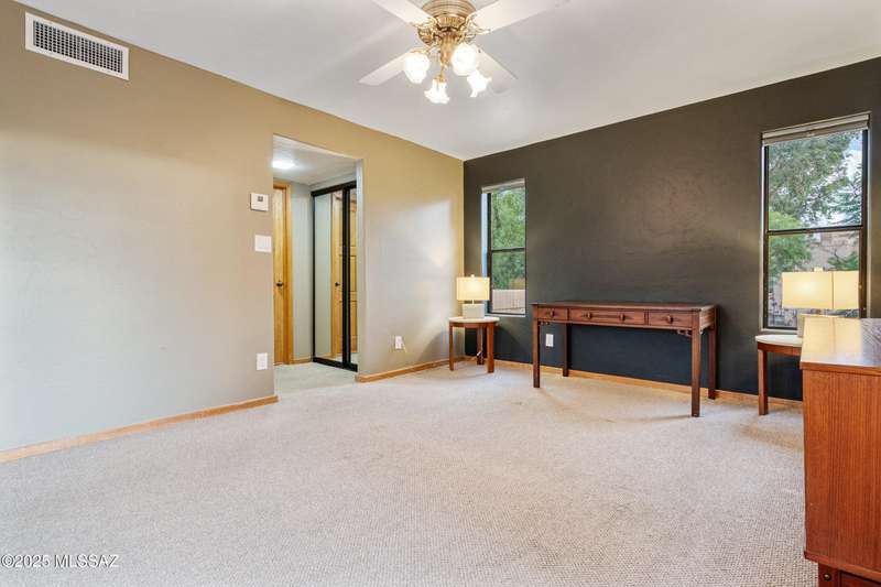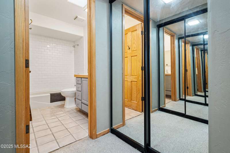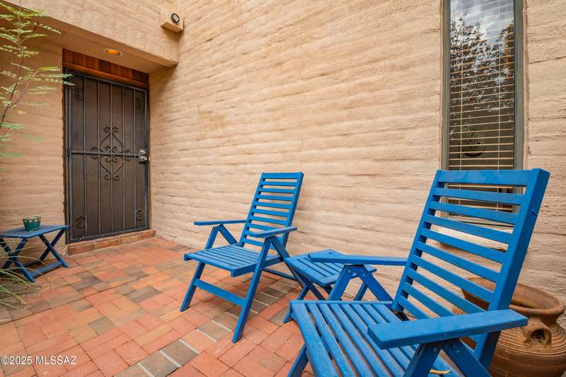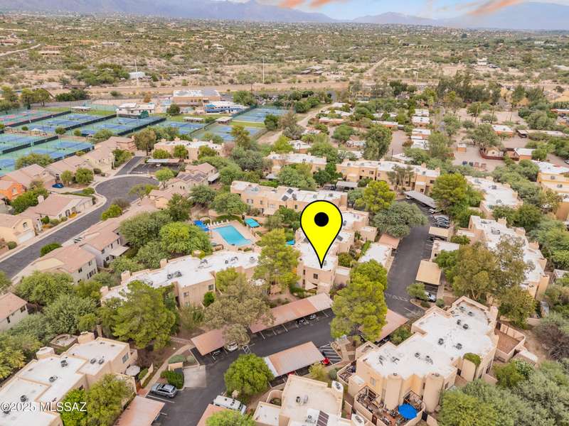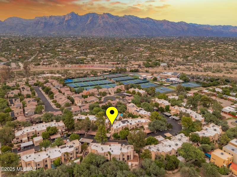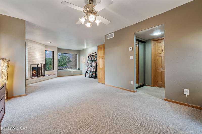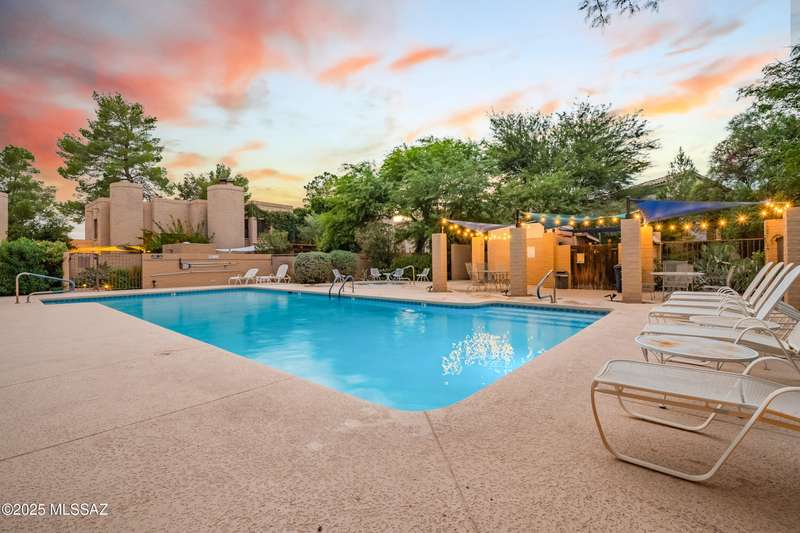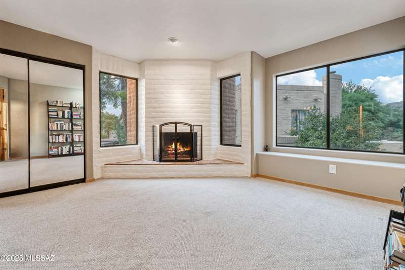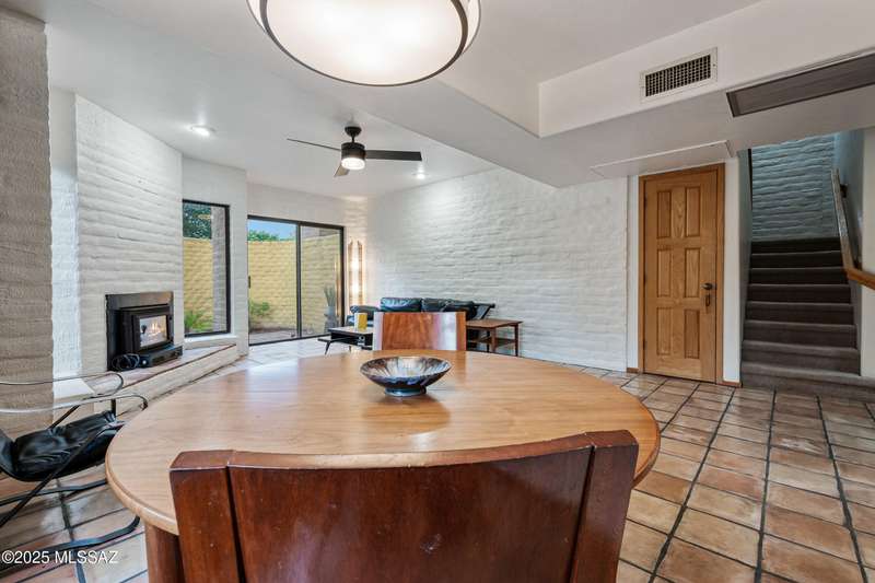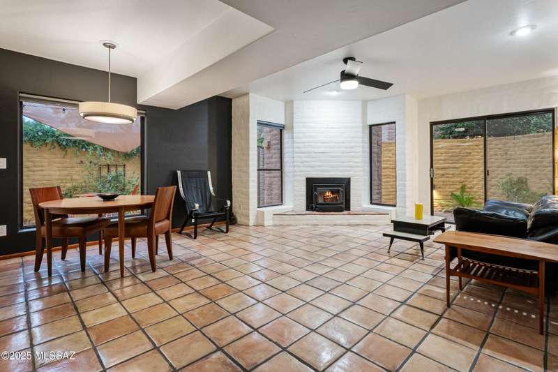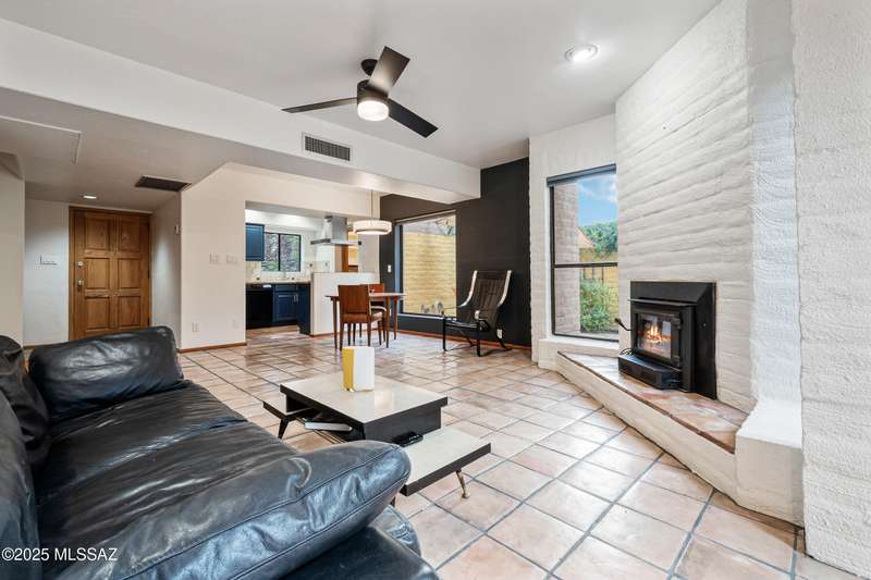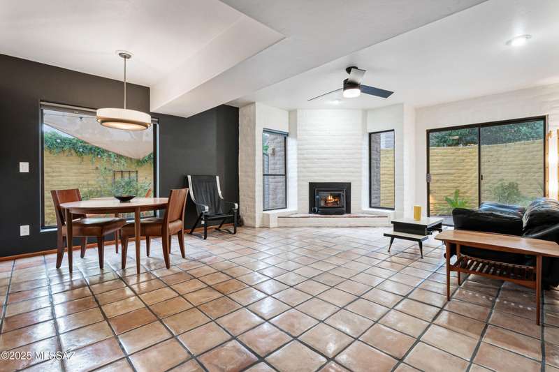 Spacious and bright 2-bed/2-bath end-unit townhome in the desirable Tamarisk community. The main level features Saltillo tile, a welcoming great room with a cozy electric fireplace, abundant natural light, and access to a peaceful private patio. Upstairs, the oversized primary suite offers three closets, a wood-burning fireplace, ample windows, and a gorgeous view of the Catalina Mountains. Updates include a new range hood, interior paint, termite treatment (2024), newer water heater (2023), and a recently coated roof, still under warranty. The sparkling community pool and spa are just a short walk through a tranquil, beautifully landscaped common area. Steps from Rio Vista Park, Tucson Racquet Club, and The Loop, a 130+ mile multi-use path named #1 Bike Path in America by USA Today.