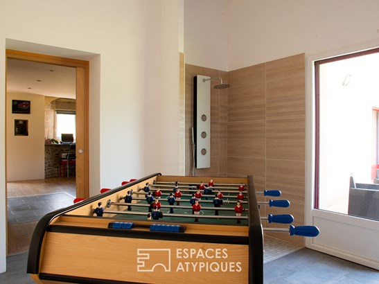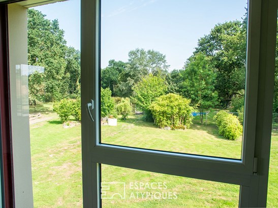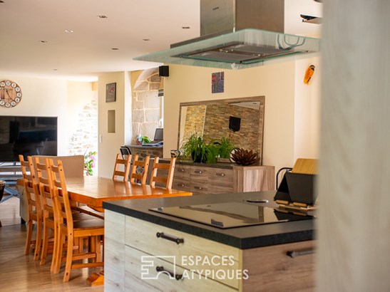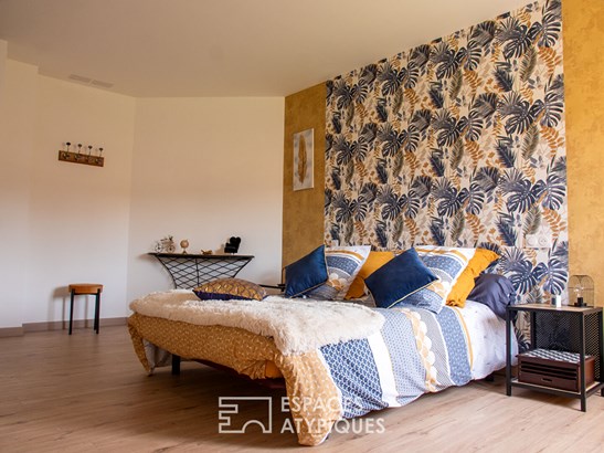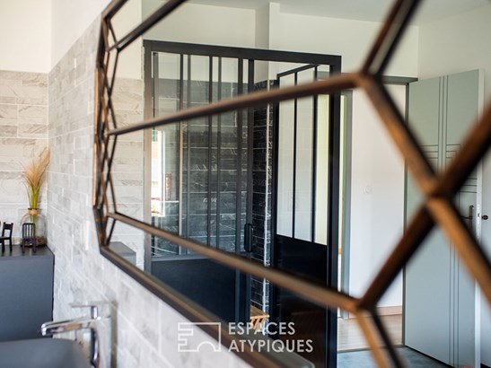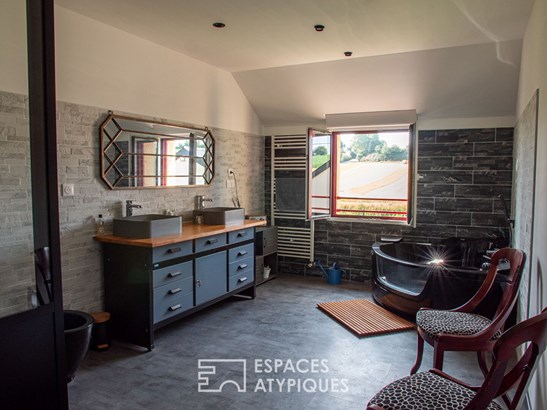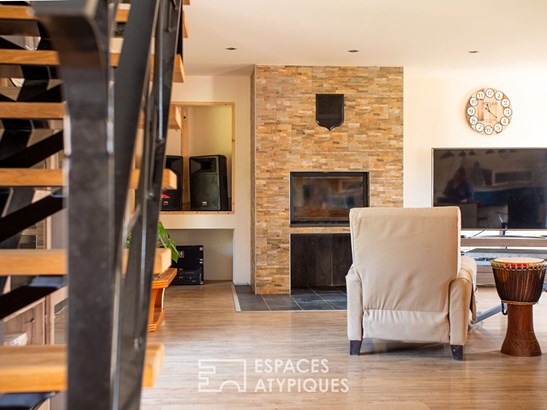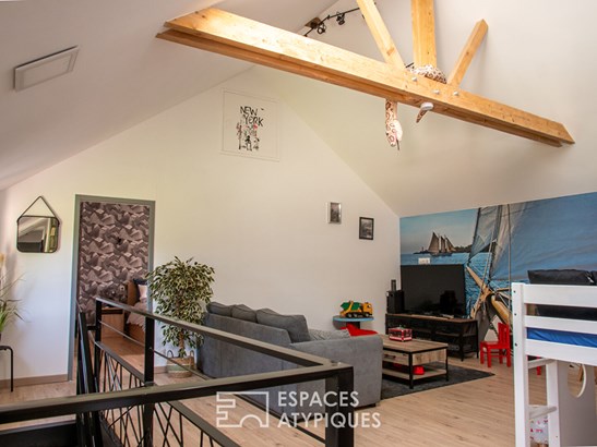 Upstairs, the mezzanine and its exposed framework give it a warm character and accentuate the feeling of space present in this house. The three additional large bedrooms are perfect for welcoming family and friends, while the music room is a plus for sound enthusiasts. Finally, the industrial-style bathroom adds a contemporary and original touch to the whole.