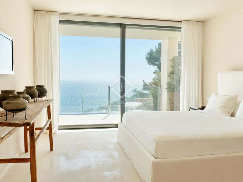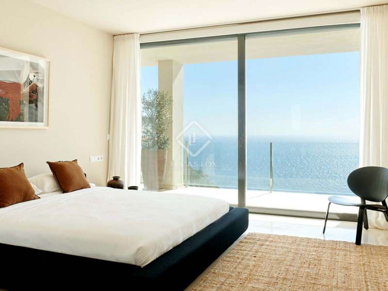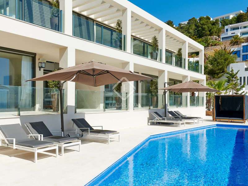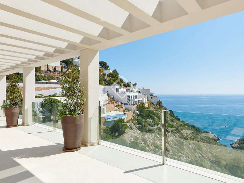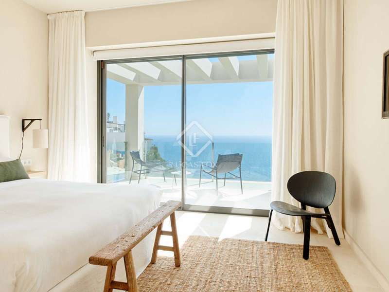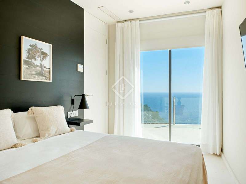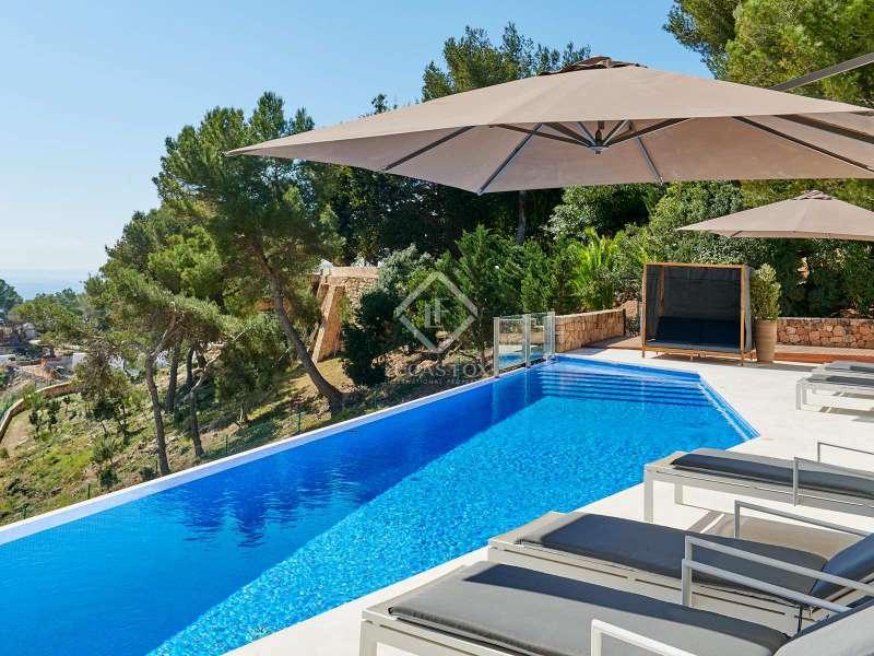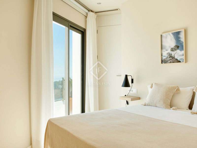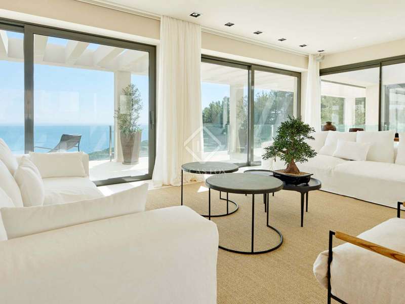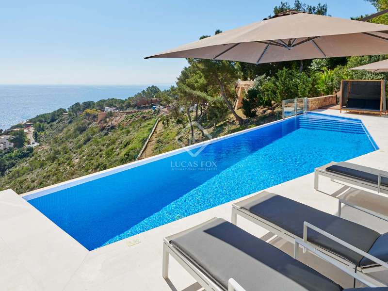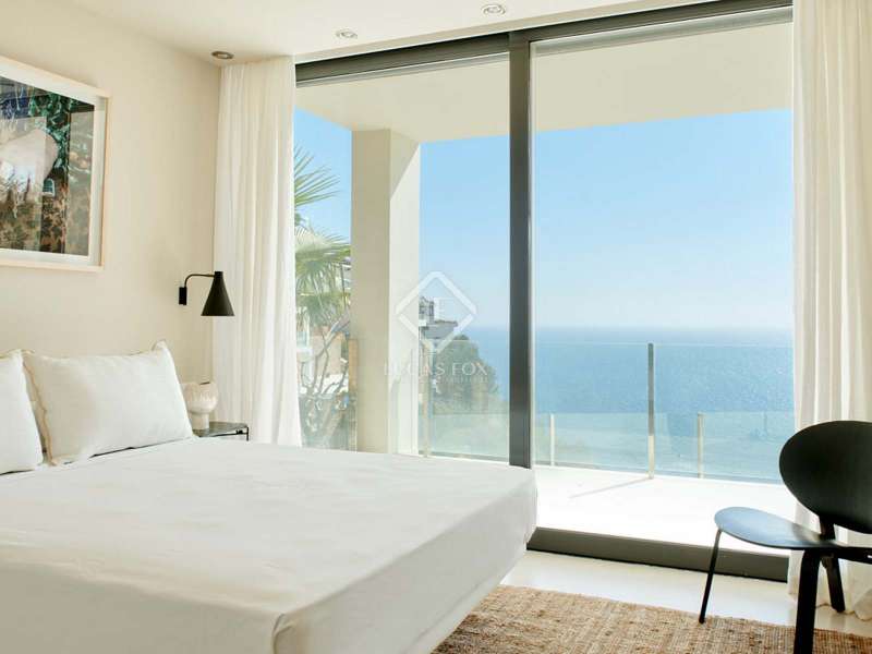 This lovely recently refurbished villa, situated in a pleasant private neighbourhood enjoys spectacular seaviews as well as posessing a tourist licence making it an interesting investment. We enter the property from street level where there is space to park a couple of cars. Steps or a lift lead us down to a pretty courtyard with garden and planting to the left. The front door takes us into a large and light filled open plan living space with a wall of glass floor to ceiling sliding doors which open onto a long partially covered terrace offering some protection from the sun. A light filled glass atrium seperates the dining area from the living room. We can access the kitchen directly from the dining area or to the right of the main entrance. The kitchen with Siemens appliances and induction hob opens up to a generous side terrace with seaviews as an alternative al fresco dining space. There is also a utility space at the back of the kitchen as well as a toilet. The other end of the living area we find a large double bedroom with ensuite bathroom including a bathtub and a walk in wardrobe. The stairs lead us down to the next floor where we find 2 large double bedrooms with ensuite bathrooms as well as the master suite. All bedrooms enjoy beautiful seaviews and access to the terrace. The terrace at this level has a lovely shady dining area with space for 16 diners. A couple of steps lead us to the pool level. Below the pool we find a further 2 double bedrooms with ensuite bathrooms and a shared small living room. This attractive contemporary villa with it's tasteful and minimal decor would make a perfect family home as well as a fantastic second home with the possibility of renting it out when not being used.