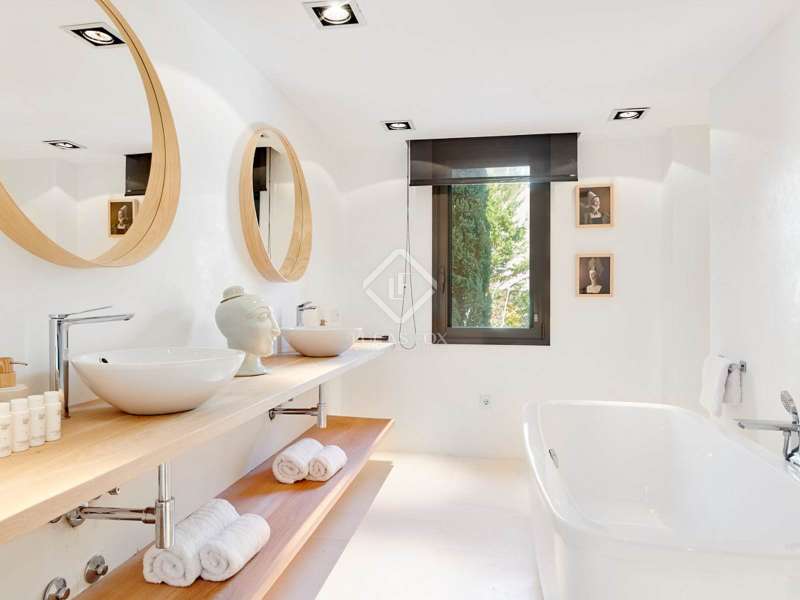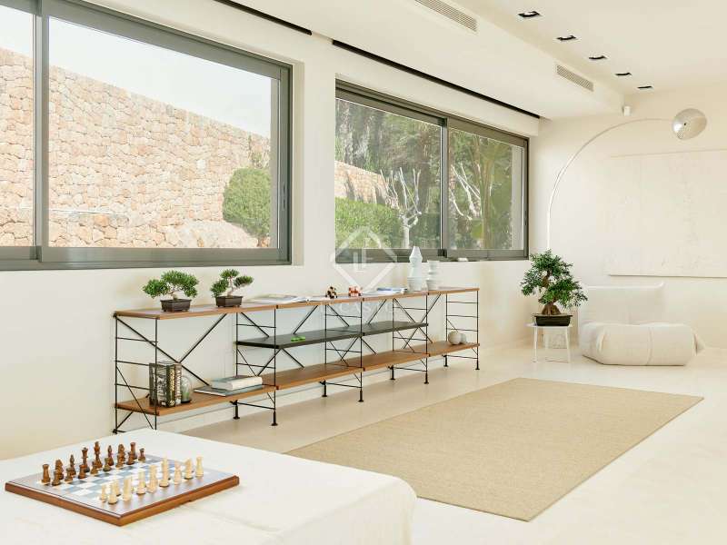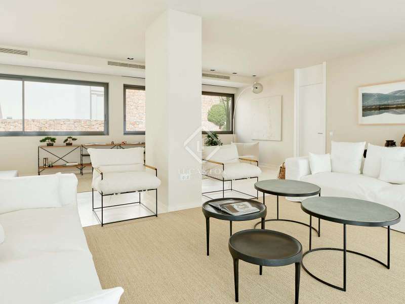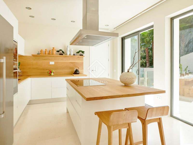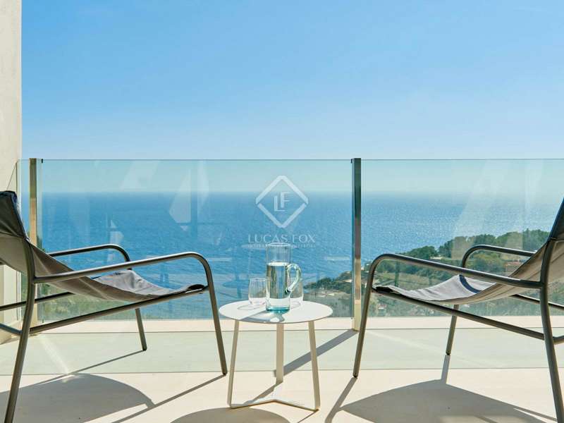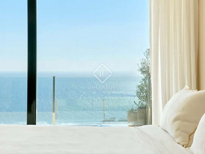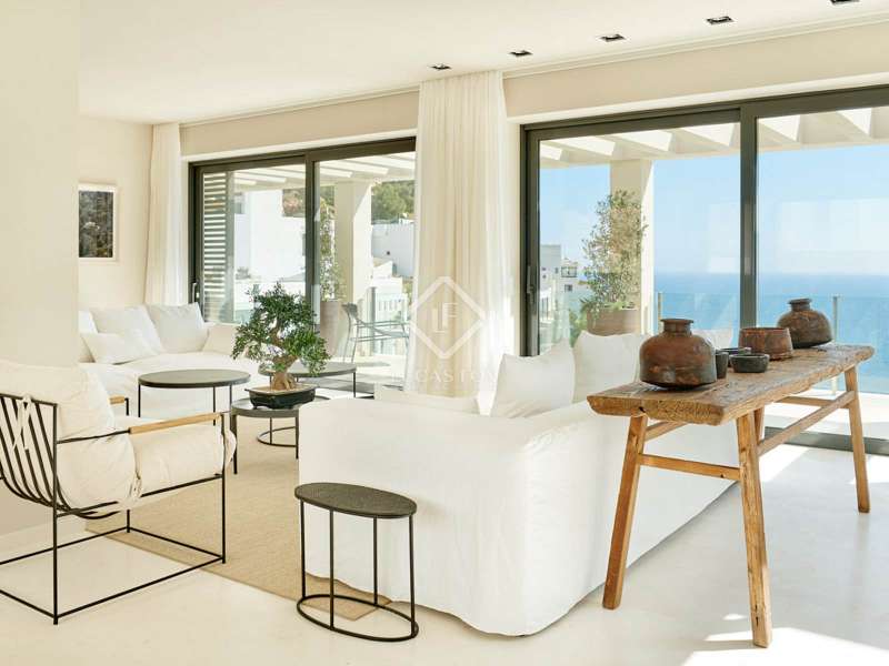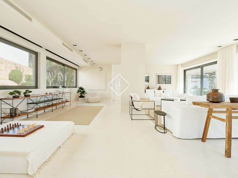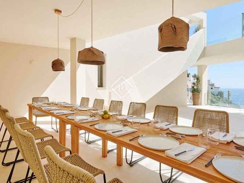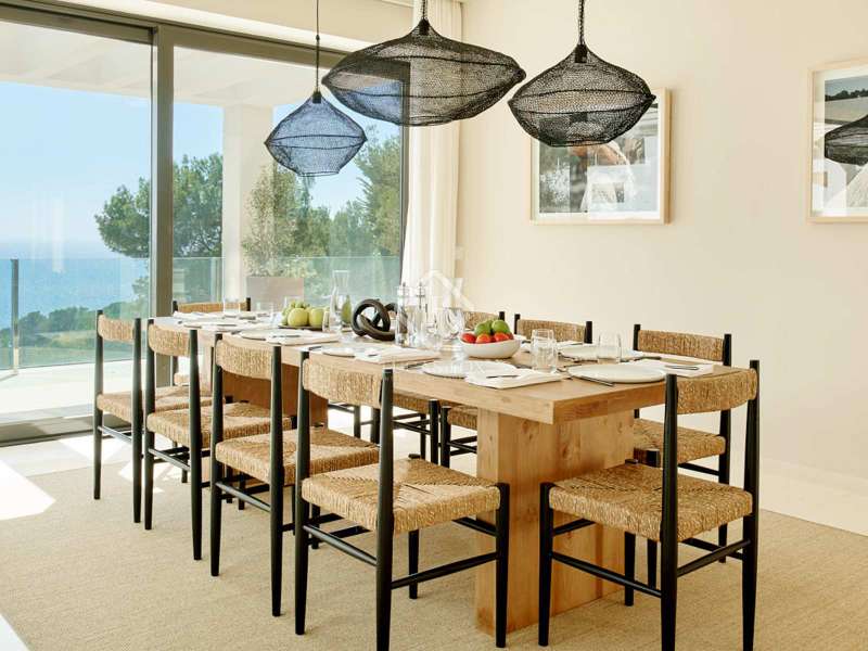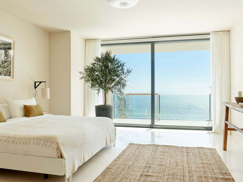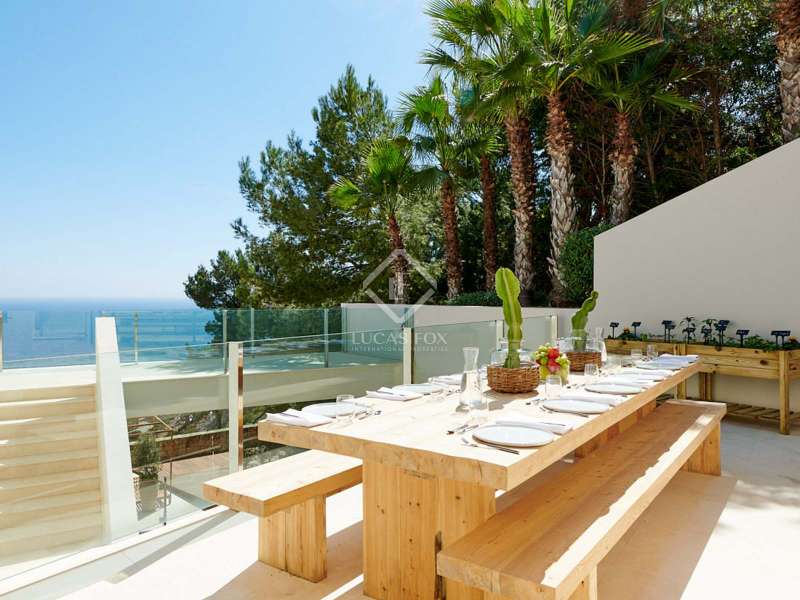 This lovely recently refurbished villa, situated in a pleasant private neighbourhood enjoys spectacular seaviews as well as posessing a tourist licence making it an interesting investment. We enter the property from street level where there is space to park a couple of cars. Steps or a lift lead us down to a pretty courtyard with garden and planting to the left. The front door takes us into a large and light filled open plan living space with a wall of glass floor to ceiling sliding doors which open onto a long partially covered terrace offering some protection from the sun. A light filled glass atrium seperates the dining area from the living room. We can access the kitchen directly from the dining area or to the right of the main entrance. The kitchen with Siemens appliances and induction hob opens up to a generous side terrace with seaviews as an alternative al fresco dining space. There is also a utility space at the back of the kitchen as well as a toilet. The other end of the living area we find a large double bedroom with ensuite bathroom including a bathtub and a walk in wardrobe. The stairs lead us down to the next floor where we find 2 large double bedrooms with ensuite bathrooms as well as the master suite. All bedrooms enjoy beautiful seaviews and access to the terrace. The terrace at this level has a lovely shady dining area with space for 16 diners. A couple of steps lead us to the pool level. Below the pool we find a further 2 double bedrooms with ensuite bathrooms and a shared small living room. This attractive contemporary villa with it's tasteful and minimal decor would make a perfect family home as well as a fantastic second home with the possibility of renting it out when not being used.