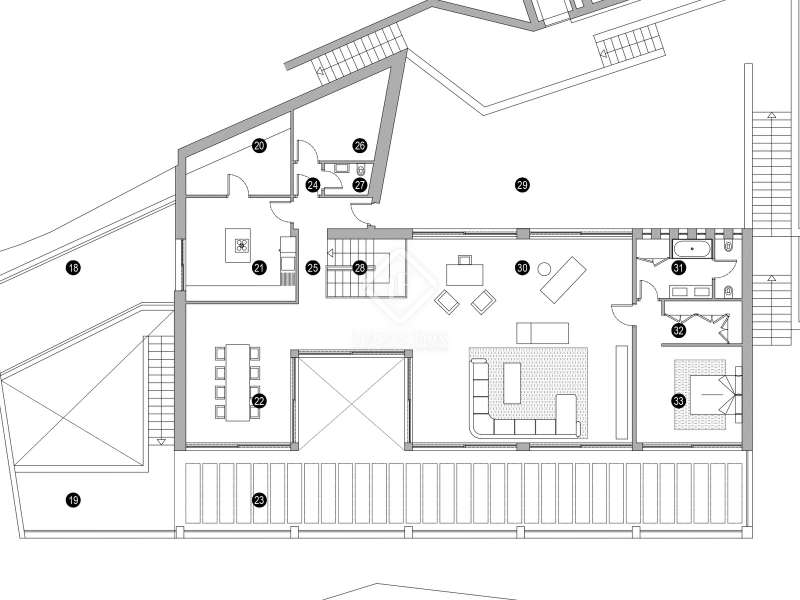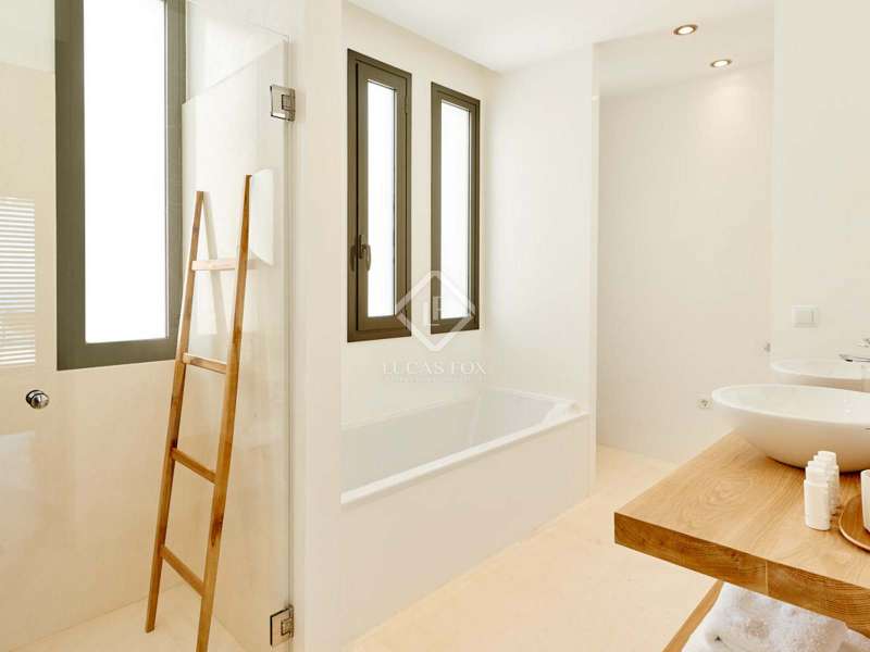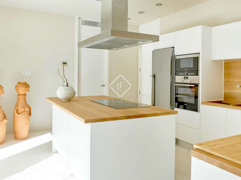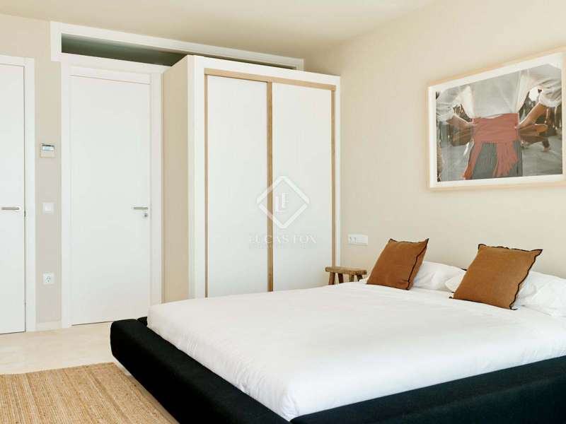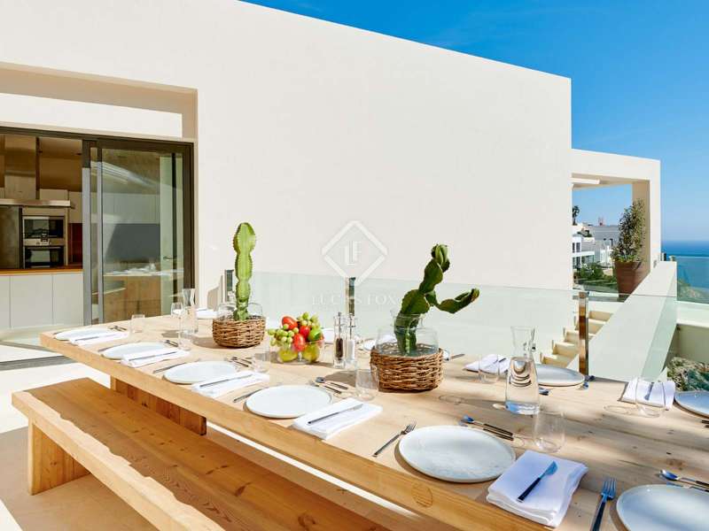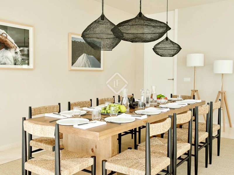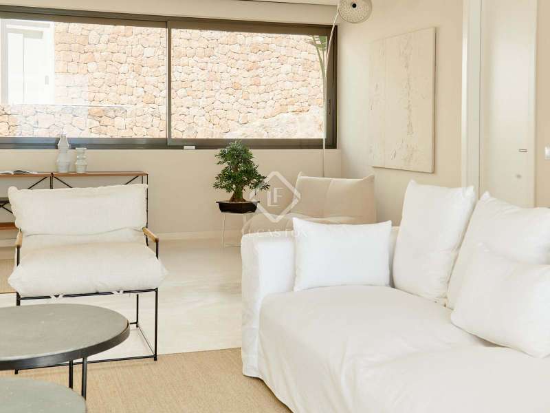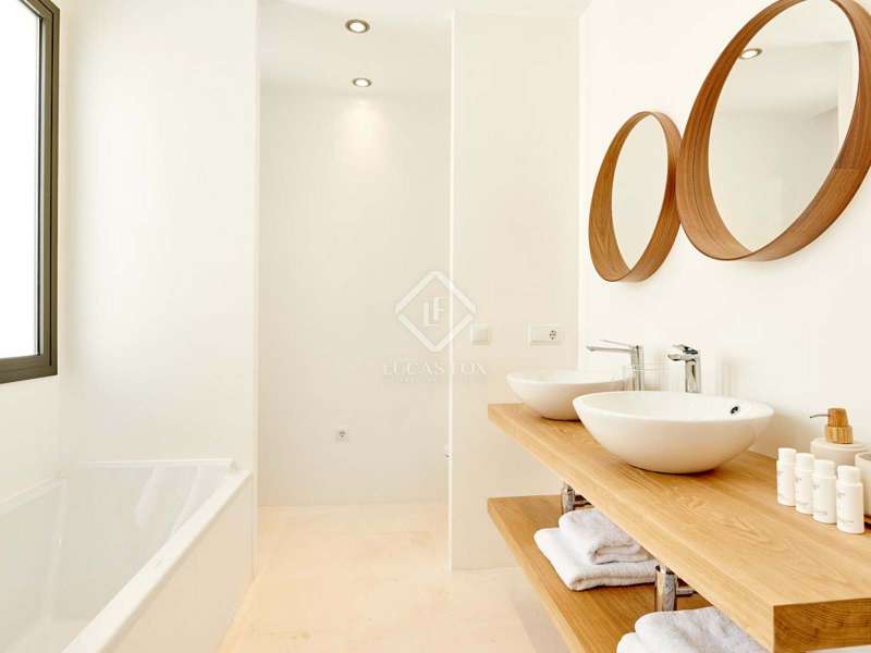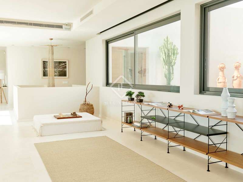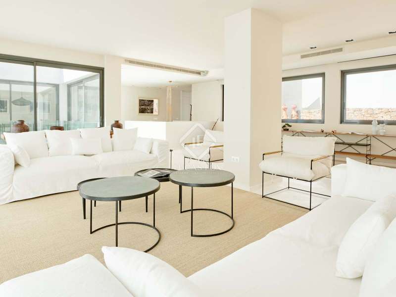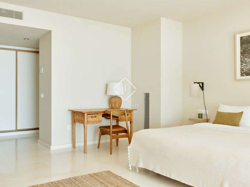 This lovely recently refurbished villa, situated in a pleasant private neighbourhood enjoys spectacular seaviews as well as posessing a tourist licence making it an interesting investment. We enter the property from street level where there is space to park a couple of cars. Steps or a lift lead us down to a pretty courtyard with garden and planting to the left. The front door takes us into a large and light filled open plan living space with a wall of glass floor to ceiling sliding doors which open onto a long partially covered terrace offering some protection from the sun. A light filled glass atrium seperates the dining area from the living room. We can access the kitchen directly from the dining area or to the right of the main entrance. The kitchen with Siemens appliances and induction hob opens up to a generous side terrace with seaviews as an alternative al fresco dining space. There is also a utility space at the back of the kitchen as well as a toilet. The other end of the living area we find a large double bedroom with ensuite bathroom including a bathtub and a walk in wardrobe. The stairs lead us down to the next floor where we find 2 large double bedrooms with ensuite bathrooms as well as the master suite. All bedrooms enjoy beautiful seaviews and access to the terrace. The terrace at this level has a lovely shady dining area with space for 16 diners. A couple of steps lead us to the pool level. Below the pool we find a further 2 double bedrooms with ensuite bathrooms and a shared small living room. This attractive contemporary villa with it's tasteful and minimal decor would make a perfect family home as well as a fantastic second home with the possibility of renting it out when not being used.