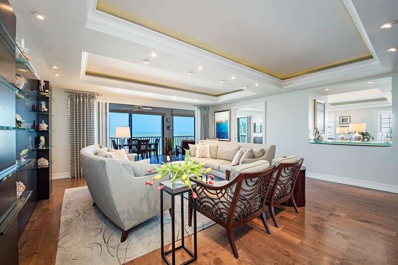 Soothing Surf & Sweeping views of the Gulf! Lots of sun and sand from this spectacular beachfront end unit! Well-designed, award winning floorplan offering spacious formal and casual living areas plus glassed and screened lanai with Nana doors and remote blinds. Open island kitchen with exotic granite, Thermadore and Kitchenaid appliances including induction cooktop and free-standing icemaker. Foyer entry with marble floors, art niche and powder room with abalone insets. Formal living and dining area with feature wall and beach view. Spacious guest bedrooms offering en-suite bathrooms with beautiful accent tile, one with Eastern balcony. Extensive lighting system throughout, TV's and audio equipment included. Low-density building of 16 units, with new roof in and freshly painted in 2025, new rooftop generator coming soon. All assessments paid! Enjoy under building parking, extra storage, pool, exercise room, beachfront seating area and on-site manager.