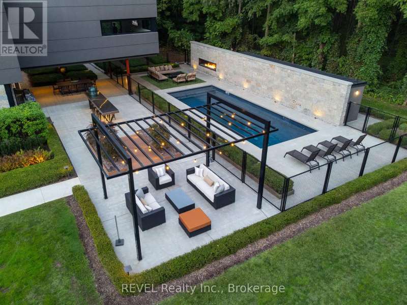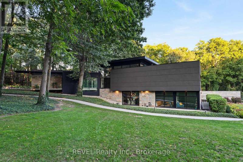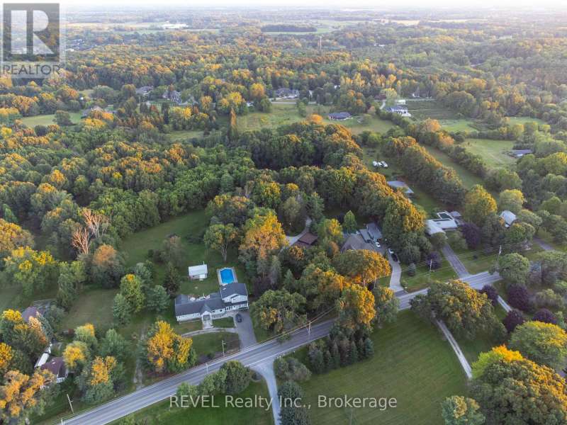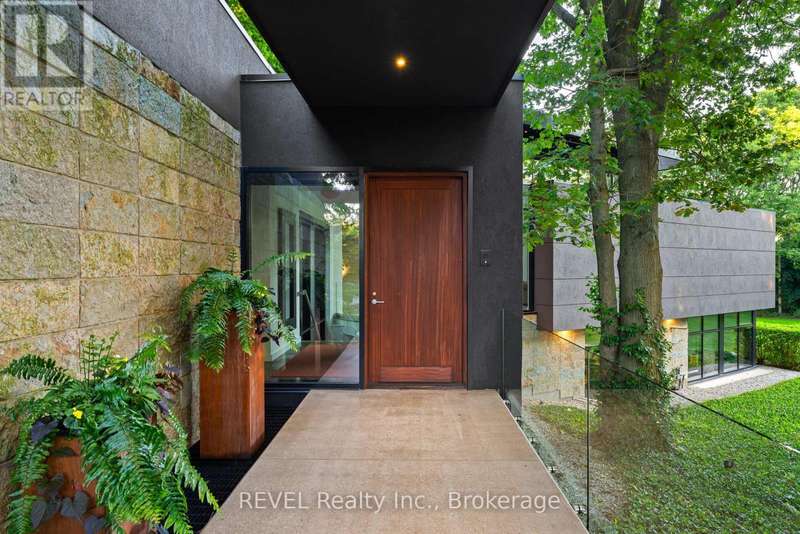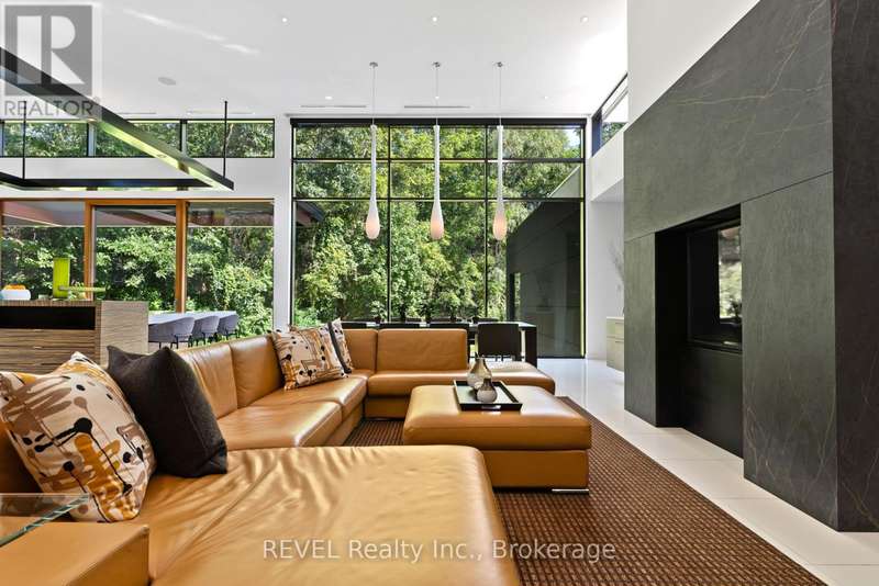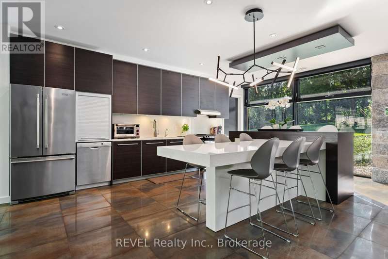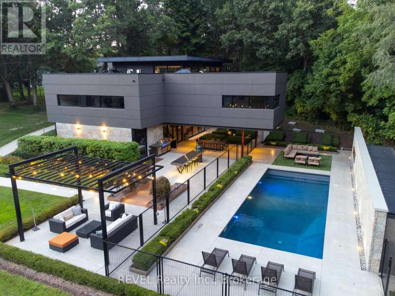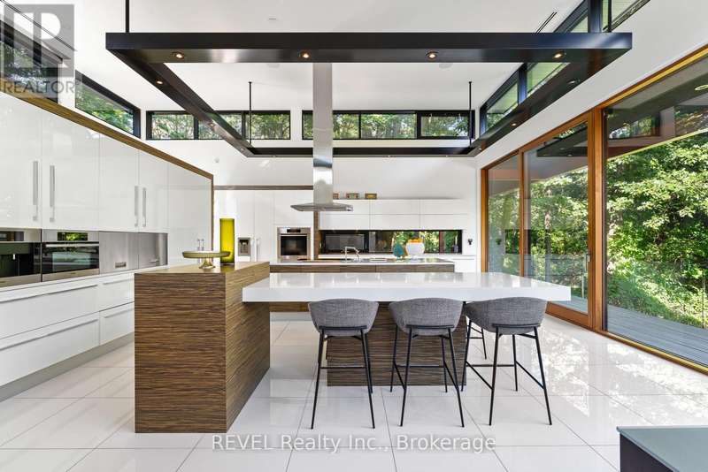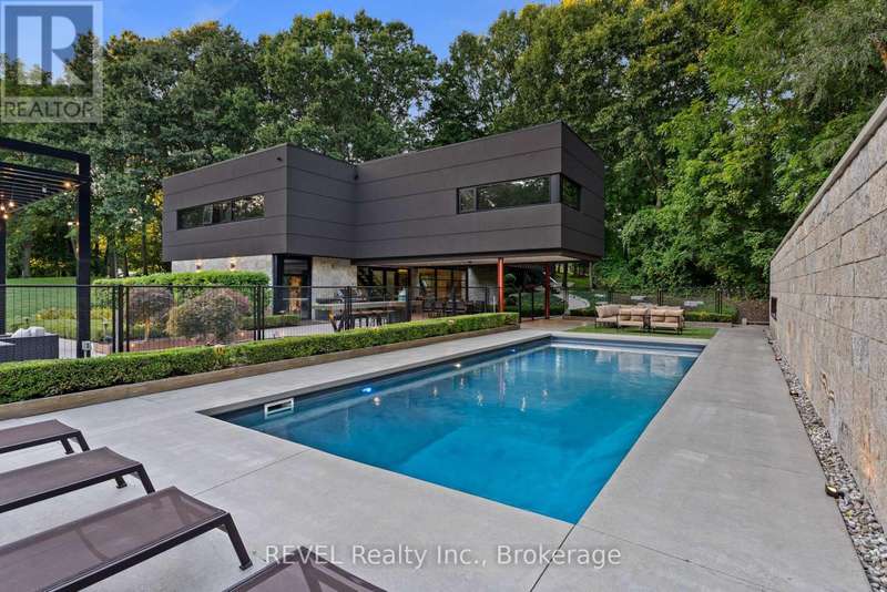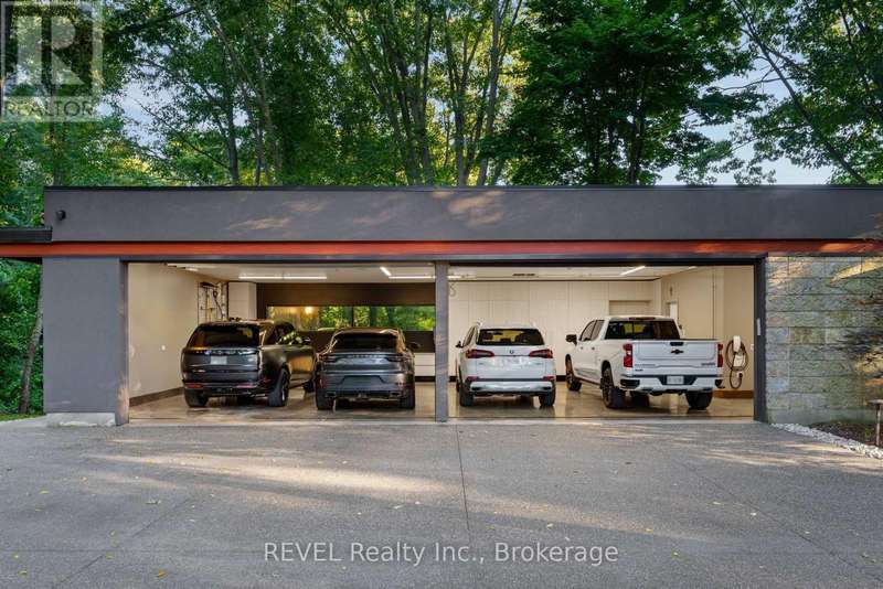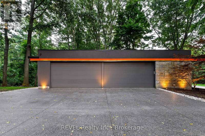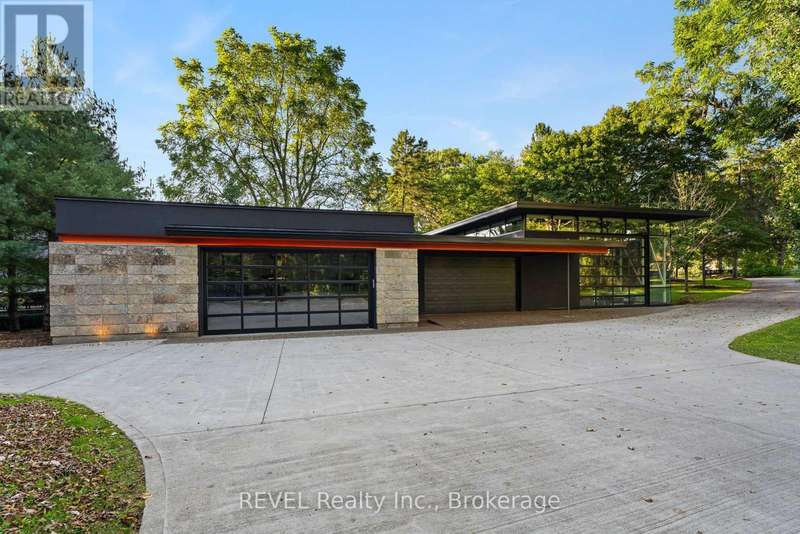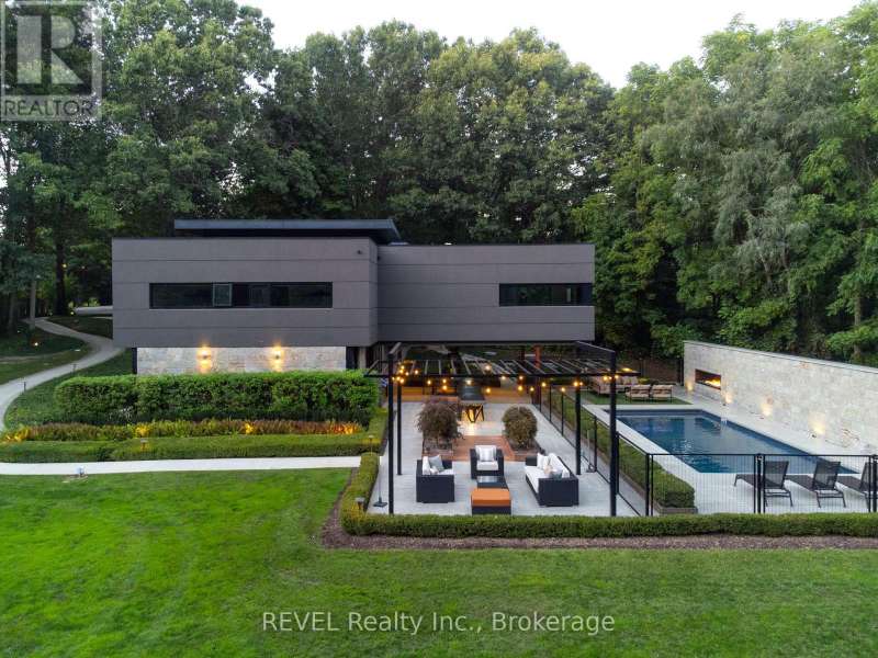Architectural majesty and artistic risk define luxury for this modern bungalow estate in the charming township of Fonthill. Emerging from a 2.9 acre property populated by picturesque, Carolinian trees, this modernly unique one story creation with full walkout and floor to ceiling curtain wall windows, fuses a designer eye with an environmentalist's appreciation for natural integration. Structured with steel frame construction, and offering in floor heating via boiler and concrete floors on both main and lower levels, this mansions elite finishes, set against the views of forested privacy, present pleasurable pastoral perspectives and authentic tranquility, inside and out. Features include 16' ceilings in main living area; specialty imported glass porcelain tiles; engineered hardwood; fully automated light and sound systems by Crestron Products; surround sound theater area with power drop down screen; wine and artisanal meat cellar; enormous upper and lower designer kitchens with quartz stone countertops; three plus one spacious bedrooms; main floor glass walled office; master ensuite with oversized shower; and customized built ins throughout for exceptional storage capacity. The sauntering transition to resort worthy outdoor amenities is just as dazzling, with walkouts that seamlessly flow into a heated saltwater pool area with feature stone wall, outdoor gas fireplace, cedar clad washroom and change rooms. For the luxury car enthusiast, and with 400 amp electrical service available, enjoy the recently built 2600sq.ft showcase accessory garage(detached) that complements an oversized four car garage attached to the home. With approximately 5400 sq. ft of fully finished and fully serviced living space conceptualized to exploit every possible vantage point of this incredible landscape, this estate sets a new standard as the epitome of luxury listings. (id:7434)