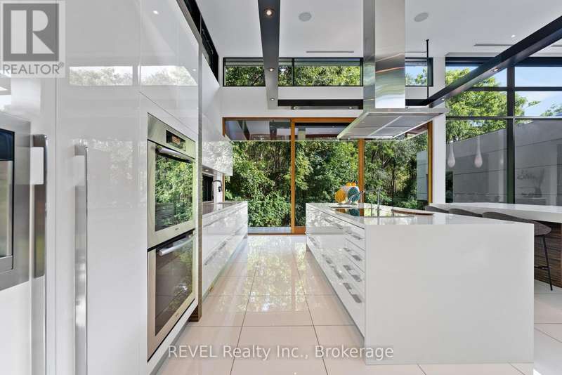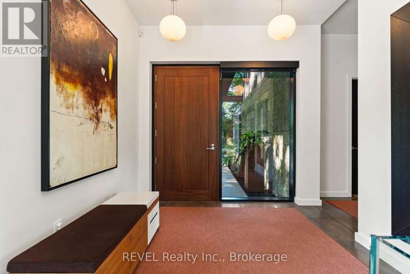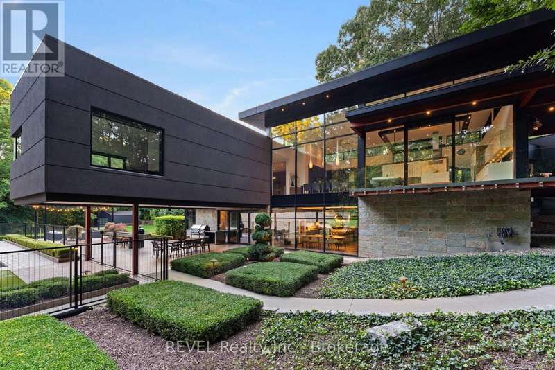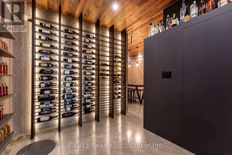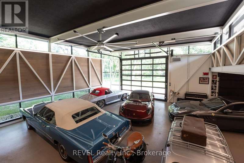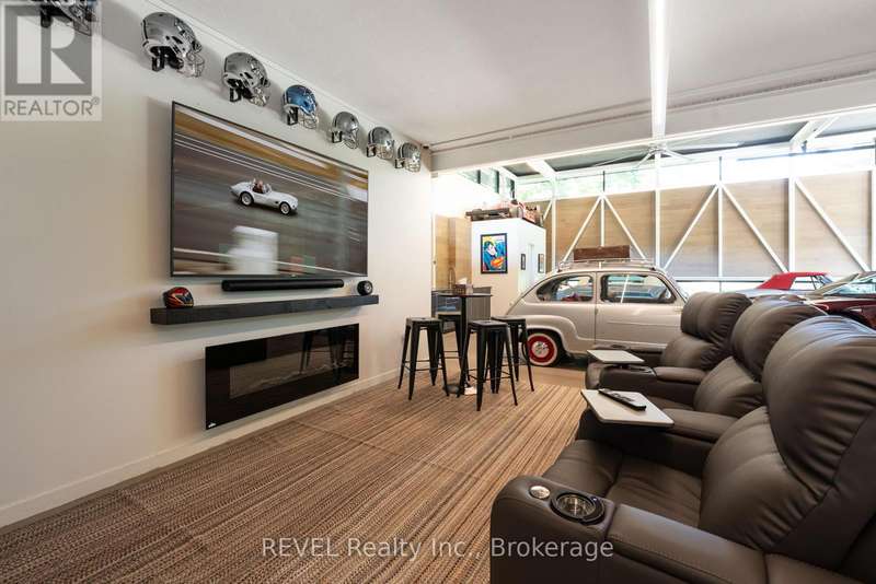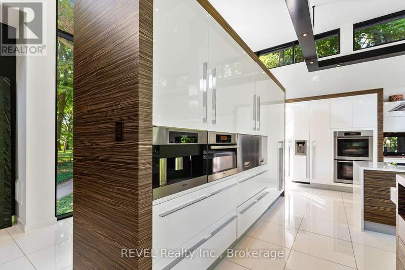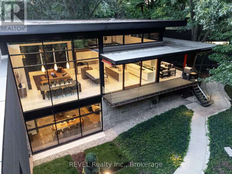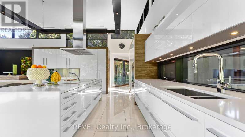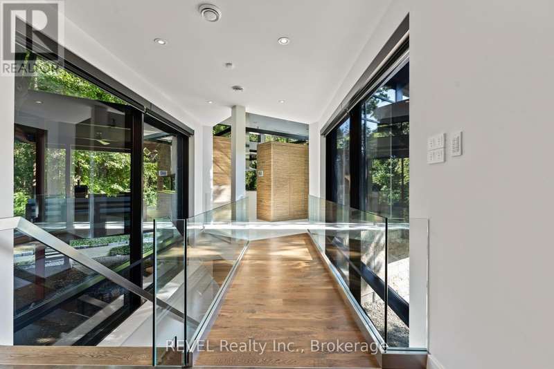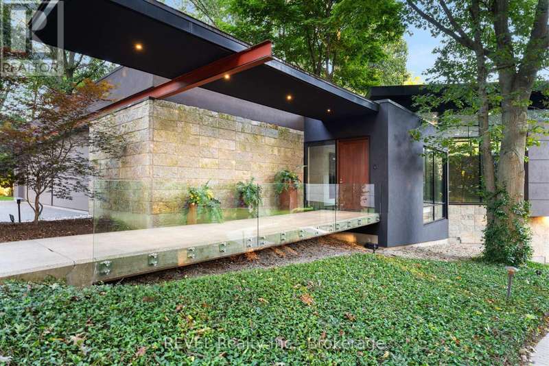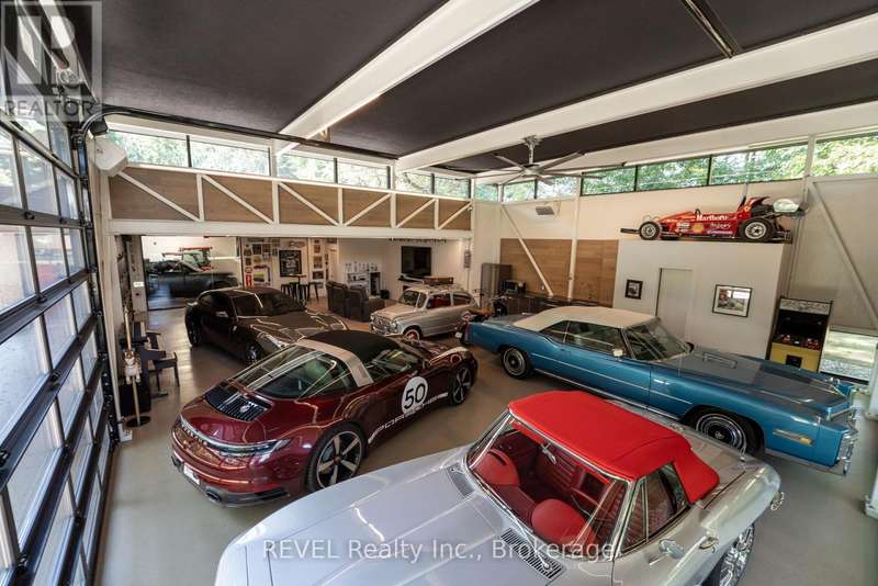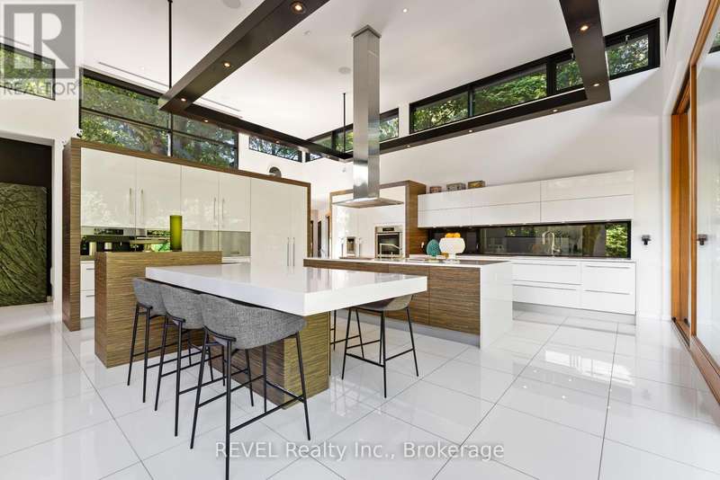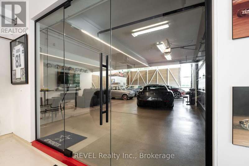 Architectural majesty and artistic risk define luxury for this modern bungalow estate in the charming township of Fonthill. Emerging from a 2.9 acre property populated by picturesque, Carolinian trees, this modernly unique one story creation with full walkout and floor to ceiling curtain wall windows, fuses a designer eye with an environmentalist's appreciation for natural integration. Structured with steel frame construction, and offering in floor heating via boiler and concrete floors on both main and lower levels, this mansions elite finishes, set against the views of forested privacy, present pleasurable pastoral perspectives and authentic tranquility, inside and out. Features include 16' ceilings in main living area; specialty imported glass porcelain tiles; engineered hardwood; fully automated light and sound systems by Crestron Products; surround sound theater area with power drop down screen; wine and artisanal meat cellar; enormous upper and lower designer kitchens with quartz stone countertops; three plus one spacious bedrooms; main floor glass walled office; master ensuite with oversized shower; and customized built ins throughout for exceptional storage capacity. The sauntering transition to resort worthy outdoor amenities is just as dazzling, with walkouts that seamlessly flow into a heated saltwater pool area with feature stone wall, outdoor gas fireplace, cedar clad washroom and change rooms. For the luxury car enthusiast, and with 400 amp electrical service available, enjoy the recently built 2600sq.ft showcase accessory garage(detached) that complements an oversized four car garage attached to the home. With approximately 5400 sq. ft of fully finished and fully serviced living space conceptualized to exploit every possible vantage point of this incredible landscape, this estate sets a new standard as the epitome of luxury listings. (id:7434)