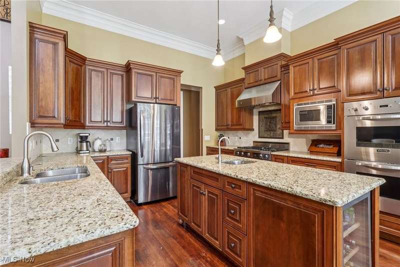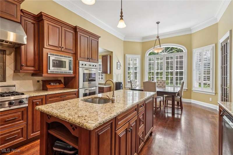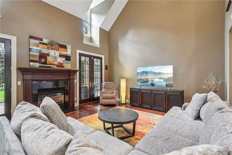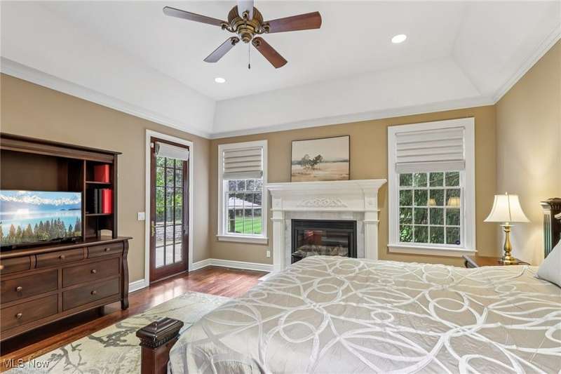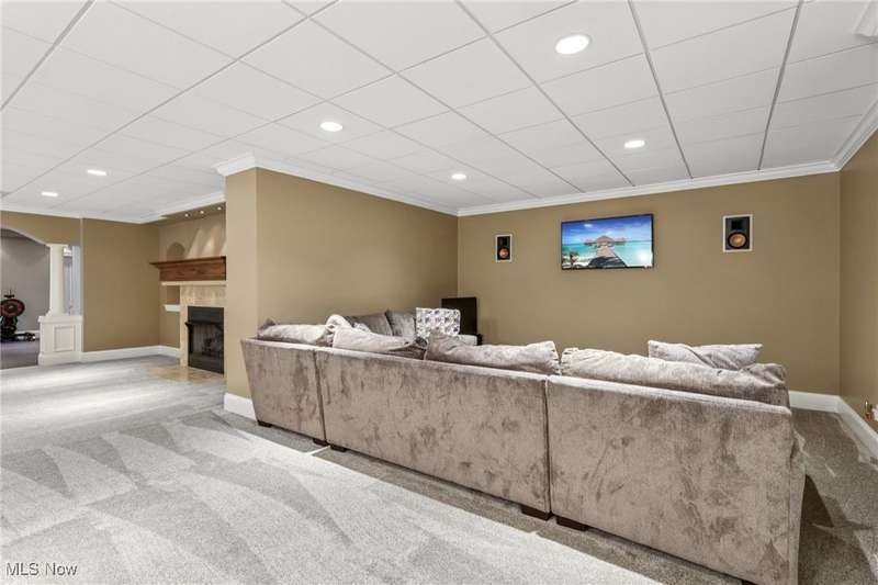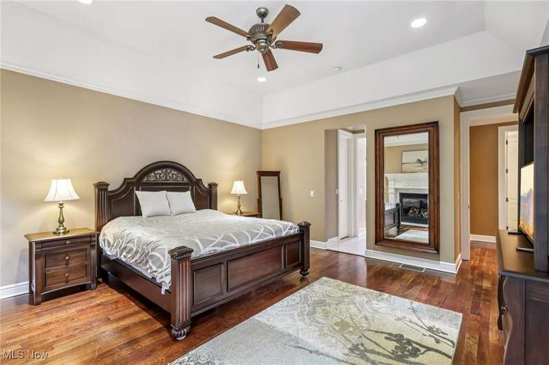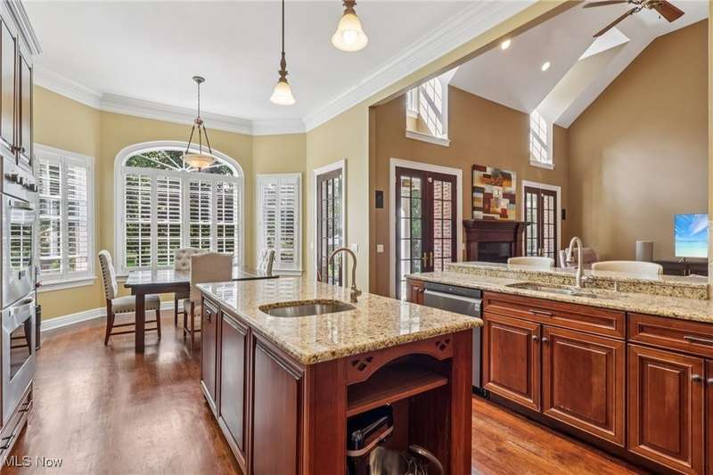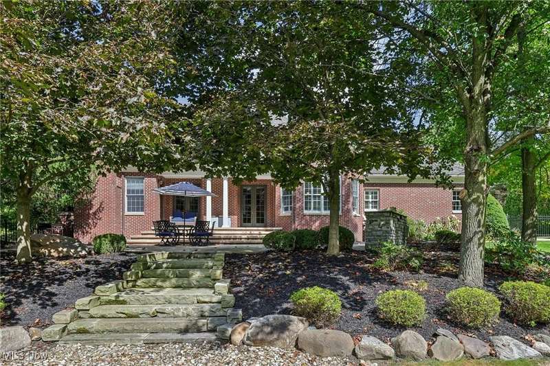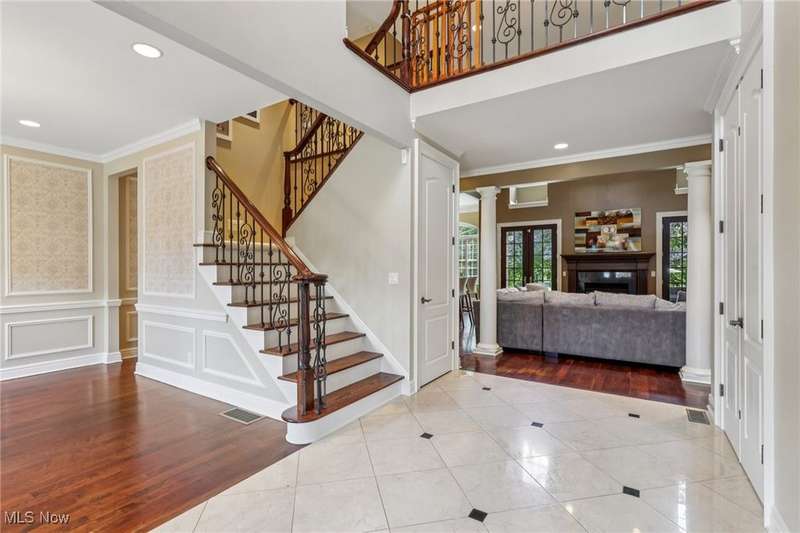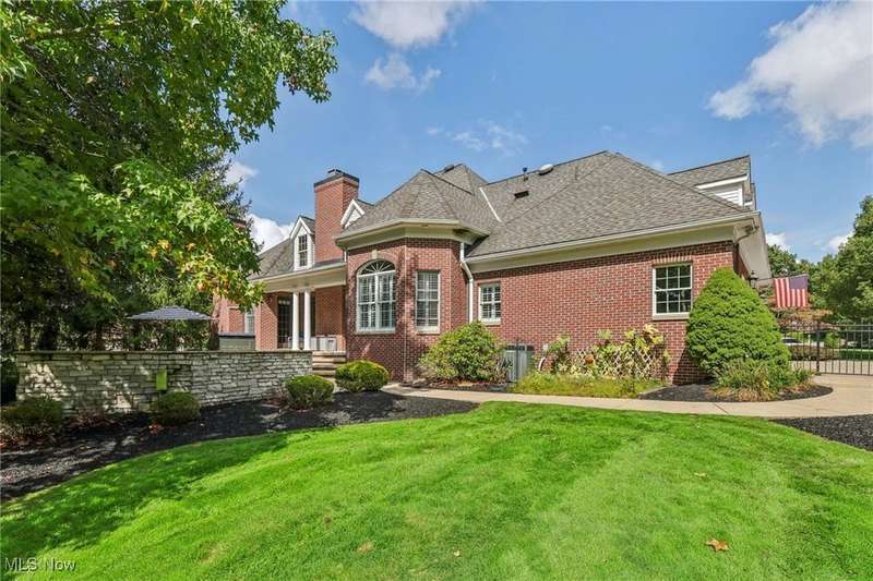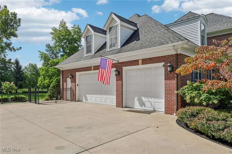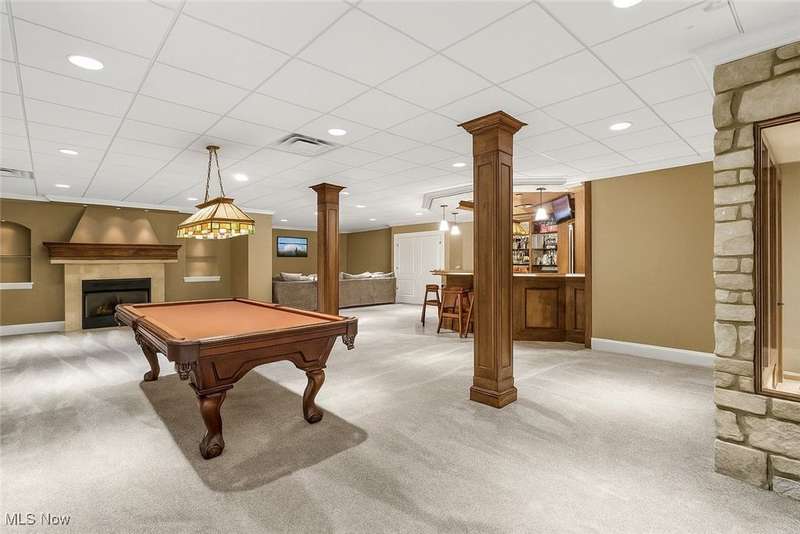 Set back on a beautifully landscaped 1.4-acre homesite with a circular drive, this all-brick residence blends timeless elegance with modern updates throughout. Step inside the dramatic two-story foyer with marble floors and soaring ceilings. Flanking the entry are the formal dining room and office, each with hardwood floors, palladium windows, and classic wainscoting. At the heart of the home is a stunning two-story family room with hardwood floors, gas fireplace, and dual French doors to the covered veranda. The gourmet kitchen impresses with cherry cabinetry, granite counters, a center island with prep sink and beverage fridge, stainless steel appliances, double wall oven, gas cooktop, travertine backsplash, and crown molding. The adjoining morning room bathes the space in natural light and features plantation shutters and a French door to the backyard. A planning center and walk-in pantry add everyday functionality. The owner's suite is a serene retreat with gas fireplace, tray ceiling, his-and-her closets, and French door to the veranda. The updated spa-like bath boasts dual sinks, an oversized double shower, and linen closet. Upstairs, a Juliet balcony with wrought-iron railing overlooks the family room. Two bedrooms with walk-in closets and a large bonus room share a hall bath with dual sinks, separate shower, and linen closet. The lower level is designed for entertaining with a recreation room, gas fireplace, large bar, climate-controlled wine cellar, plus a bedroom, half bath, and workout room. Outdoor living includes a covered veranda, patio, fully fenced yard with wrought iron fencing, and irrigation system. Additional highlights: first floor laundry room, heated 3-car garage, two furnaces/AC (one replaced 2019), newer hot water tank (2020), updated primary bath, blinds, upstairs carpet, and full fencing. This home offers an ideal blend of sophistication, comfort, and updates?perfect for entertaining and everyday living.
