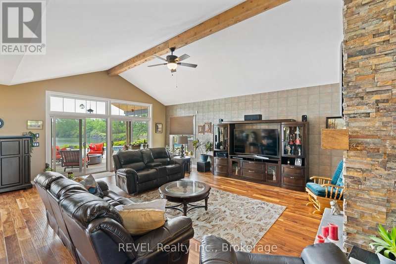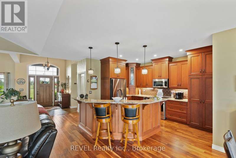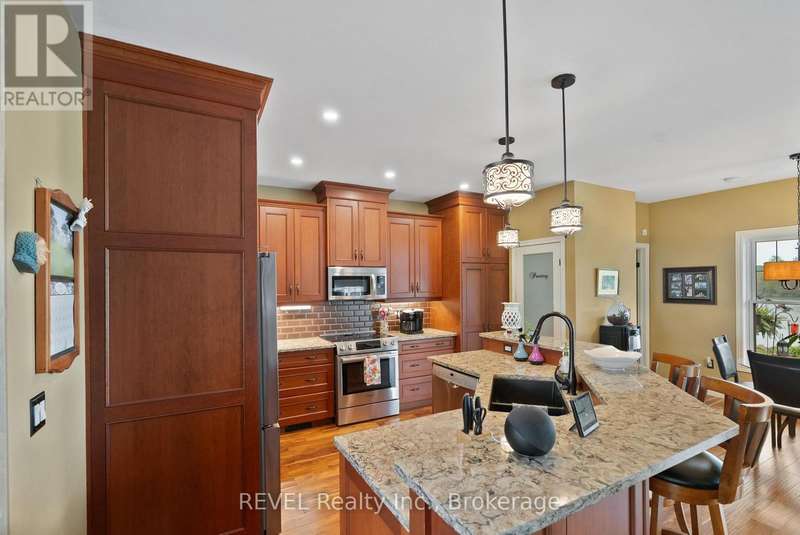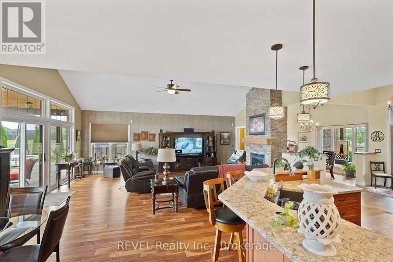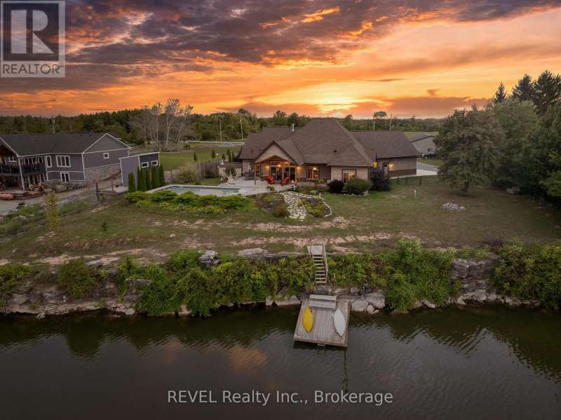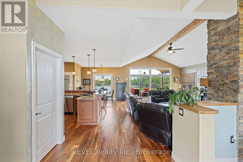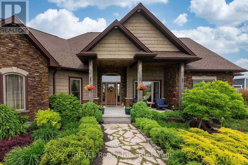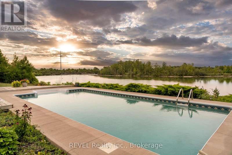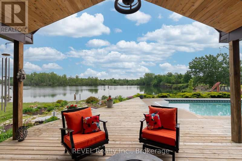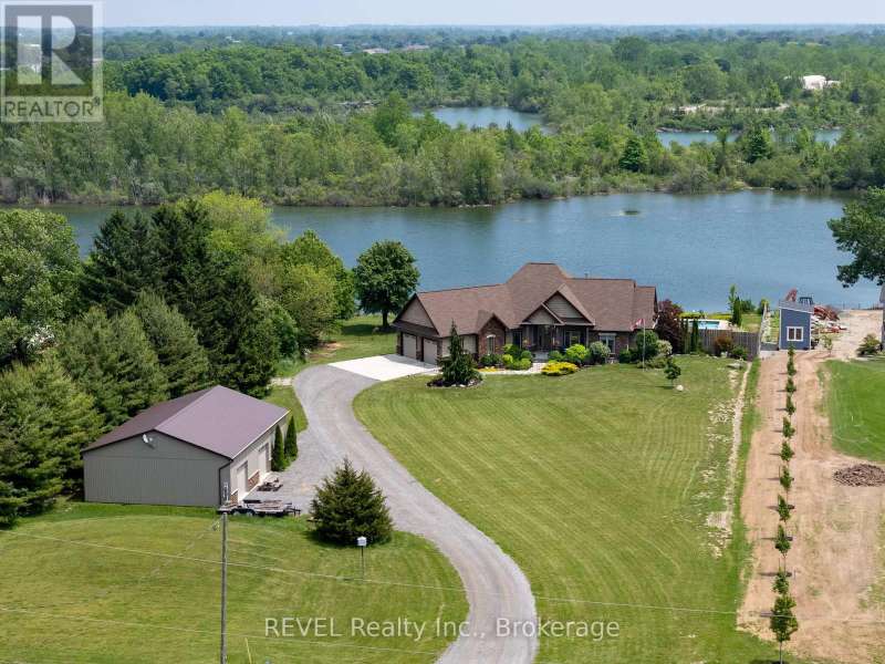 Located just outside the City of Port Colborne with sweeping Wainfleet views, this beautifully appointed bungalow backs onto the serene Port Colborne Quarry Pond and includes .5 acres of owned underwater land, offering an unmatched setting for water recreation and peaceful living. The home blends cottage charm with modern comfort, featuring 4 bedrooms and 2 bathrooms, including a private primary suite overlooking the pond with a luxurious 5-piece ensuite boasting a tile walk-in shower, soaker tub, and walk-in closet. The open-concept main floor is designed for both relaxation and entertaining, with vaulted ceilings in the living room, a striking stone gas fireplace, and large windows that frame the stunning quarry views. The kitchen is well-equipped with quartz countertops, a large island with bartop seating, stainless steel appliances, and a generous pantry, flowing seamlessly into the living and dining areas with rich hardwood flooring and real wood doors throughout. Two additional main-floor bedrooms, a full 4-piece bathroom, and an office that can serve as a fourth bedroom provide ample space for family or guests. A large covered rear deck with a vaulted roof extends your living space outdoors, overlooking an 8-year-old inground pool with a new pump and filter ideal for summer enjoyment. Additional highlights include a main-floor laundry room, an extra-large attached 2-car garage, a 35x40 ft detached shop with full vehicle lift and air compressor, and a 5-ft height unfinished basement for storage. With a cistern water supply and a location that offers a true Muskoka-like experience just minutes from all local amenities, this home delivers the ultimate blend of lifestyle, privacy, and practicality. (id:7434)