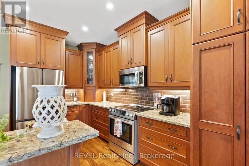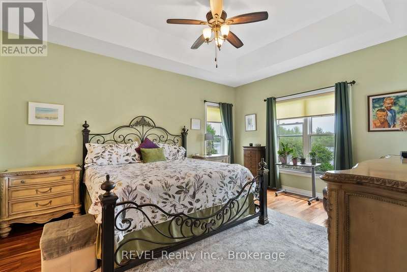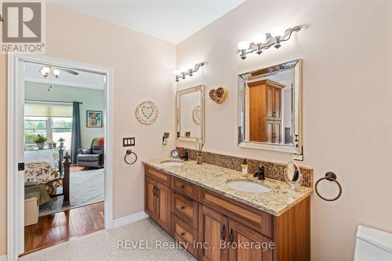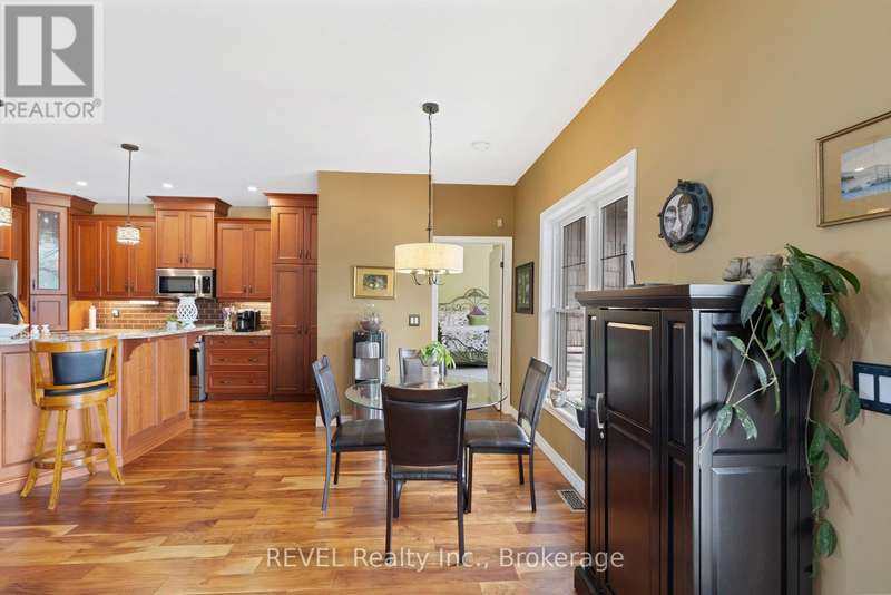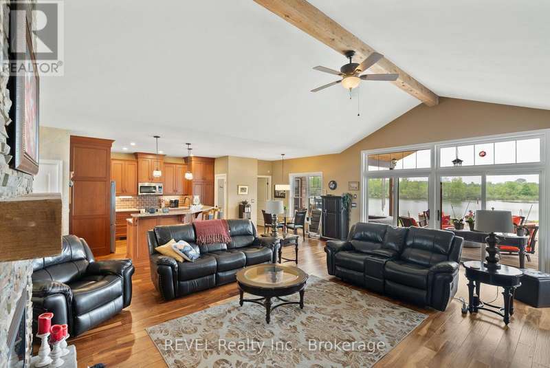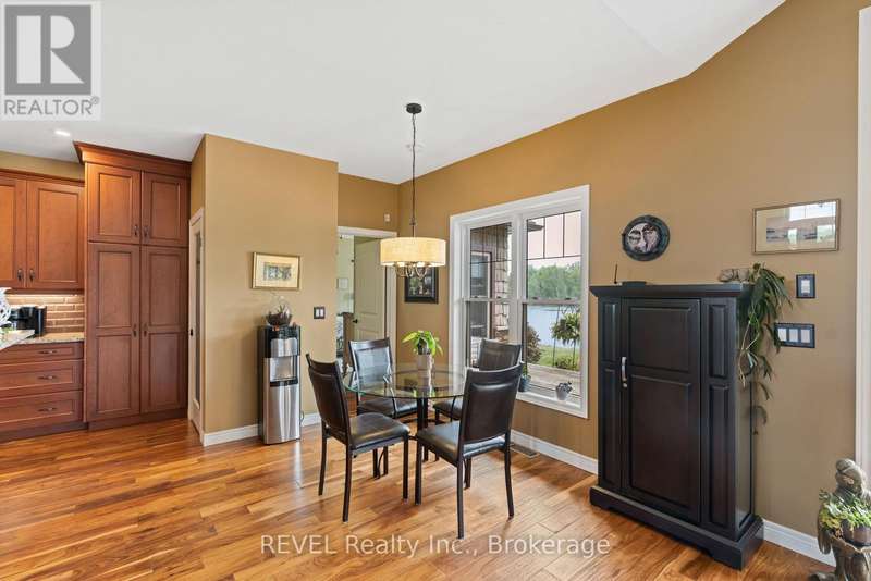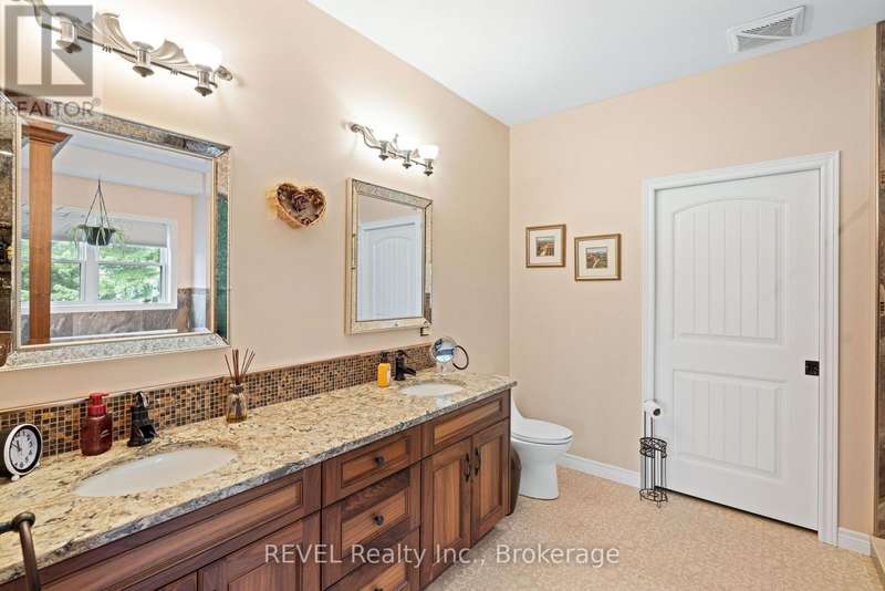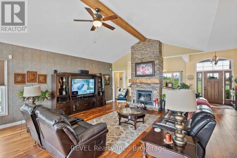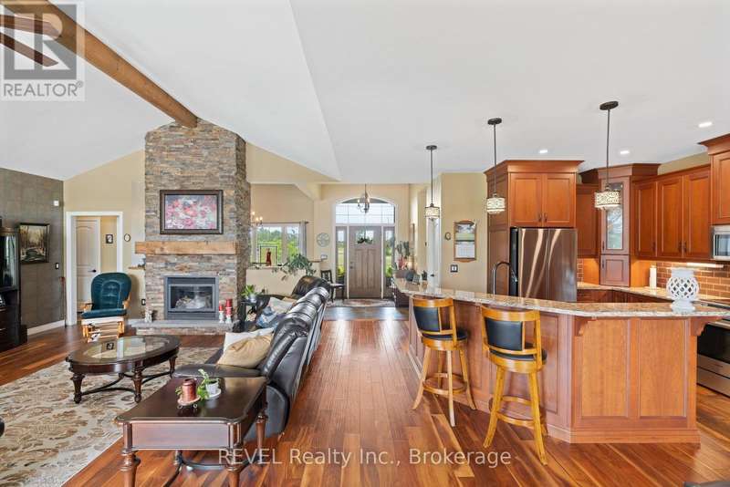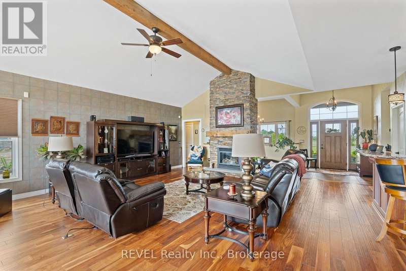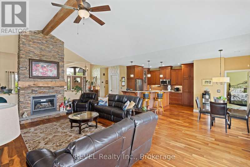 Located just outside the City of Port Colborne with sweeping Wainfleet views, this beautifully appointed bungalow backs onto the serene Port Colborne Quarry Pond and includes .5 acres of owned underwater land, offering an unmatched setting for water recreation and peaceful living. The home blends cottage charm with modern comfort, featuring 4 bedrooms and 2 bathrooms, including a private primary suite overlooking the pond with a luxurious 5-piece ensuite boasting a tile walk-in shower, soaker tub, and walk-in closet. The open-concept main floor is designed for both relaxation and entertaining, with vaulted ceilings in the living room, a striking stone gas fireplace, and large windows that frame the stunning quarry views. The kitchen is well-equipped with quartz countertops, a large island with bartop seating, stainless steel appliances, and a generous pantry, flowing seamlessly into the living and dining areas with rich hardwood flooring and real wood doors throughout. Two additional main-floor bedrooms, a full 4-piece bathroom, and an office that can serve as a fourth bedroom provide ample space for family or guests. A large covered rear deck with a vaulted roof extends your living space outdoors, overlooking an 8-year-old inground pool with a new pump and filter ideal for summer enjoyment. Additional highlights include a main-floor laundry room, an extra-large attached 2-car garage, a 35x40 ft detached shop with full vehicle lift and air compressor, and a 5-ft height unfinished basement for storage. With a cistern water supply and a location that offers a true Muskoka-like experience just minutes from all local amenities, this home delivers the ultimate blend of lifestyle, privacy, and practicality. (id:7434)