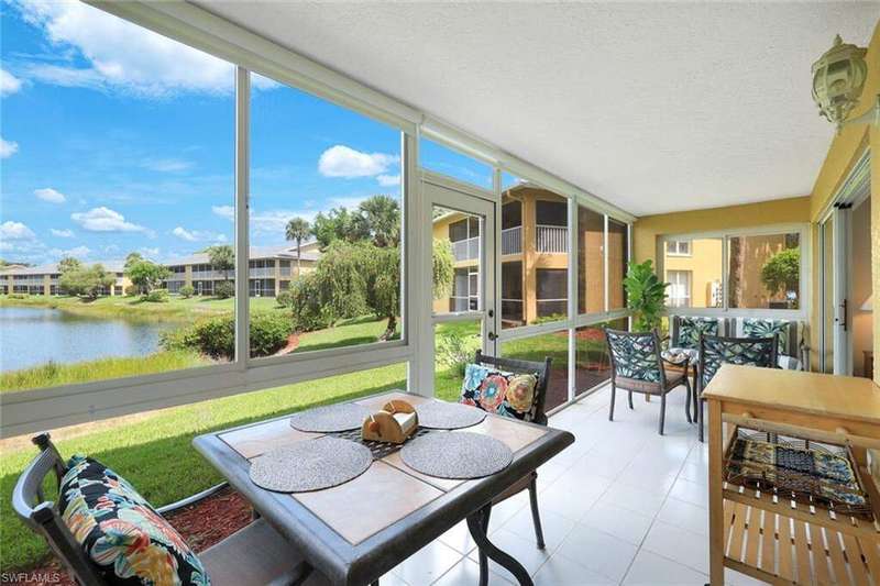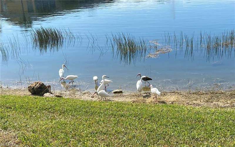 Fabulous end unit with an extra window bringing in natural light and green space. Large neutral tile set on the diagonal, flows throughout the kitchen, great room, flex space and foyer. There is upgraded new carpet in both bedrooms. This modern kitchen has new cabinetry, lovely granite counters and extra custom built-ins. There is a separate flex space perfect for office/den or overflow sleeping area. The open and spacious feel is light, bright and airy. The Owner's suite has upgraded designer carpet, large walk-in closet & private bath. Pocket sliders to the lanai open up the bedroom to the lanai, blending the outdoors with inside. The large lanai is enclosed keeping it spotless during rain storms. There is ample room for both dining and gathering for conversation. Sip coffee and watch the native birds wake up in the mornings. Sip cocktails while marveling at the Naples colorful sunsets in the sky and reflecting in the lake. This unit has a parking space assigned right in front with no other cars next to it. This is the Florida lifestyle you are looking for. No club memberships are required here keeping fees low. Abbey on the Lake is located in the desirable community of Imperial. Nestled close to the white sandy Vanderbilt beach or Wiggins state park. A variety of restaurants and shopping surround the area and the airport for travel is less than 30 minutes away. Take one look and you will want to call this home.
