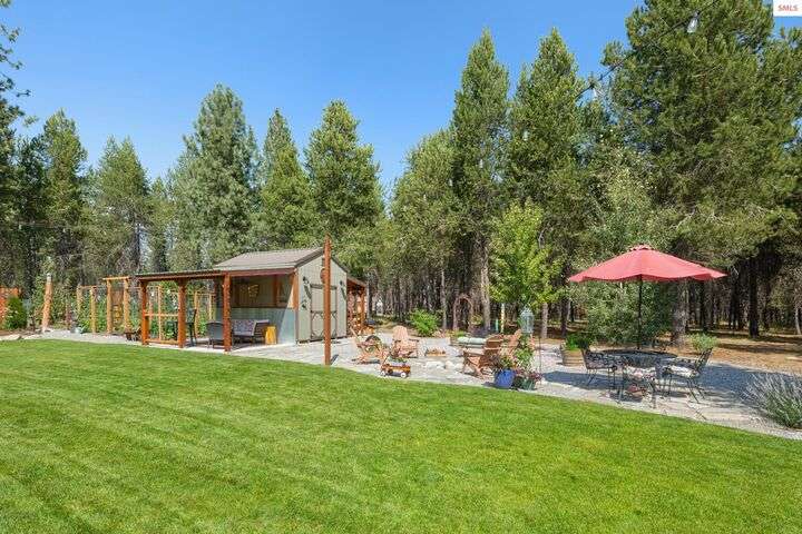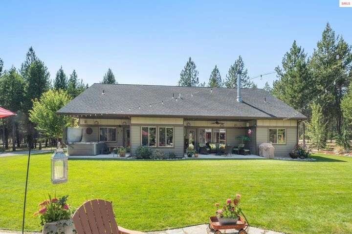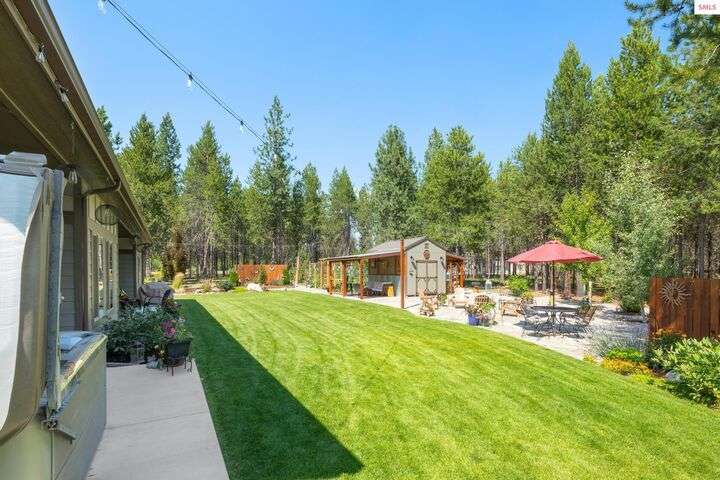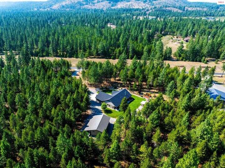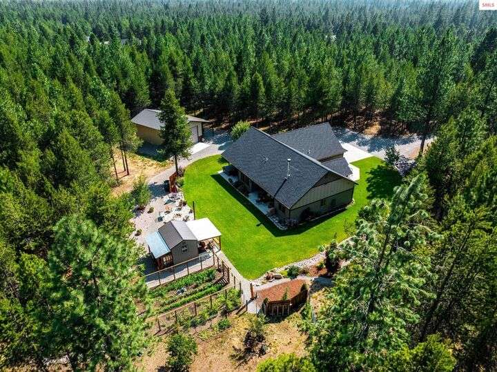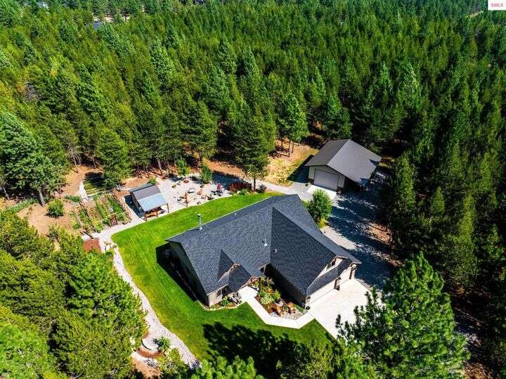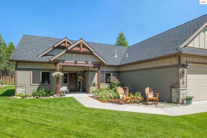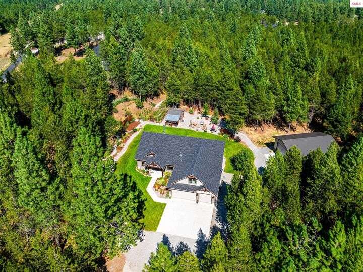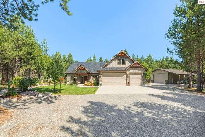 Welcome to Lone Mountain Estates, an exclusive community with 5-acre lots, paved roads, and easy access to Coeur d'Alene, Rathdrum, and Spirit Lake. This 2,359 sq ft single level home with bonus room features an open concept, wood burning fireplace, custom kitchen with stainless gas appliances, wine fridge, granite surfaces and a walk-in pantry. The luxurious master suite offers covered patio access to your hot tub, a spacious walk-in closet, separate vanities, soaking tub, and a beautiful walk-in shower. Additional highlights include vaulted ceilings, covered patio, a versatile bonus/media room and a mudroom/laundry room with sink. Finally, a large 24x40 shop with 12x40 lean too & 14' doors & RV parking complete this residence. The property grounds are manicured with outdoor living space, a luscious fenced in 20’x32’ garden w/irrigation, fire pit, storage shed and barbecue area, making it an entertainers dream. This exclusive location has a private drive offering solitude like no other in the neighborhood.