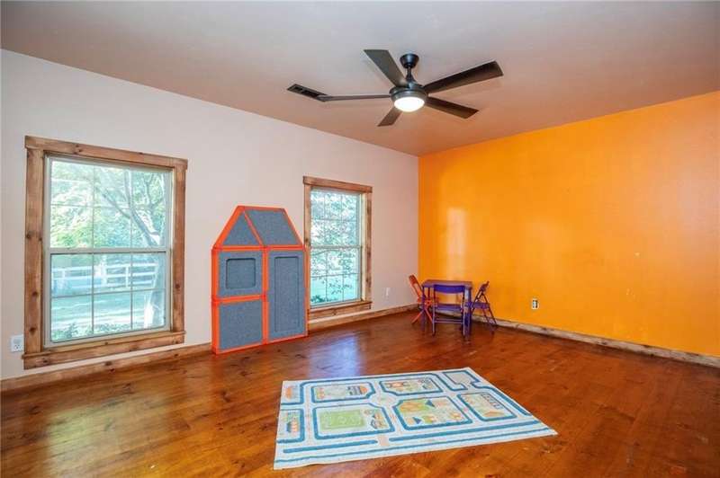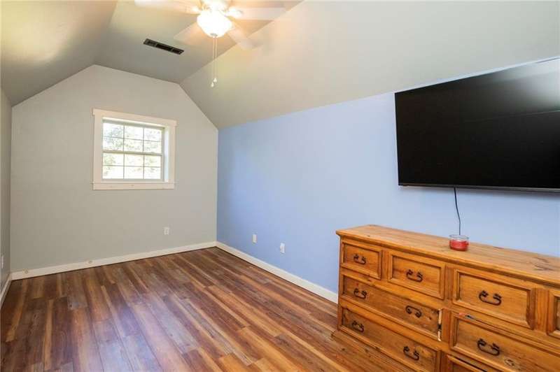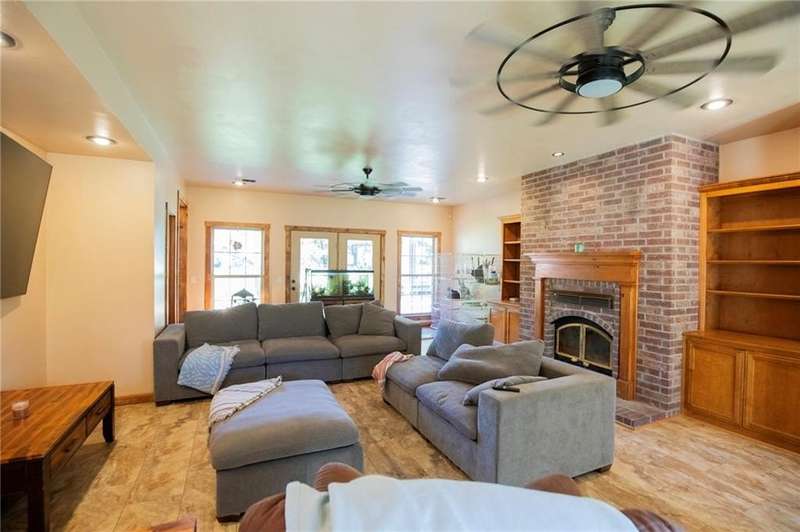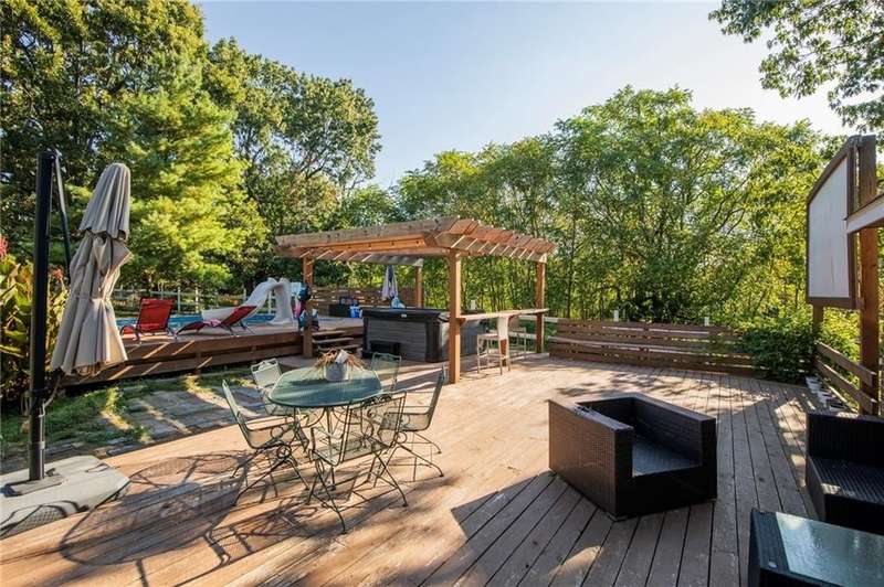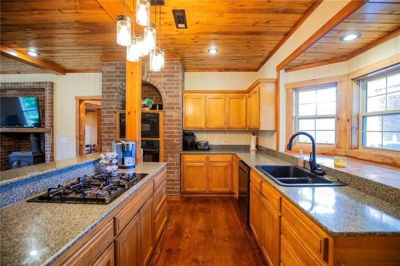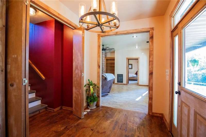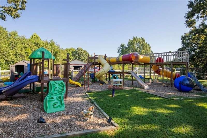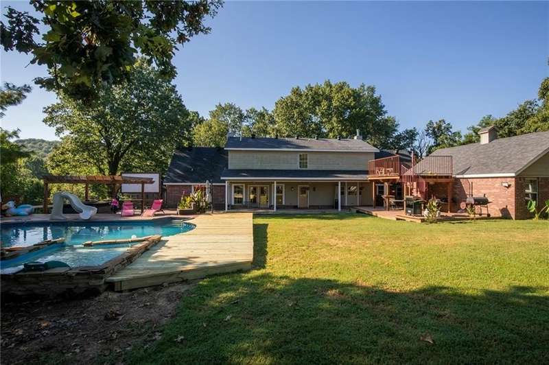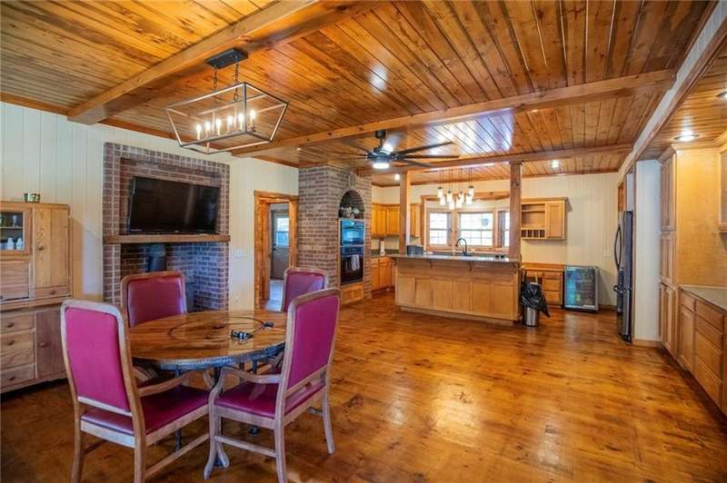 Welcome to your dream retreat—nestled behind trees on 5 private acres. This stunning property offers space & family-friendly amenities, outside city limits but minutes from town. Outside, you will enjoy access to a fully stocked 7-acre lake, shared with only 3 neighboring properties-ideal for fishing or relaxing. The backyard features a semi-inground pool & splash pad, hot tub, outdoor movie screen, & a massive custom playground complete with forts, tunnels, slides, & swings. A 40’ x 44’ barn with lean-to offers ideal storage or workspace. Inside this rustic home is a large kitchen, dining, & hearth room with a wood burning stove featuring beautiful hardwood floors & a tongue & groove ceiling. With 4 large bedrooms, a bonus room (could be a 5th), & a dedicated office, this home has lots of space. Designed with storage in mind, it offers plenty of closet space, a large laundry/mud room, & a roomy closet in the living room that leads to a storm cellar. An additional 5 acres also available for purchase.