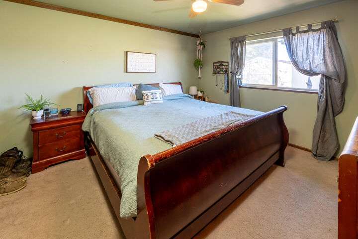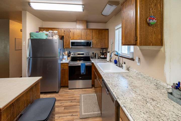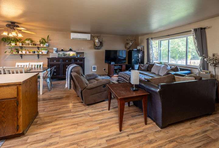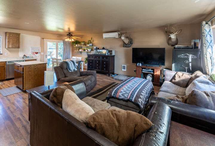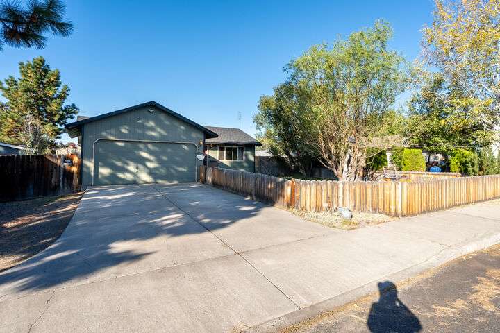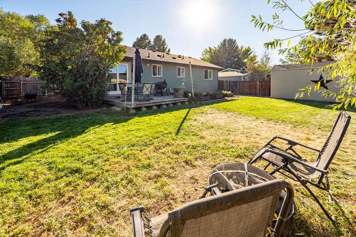 Must see! 3 bedroom 1 bath home offering a great room floor plan featuring an open kitchen with a center island and dining area with sliding door leading out to the backyard. Interior updates include newer laminate flooring, brand-new kitchen countertops, all new kitchen appliances. Comfort is ensured year-round with a mini-split heat pump for both heating and cooling. Outside, enjoy a fully fenced landscaped yard with sprinklers, an enclosed front yard, mature trees, a back deck and a 10 X 20 storage building with some shelving. Additional upgrades include fresh exterior paint with a new roof installed in 2019. Double car attached garage with lots of storage. Call today for your showing.