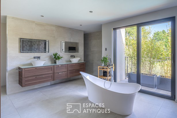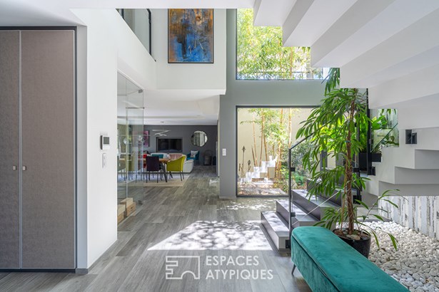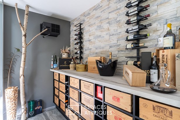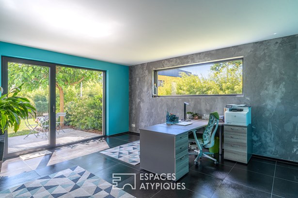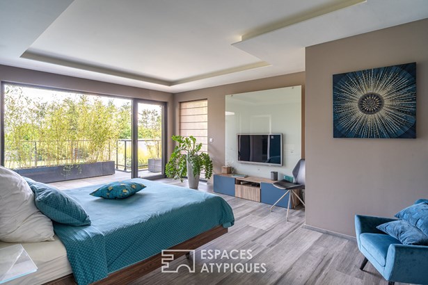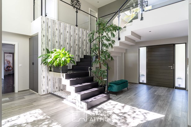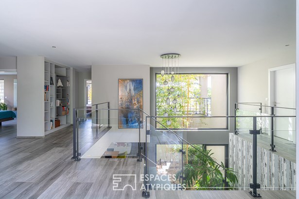 From the moment you enter, the codes of contemporary architecture are evident: vast open spaces, fluid interior circulation, generous openings to the outside, and high-quality materials. The ground floor is centered around a central patio that bathes the entire space in natural light. The professional space, also accessible via a separate entrance, has a reception area, a meeting room, two offices, and a kitchenette. The living area opens onto the terrace through large bay windows. It includes a living room with a fireplace, a dining room, and a fully equipped open kitchen. A glass-fronted wine cellar, a pantry, a dressing room, and direct access to the garage complete this level.