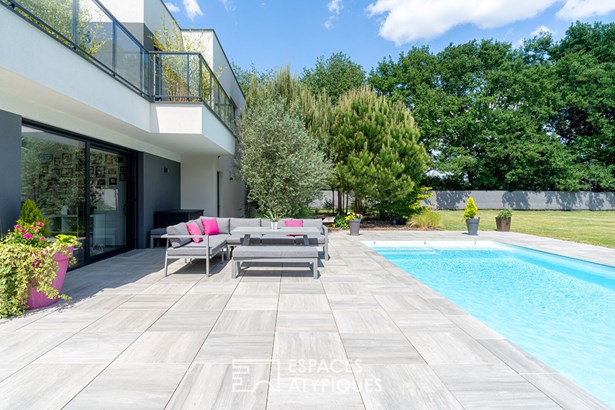 The outdoor spaces, perfectly integrated into the architecture, have been designed as natural extensions of the interior spaces. The 8×4 m swimming pool, pool house, fire pit area, and petanque court are set in a structured garden that is both intimate and open. A large garage, workshop, and carport provide practicality and comfort for everyday life.