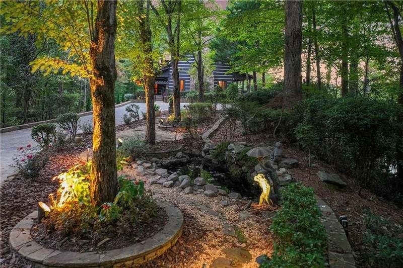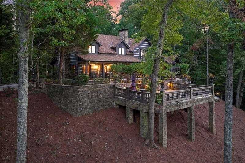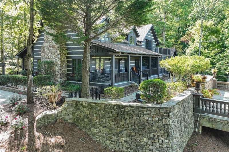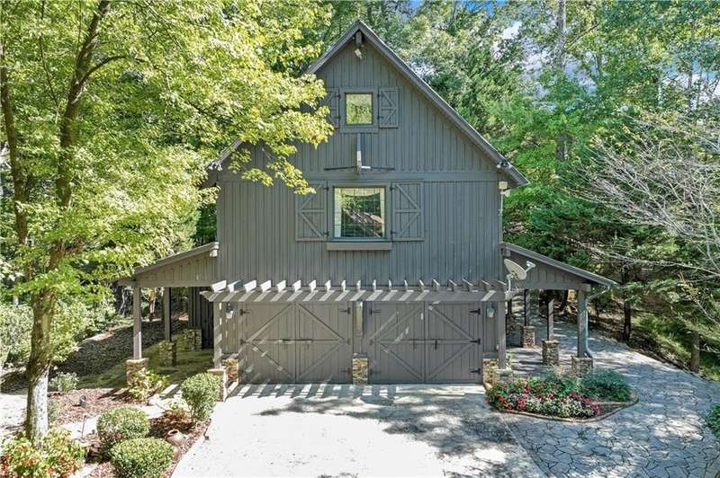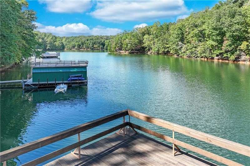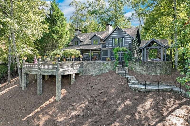 This magnificent, elegantly rustic, custom built Lake Lanier estate on 6.78 acres includes a Main Home, a Carriage House, and 2 attached Guest Houses on deep water with a double slip party dock, along with a stream, multiple waterfalls and water features, covered gazebo, and stone walking paths, is like no other property you've experienced! It could easily function as a private estate, investment opportunity, or corporate retreat. The refined gated entrance and tree lined drive over the stream welcomes you to the Main Home reminiscent of a log home in the mountains. Once inside, you'll appreciate the family room with gorgeous, hand hewn logs and beams, pine floors taken from an 1800's cabin, both joined with wood pegs, wood ceiling, stone fireplace, and an open porch leading to a stone patio that captures beautiful lake views. The kitchen boasts a stone backsplash, Viking appliances of a 4 burner with griddle gas range and refrigerator, a Bosch dishwasher, built-in pantry, a second stone fireplace in the dining area, and lake views. Just off the kitchen is a laundry room, and a hall full bath with SteaMist shower. Walk past a spiral staircase (reclaimed from a ship) and you'll find a generous Guest bedroom with ensuite offering a third stone fireplace, built-ins, lake views, and French doors to a private screened porch. The bath includes a gorgeous stone accent wall and a huge, dual head shower. Upstairs, the Primary bedroom with ensuite offers a cozy sitting/office area featuring a wood burning stove against a stone accent wall. Built-ins and a spacious morning bar lead into the luxurious bath with a makeup area, SteaMist shower, and stone floors. Within the bedroom, a fourth stone fireplace, huge walk-in closet with built-in storage, and French doors leading to your private deck overlooking the lake, combine to enhance the beginning or ending of your day. An additional bedroom/office with 3 closets, a sitting area, and a fifth stone fireplace will warmly welcome guests. Two hall closets and a hall, full bath completes the upper floor. The Carriage House features a 2 bay, heated and cooled garage with an interlocking tiled floor. Upstairs you'll enjoy the convenience of a full kitchen with a Thermador 4 burner gas range, 2 Subzero under counter refrigerators, a Bosch dishwasher, granite counters, stained cabinets, wood walls and ceiling, and wide board pine flooring. A spacious dining and living area focuses on a stacked stone accent wall with wood burning stove. A full bath, linen closet, and closet, along with a loft bedroom makes a perfect space for your guests. Should there be a power loss, a Generac generator supports the Main Home and the Carriage House. The Guest Homes allow for additional family or guests to feel right at home. Each home features 2 garage bays that are heated and cooled with separate thermostats, with 1 bay hosting an EV charger. Upon entering the homes, you'll find a laundry room with glazed cabinets, Travertine tile floors, granite countertops, and a sink. Before you walk upstairs, look up! You won't want to miss the stunning, light-filled, wood ceiling. Once upstairs, you'll find that both living spaces are private, yet conveniently connected. They each offer kitchenettes with Kitchen Aide refrigerators, drawer dishwashers, and microwaves. The family and dining areas are intimate, and both have ample bedrooms with ensuites. Stone paths from the Main home and the Guest Home lead past the stream, waterfall, and pond to a covered gazebo with beautiful lake views. The 32x32 double slip, covered dock is teak and has been recently pressure washed and oiled. Included at the dock are a boat hoist and 4 jet ski ports. The dock electrical was also recently rewired. This amazing property also features stone accent walls. A walkable paved cart path that leads to the adjacent vacant lot with a concrete drive allows for overflow parking, an RV or trailer for your watercraft, and a separate gated entrance.