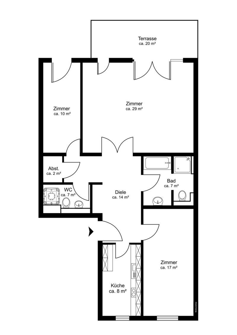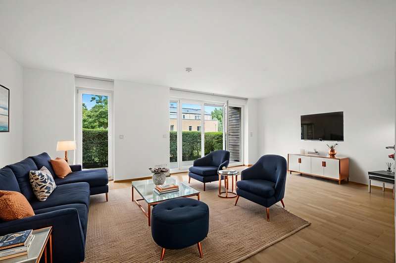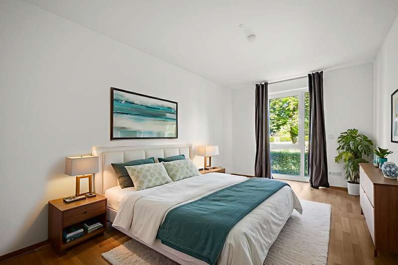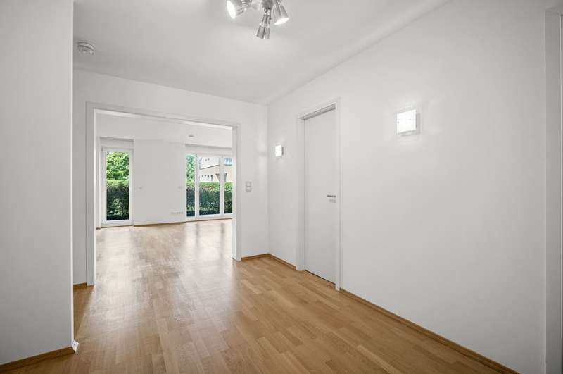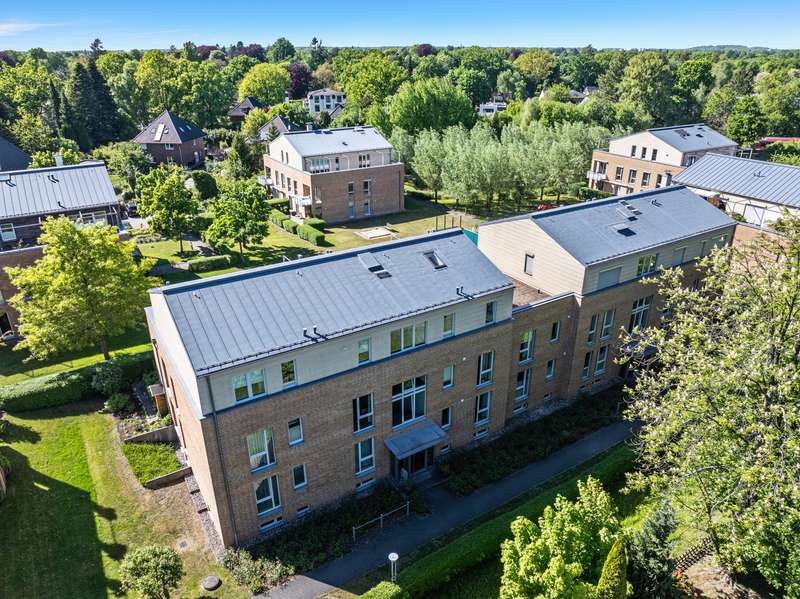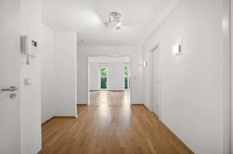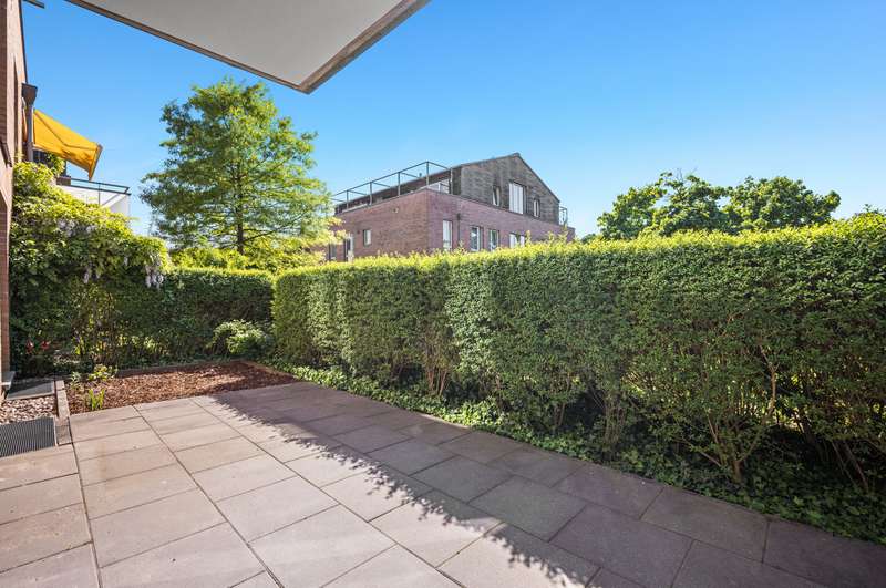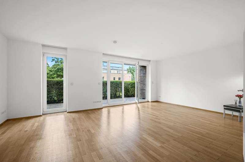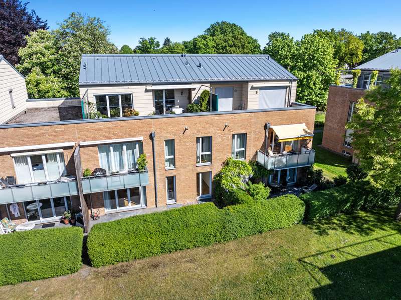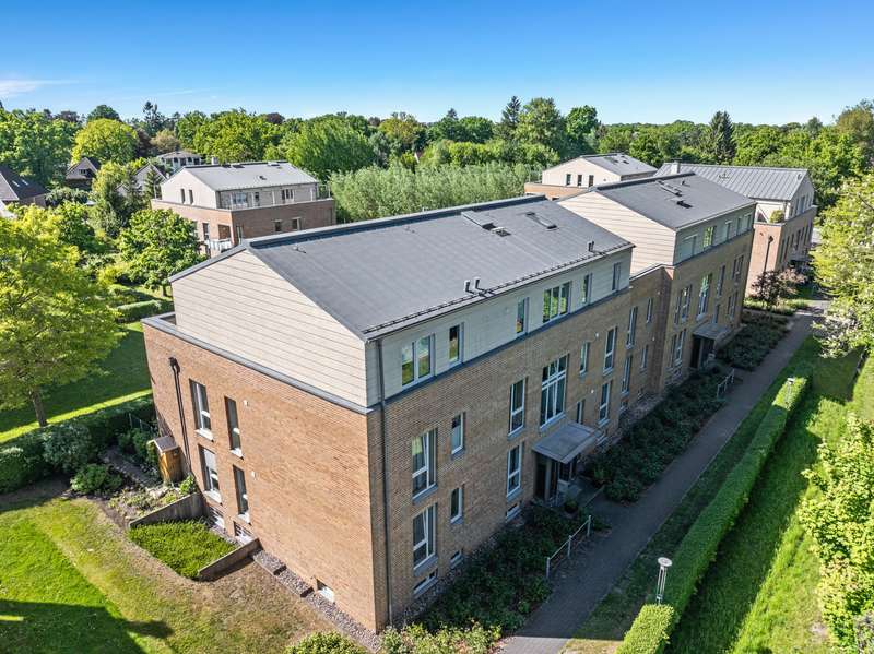 The condominium offered here is part of a townhouse ensemble built in 2007 in the heart of Hamburg-Wellingsbüttel. A total of three residential buildings, including an underground garage, were built on a plot of approx. 4,960 m². The park-like complex has been designed to be green and spacious and invites you to live in a quiet yet central location. The apartment is located on the first floor of the building. As soon as you enter the apartment, it impresses with its brightness and spaciousness. The high-quality parquet flooring and underfloor heating enhance this character and create a feel-good atmosphere. Right next to the entrance is a modern, bright fitted kitchen that offers plenty of storage space. Adjacent to this is a room measuring approx. 17 m², which would make a wonderful master bedroom. There is enough space here for a large built-in wardrobe. Next door is a brightly tiled bathroom with shower and bathtub. The additional approx. 10 m² room is perfect as a guest room, children's room or office. Right next to it you will find a guest WC with a washing machine connection. If required, you can also easily accommodate a tumble dryer here or move the connection to the adjoining storage room, which is also brightly decorated. You have the option of having a shower installed in the guest WC. The heart of the apartment is the light-flooded living/dining area. Various floor-to-ceiling window elements and the double doors to the terrace provide an ideal amount of light. From here you have a wonderful view of the greenery and the park-like grounds. This offer is rounded off by a bicycle storage room, a large cellar room and an underground parking space with its own land register, which is already prepared for the installation of a wallbox. Have we piqued your interest? Please do not hesitate to contact us for further information and a viewing appointment - we look forward to hearing from you!