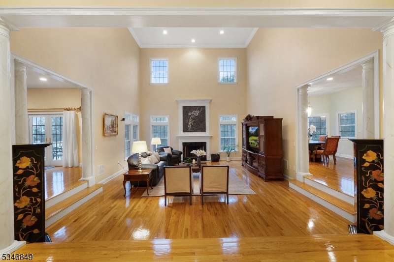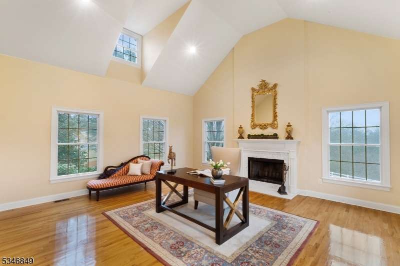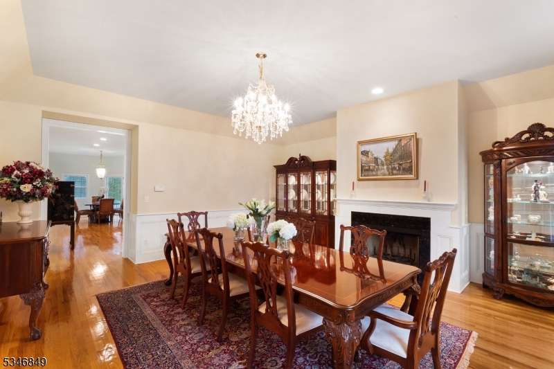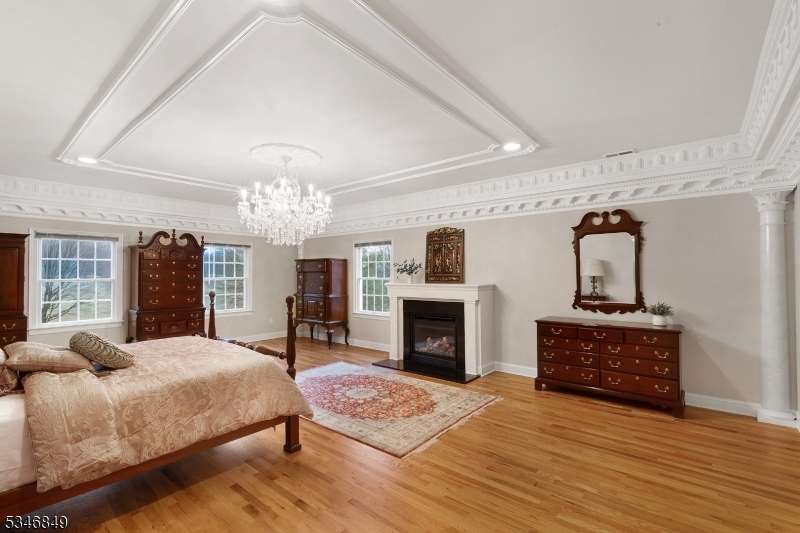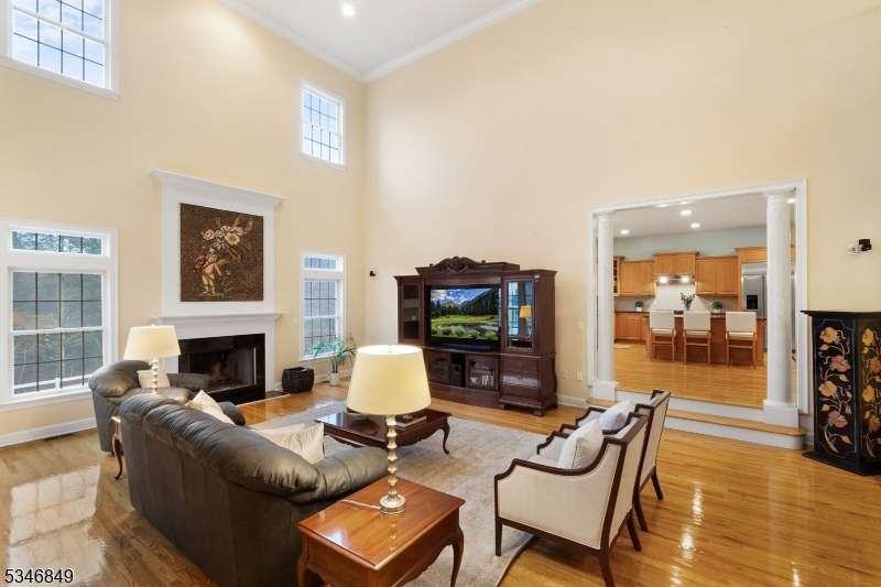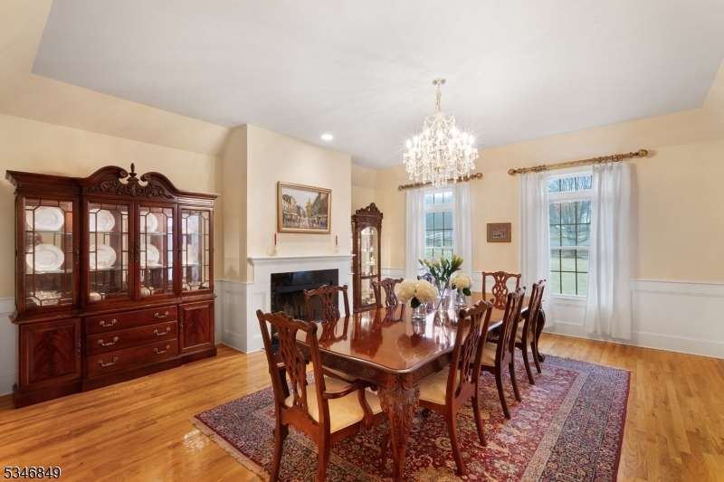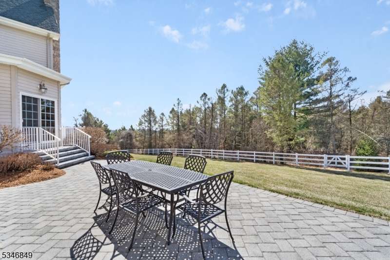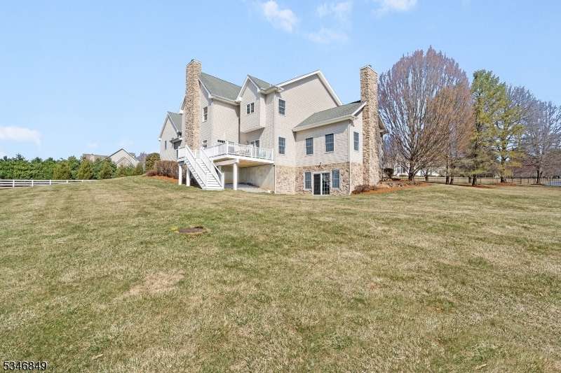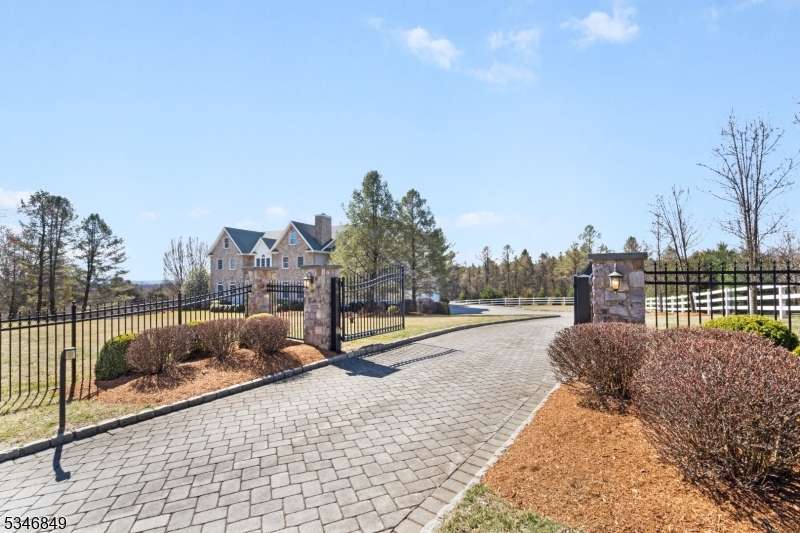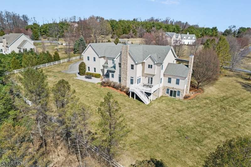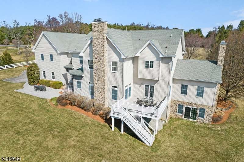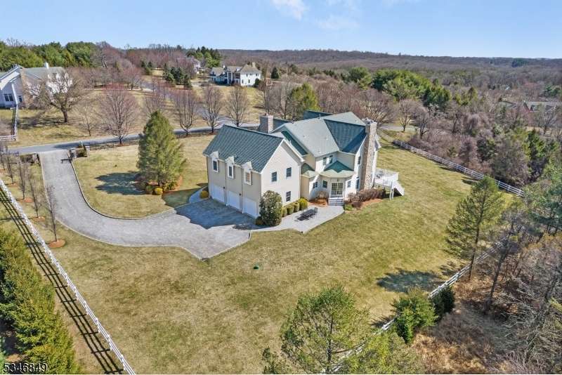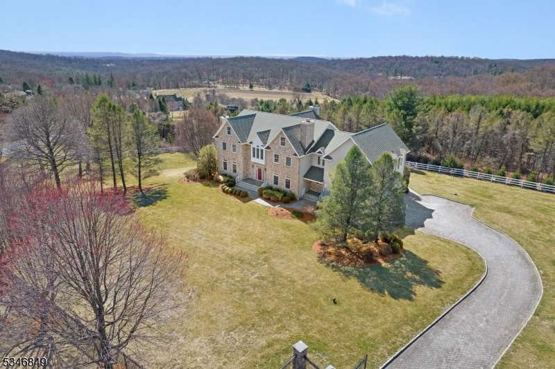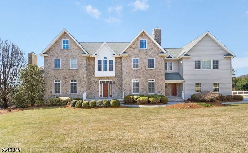 Impressive Colonial with stone front and Hardie Plank siding is set back beautifully on a private 5.8 acre fully fenced showcase property with night accent lighting; 3-car garage and whole house generator. This luxurious home resides on a quiet cul-de-sac street in a welcoming neighborhood and encompasses 6,325 sq ft with 12 rooms, 5 bedrooms each with en suite bath access from 4 full baths, 2 powder rooms, 4 fireplaces, and hardwood flooring, volume ceilings, custom millworker, and decorative columns throughout. First floor features inviting entryway with towering 20' ceilings with dazzling crystal chandelier and sweeping curved stairway to 2nd floor; lovely formal living room; sensational sunken great room features a 21' ceiling and open-hearth fireplace; resplendent home office has radiant windows on 3 walls, clerestory window nestled in the vaulted ceiling, and a handsome fireplace; spacious game/billiards room faces the great room and has access to the inviting rear deck; expansive designer kitchen boasts granite countertops with marble backsplash, abundant wood cabinetry, center island, premium stainless steel appliances, and roomy eat-in dining; tasteful formal dining room has a gorgeous tray ceiling and open-hearth fireplace; completing the first floor is a well-appointed service area. Inviting paver patio, no-maintenance Trex deck, and rear yard with rustic woodland borders on 3 sides. Quality public schools, including top-rated Mendham High School, close to highway access, and golf clubs