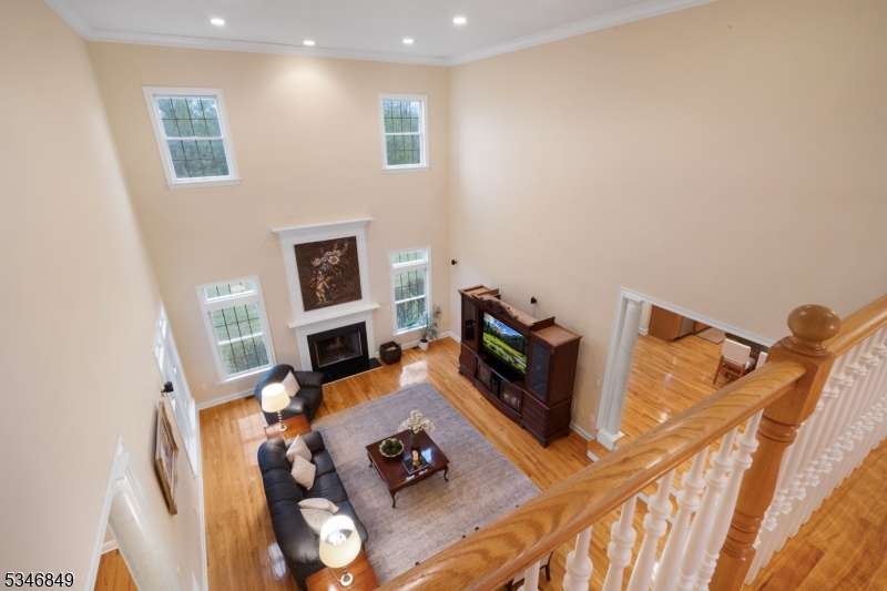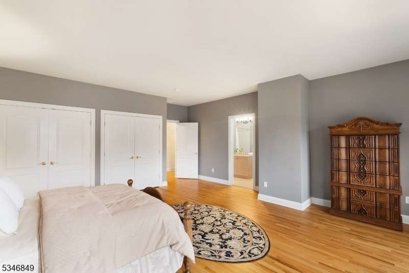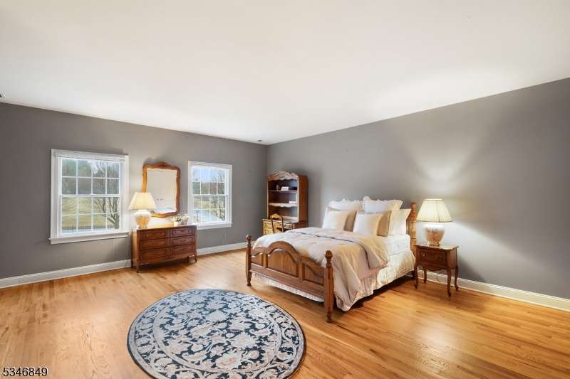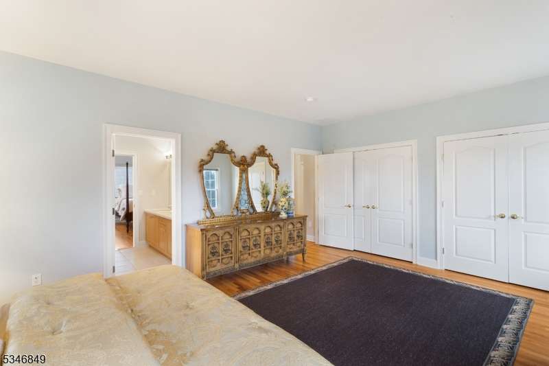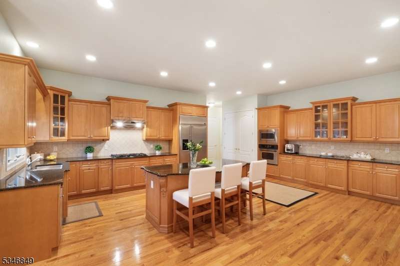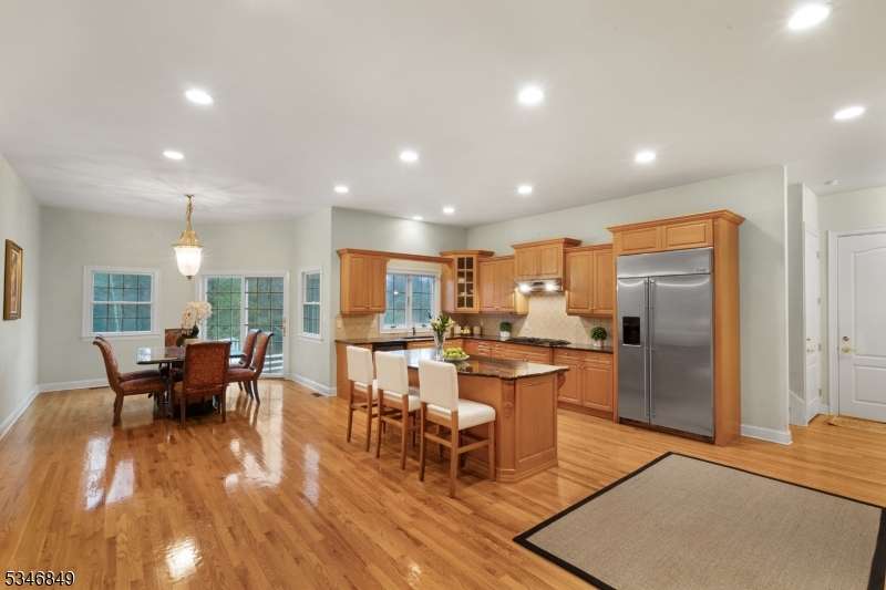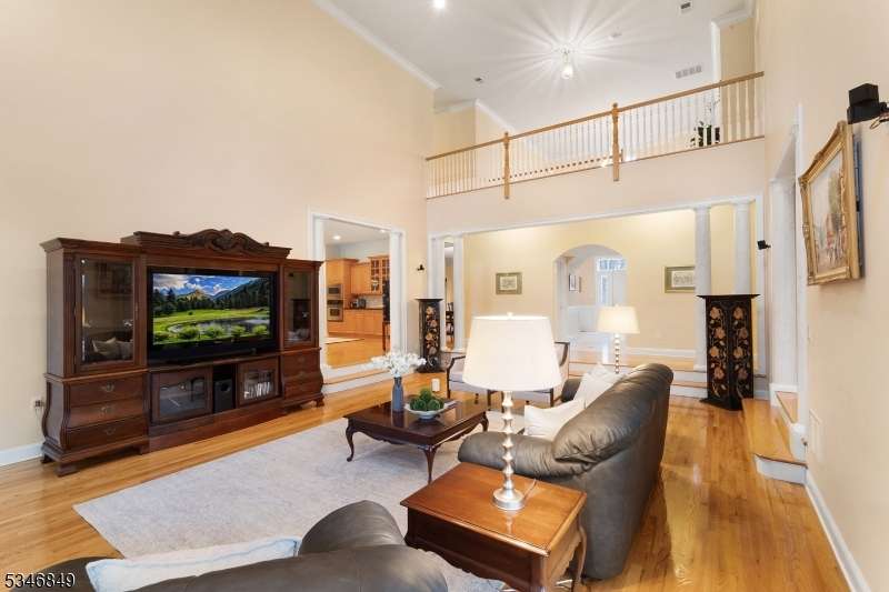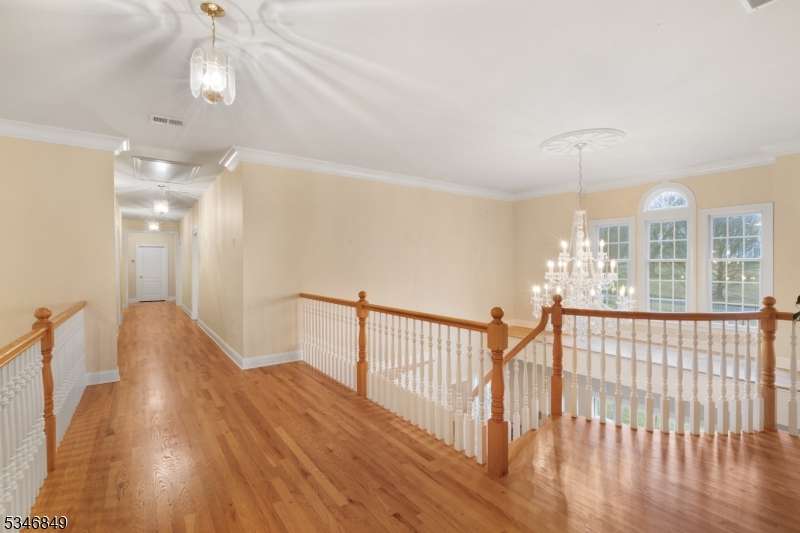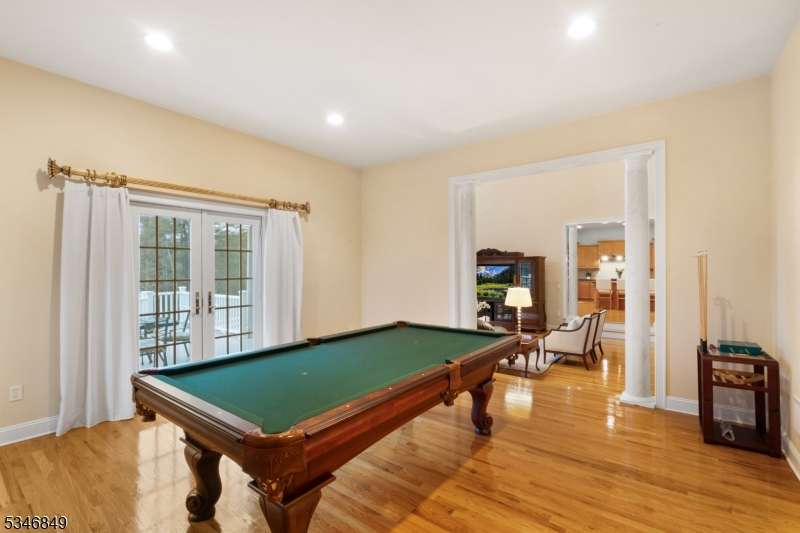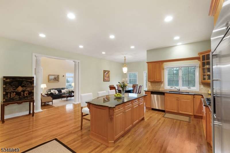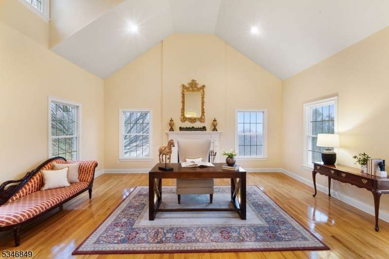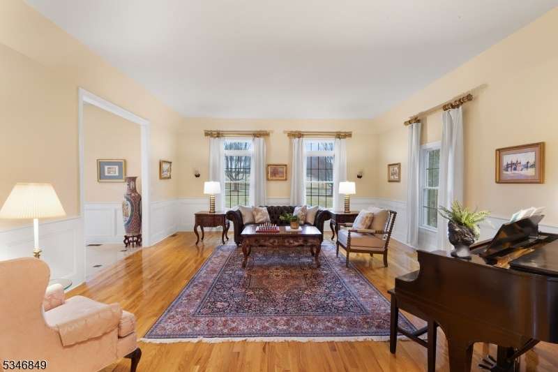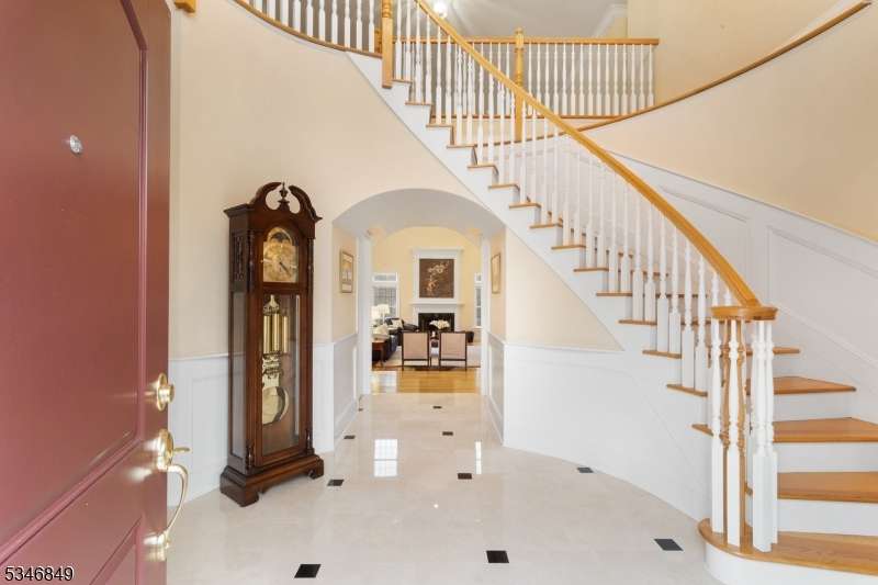 Impressive Colonial with stone front and Hardie Plank siding is set back beautifully on a private 5.8 acre fully fenced showcase property with night accent lighting; 3-car garage and whole house generator. This luxurious home resides on a quiet cul-de-sac street in a welcoming neighborhood and encompasses 6,325 sq ft with 12 rooms, 5 bedrooms each with en suite bath access from 4 full baths, 2 powder rooms, 4 fireplaces, and hardwood flooring, volume ceilings, custom millworker, and decorative columns throughout. First floor features inviting entryway with towering 20' ceilings with dazzling crystal chandelier and sweeping curved stairway to 2nd floor; lovely formal living room; sensational sunken great room features a 21' ceiling and open-hearth fireplace; resplendent home office has radiant windows on 3 walls, clerestory window nestled in the vaulted ceiling, and a handsome fireplace; spacious game/billiards room faces the great room and has access to the inviting rear deck; expansive designer kitchen boasts granite countertops with marble backsplash, abundant wood cabinetry, center island, premium stainless steel appliances, and roomy eat-in dining; tasteful formal dining room has a gorgeous tray ceiling and open-hearth fireplace; completing the first floor is a well-appointed service area. Inviting paver patio, no-maintenance Trex deck, and rear yard with rustic woodland borders on 3 sides. Quality public schools, including top-rated Mendham High School, close to highway access, and golf clubs