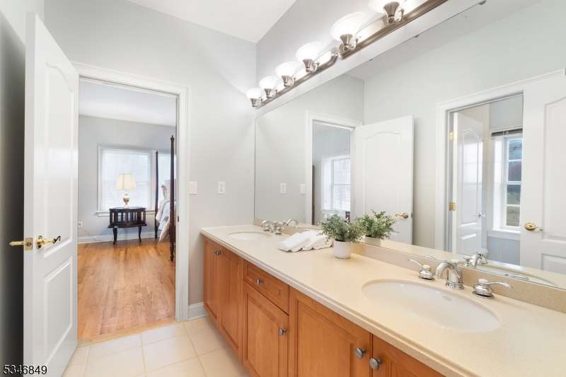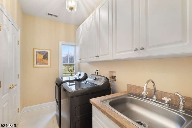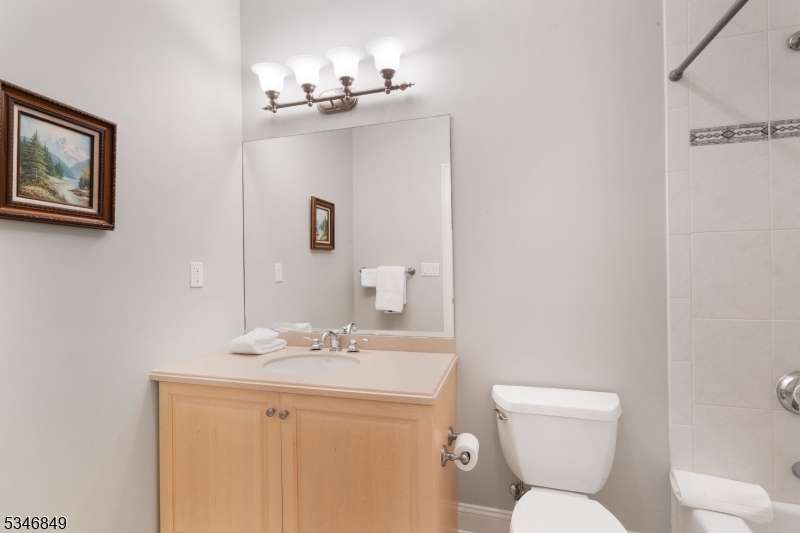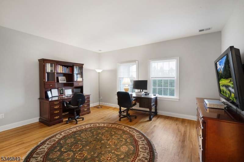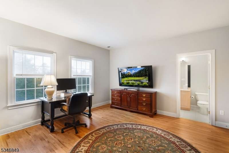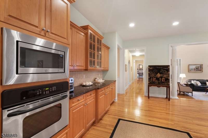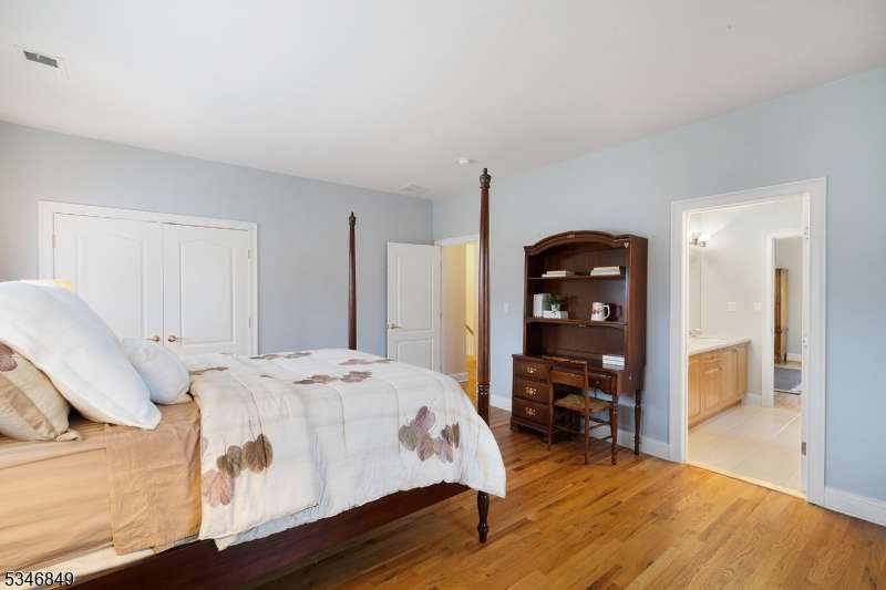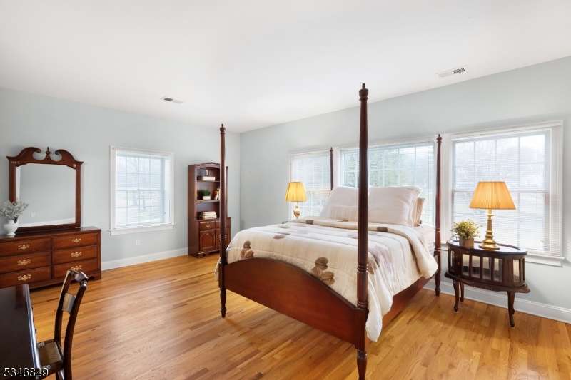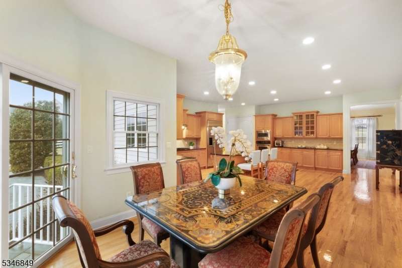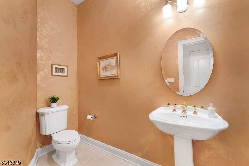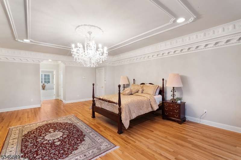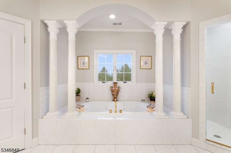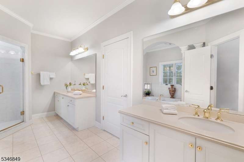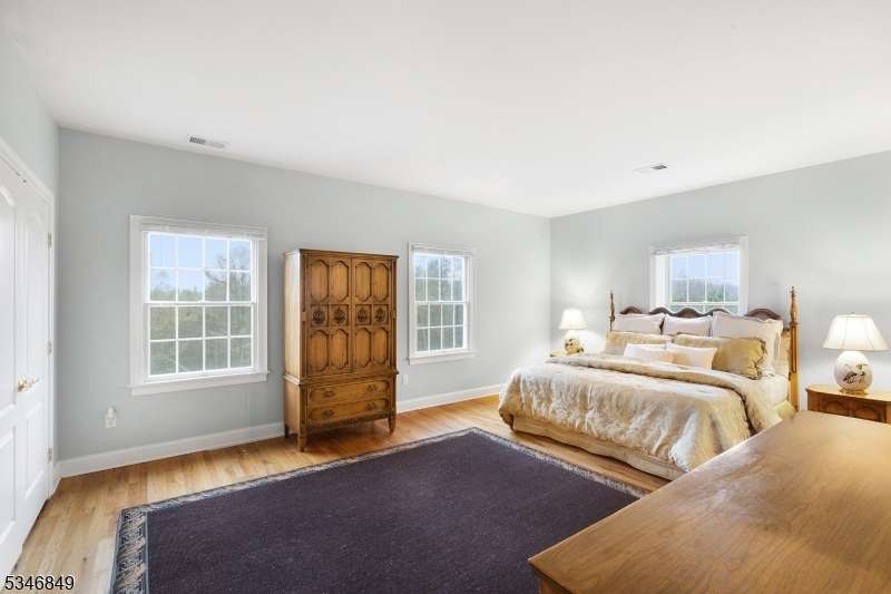 Impressive Colonial with stone front and Hardie Plank siding is set back beautifully on a private 5.8 acre fully fenced showcase property with night accent lighting; 3-car garage and whole house generator. This luxurious home resides on a quiet cul-de-sac street in a welcoming neighborhood and encompasses 6,325 sq ft with 12 rooms, 5 bedrooms each with en suite bath access from 4 full baths, 2 powder rooms, 4 fireplaces, and hardwood flooring, volume ceilings, custom millworker, and decorative columns throughout. First floor features inviting entryway with towering 20' ceilings with dazzling crystal chandelier and sweeping curved stairway to 2nd floor; lovely formal living room; sensational sunken great room features a 21' ceiling and open-hearth fireplace; resplendent home office has radiant windows on 3 walls, clerestory window nestled in the vaulted ceiling, and a handsome fireplace; spacious game/billiards room faces the great room and has access to the inviting rear deck; expansive designer kitchen boasts granite countertops with marble backsplash, abundant wood cabinetry, center island, premium stainless steel appliances, and roomy eat-in dining; tasteful formal dining room has a gorgeous tray ceiling and open-hearth fireplace; completing the first floor is a well-appointed service area. Inviting paver patio, no-maintenance Trex deck, and rear yard with rustic woodland borders on 3 sides. Quality public schools, including top-rated Mendham High School, close to highway access, and golf clubs