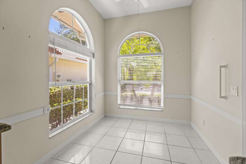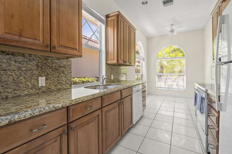 Bedford extended model featuring a spacious fenced backyard with room for a pool, perfect for entertaining. Interior highlights include a newer roof (2021) & HVAC in (2018), open spacious plan w/ great storage space, ceramic tile throughout the kitchen and great room. A lovely kitchen offering tall cabinetry, upgraded granite countertops & backsplash. Enjoy the light and bright great room with high ceiling space and built in shelving & lighting. The primary bedroom offers walk in closets plus additional closets, as well as double sinks and a private water closet in the ensuite bath. The den may be easily converted to a third bedroom or enjoyed as it is. Wonderful community centrally located and convenient to all that Palm Beach Gardens and the surrounding areas have to offer.