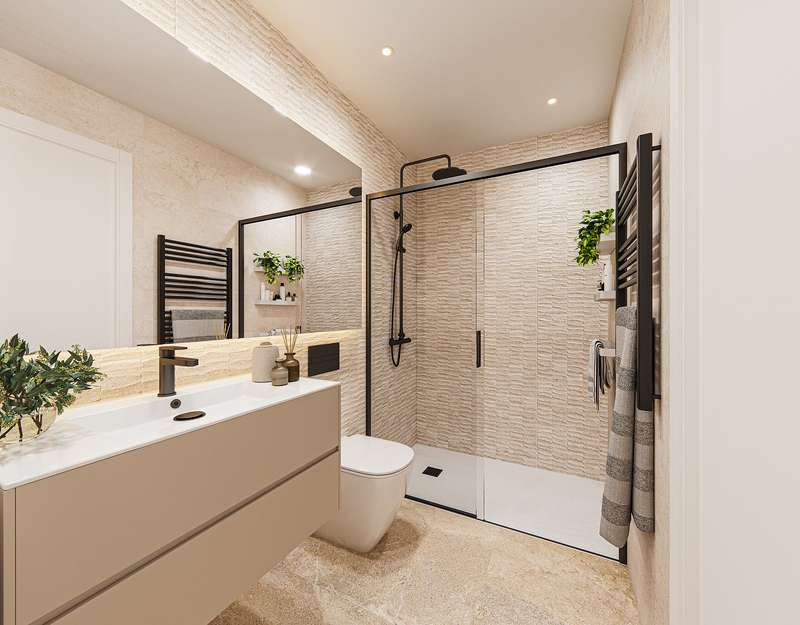 Inside these modern flats you have two or three double bedrooms with fitted wardrobes depending on the model, the master bedrooms have en-suite bathrooms with walk-in showers, they all have a second bathroom that also has a walk-in shower, a spacious open-plan kitchen and dining area, and a sizable living area.