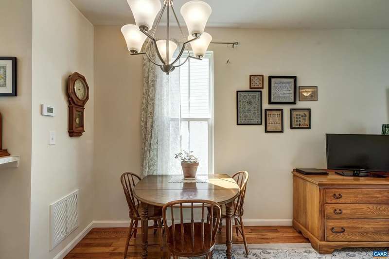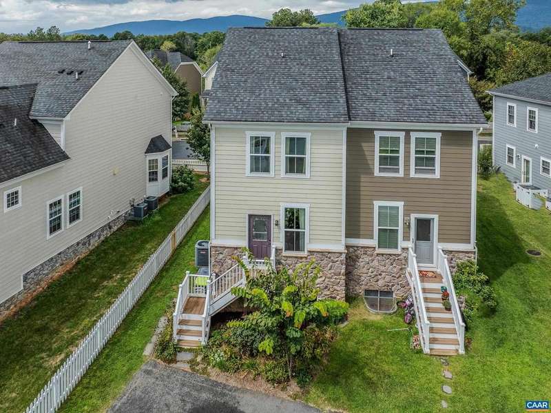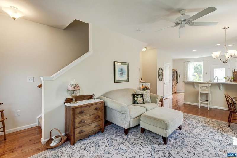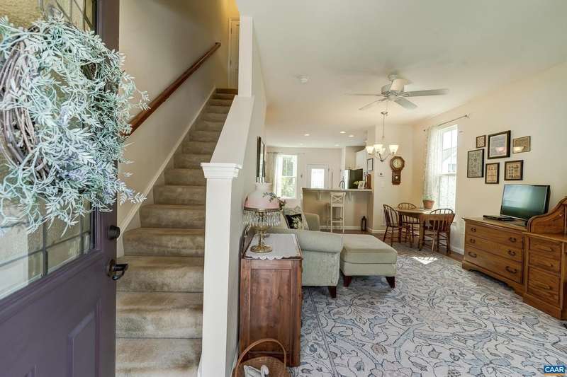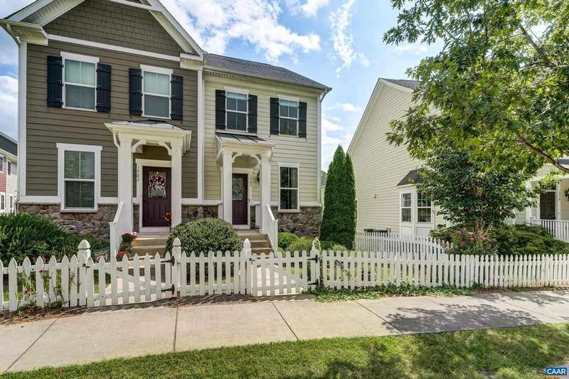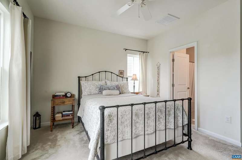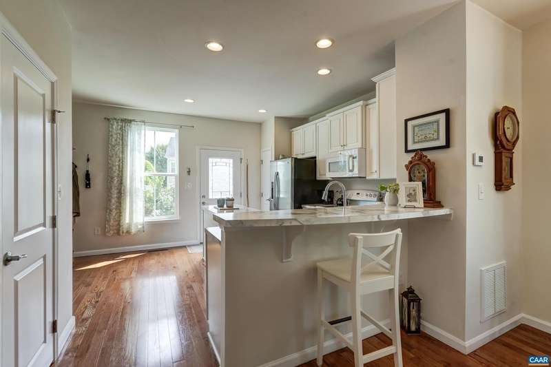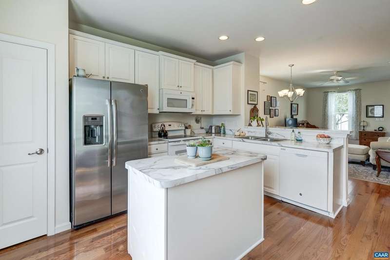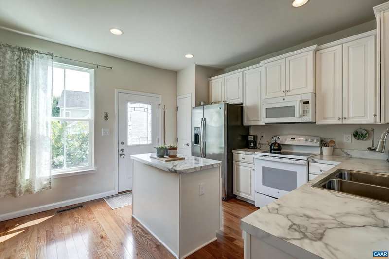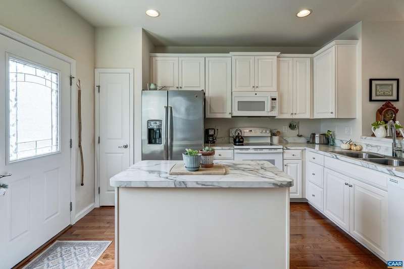 This charming duplex in Wickham Pond with a full basement is a rare find in Western Albemarle! With white picket fence and beautiful gardens and landscaping, this home looks like it's straight out of a fairytale. This light-filled home features an open main level floor plan with hardwood floors, two bedrooms on the second level plus a full basement that could be a great in-law or teen suite! The great room/dining area opens to the practical kitchen with white cabinets, island work surface and white appliances with stainless steel refrigerator. Upstairs, the primary bedroom features an ensuite bathroom with tub/shower combo, and two large closets. The second bedroom, full bathroom and stacked washer/dryer complete the second floor. The lower level boasts a large rec room, third bedroom and accessible bathroom with zero-step shower. Two private parking spots at the rear of the home too!,White Cabinets