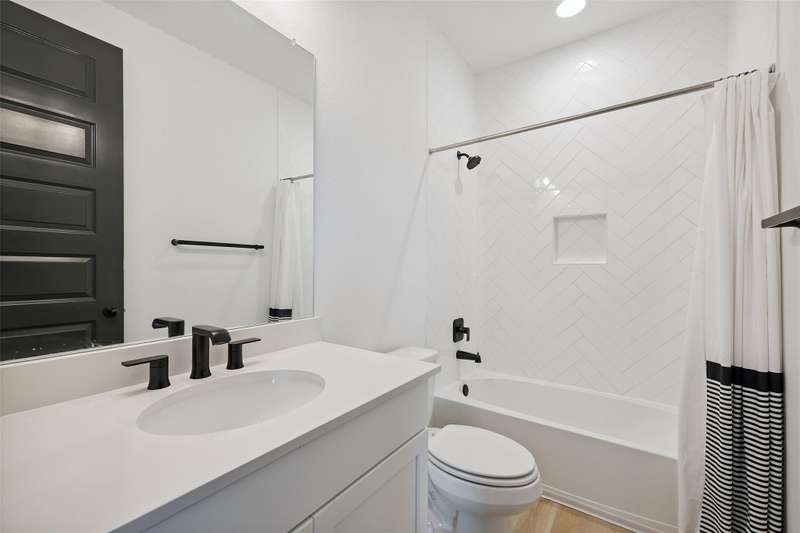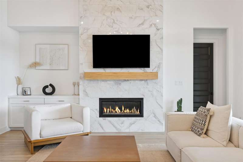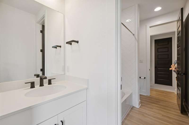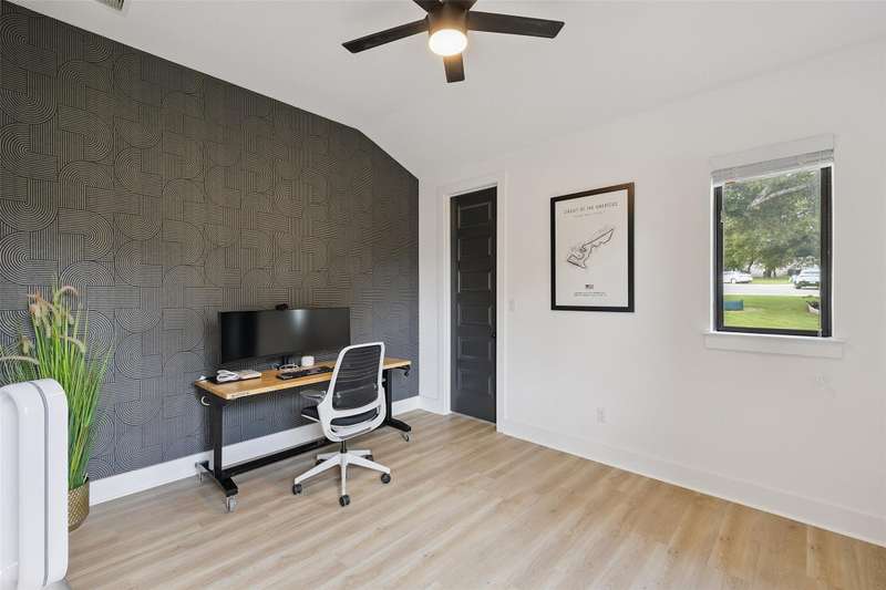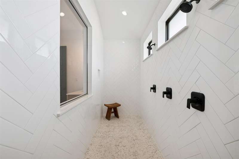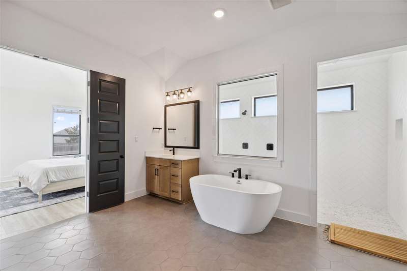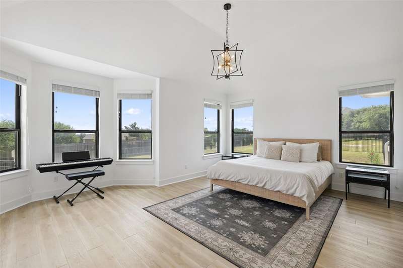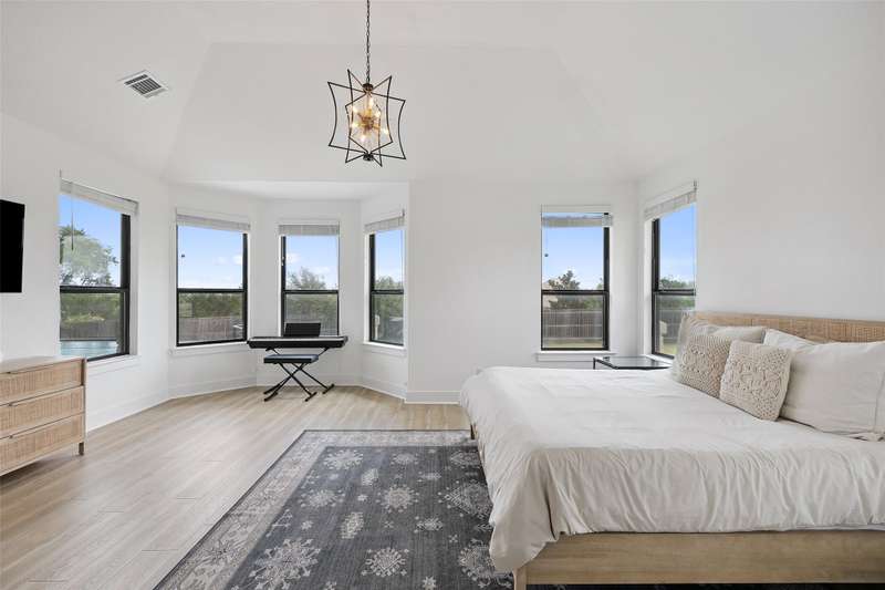 Out back, enjoy a heated faux-edge 2024-built infinity pool and hot tub, all WiFi-controlled and set against a treetop view with no rear neighbors. A 1225 ft^2 covered patio with outdoor TV hookups makes it easy to relax or entertain. The fully fenced outdoor area adds peace of mind for pets and kids, with plenty of space to add a playscape, batting cage, or trampoline. The primary suite is a retreat of its own, with bay windows, dual closets, a freestanding tub, and dual rainhead walk-in shower.
