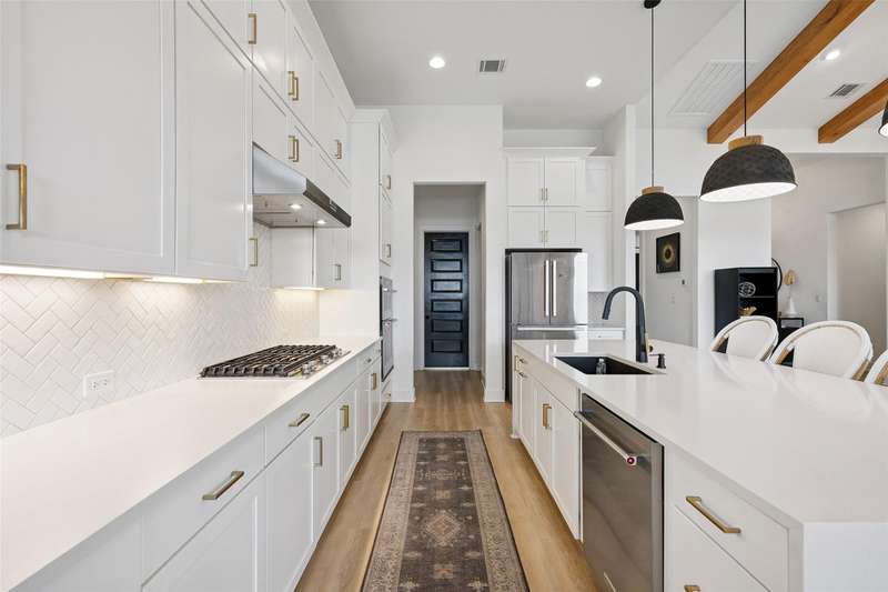 The kitchen features soft-close shaker cabinetry, high-end KitchenAid appliances, under-cabinet lighting, and a large island perfect for prep or casual dining. In the living room, vaulted ceilings with wooden beams frame a floor-to-ceiling tiled fireplace and expansive 3-panel glass sliders that open to the backyard oasis.