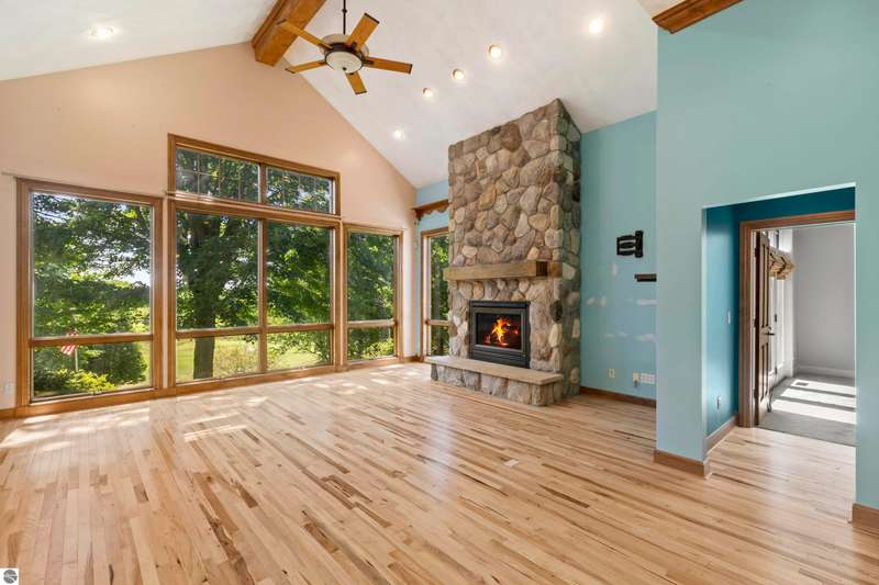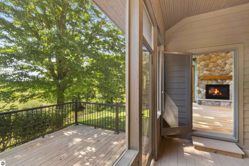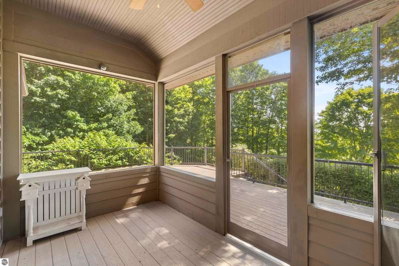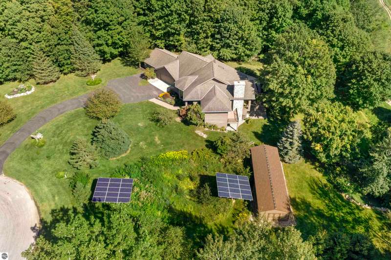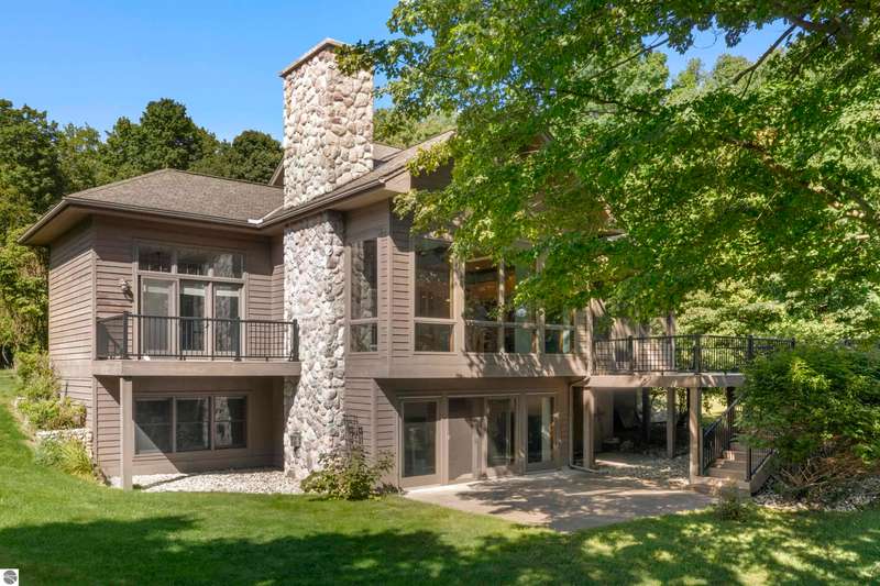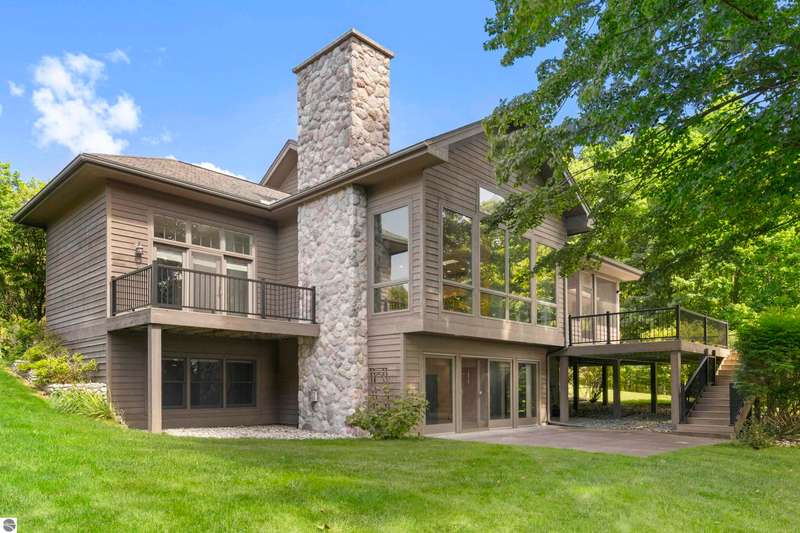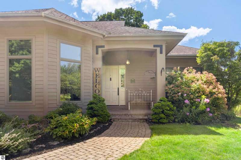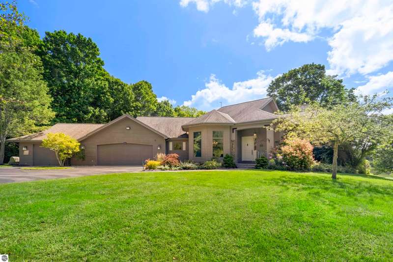 Custom-designed cedar home on over 7.5 acres with 600' of frontage along the 5th hole at Wolf River Golf Park. This 3 bed, 3.5 bath home features tall ceilings, a gourmet kitchen, main-floor primary suite with deck access, formal dining room, bonus/craft room, main-floor laundry, and birch/maple floors. Enjoy 2 gas fireplaces, a screened porch, and a walk-out lower-level guest suite with kitchenette. Outside offers an expansive deck, landscaped gardens, attached 2-car garage plus additional garage, and solar panels that reduce utility costs. A private, year-round retreat surrounded by wildlife and beautiful views. You're just east of the scenic M-22, Crystal Mountain's slopes and fairways only 20 minutes away, and the awe-inspiring Sleeping Bear Dunes just a 40-minute drive. Traverse City's vibrant food, wine, and music scene is an easy day trip, and Arcadia Bluffs Golf Club is just around the corner for world-class play and unforgettable sunsets.