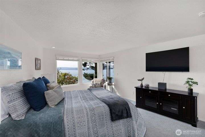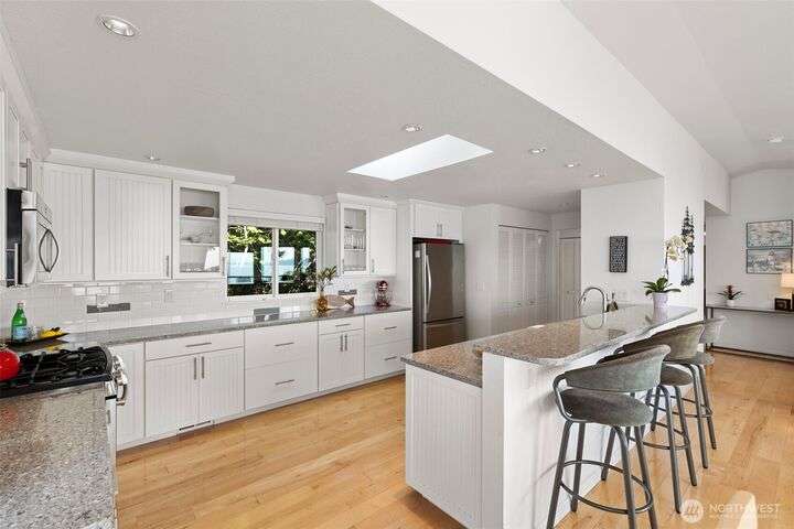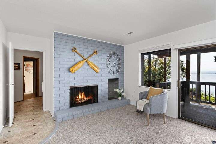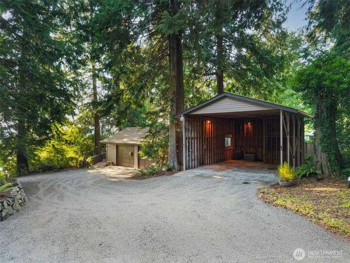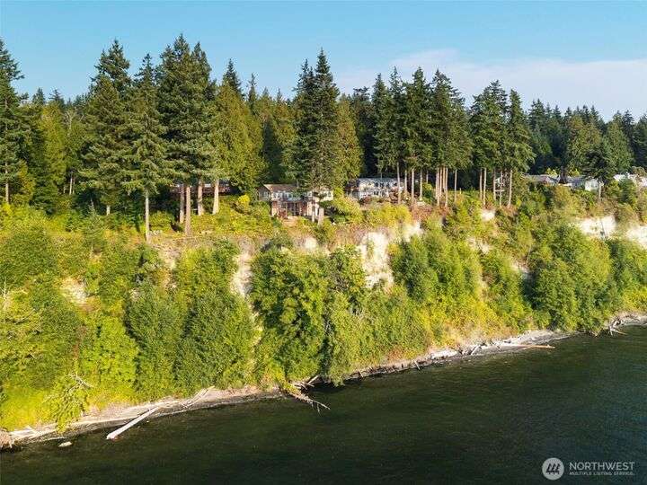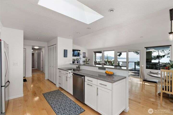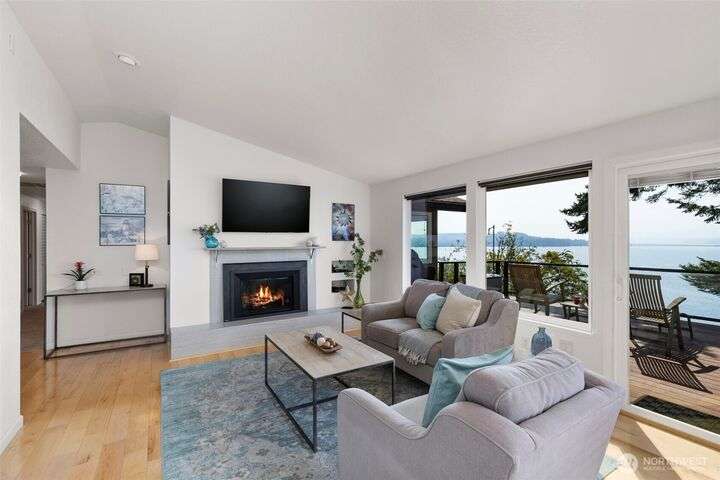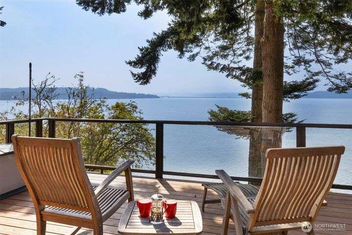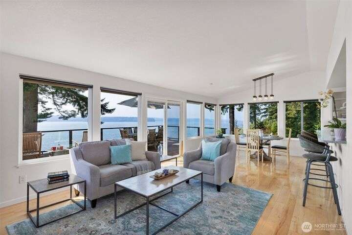 Perched above Hood Canal on 84' of waterfront, this 3,030sqft daylight rambler blends breathtaking views, quality craftsmanship & flexible living. Single-level living awaits on the main floor w/panoramic views of the Olympics & Hood Canal Bridge. Vaulted ceilings, maple floors & a chef’s kitchen w/granite, SS appliances & craftsman cabinetry round out the space. A spa-like primary suite w/CA closet, guest room, laundry, office & guest bath complete the main level. The lower level includes a full 2nd living quarters: kitchen, living/dining, bedroom, bath, laundry, bonus rooms, wood stove & private decks. Ideal for multi-gen living or guests. 720 sqft 2-car garage, RV carport, NEW exterior paint, comm. beach access & mins to Kingston ferries!