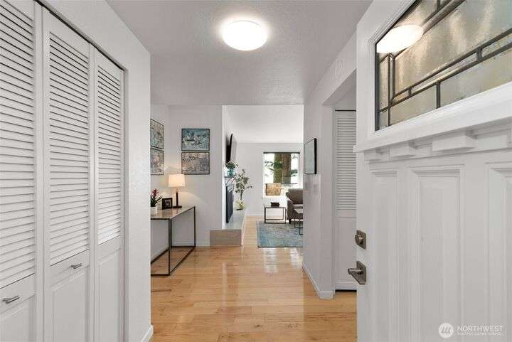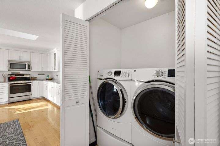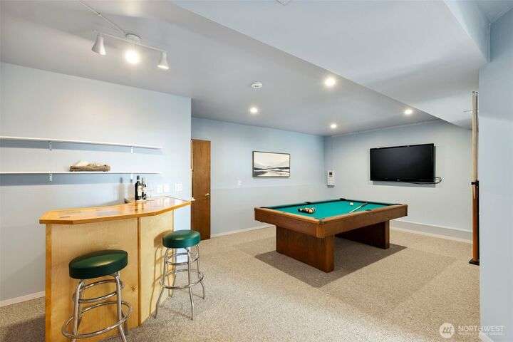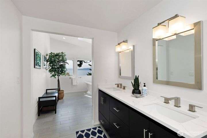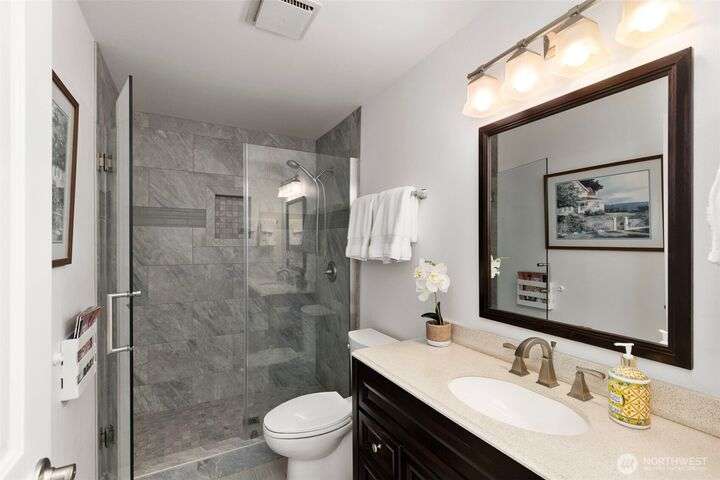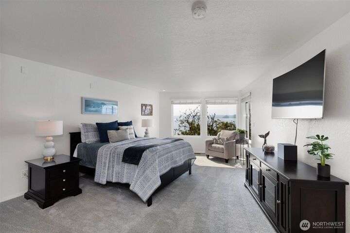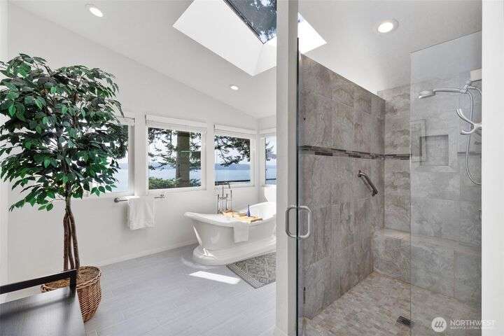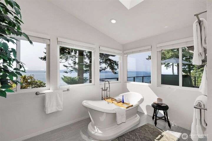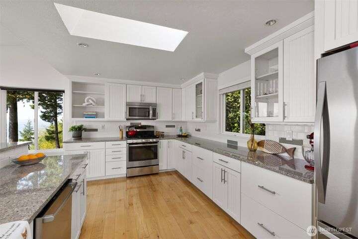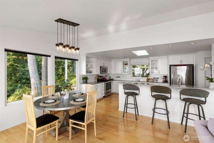 Perched above Hood Canal on 84' of waterfront, this 3,030sqft daylight rambler blends breathtaking views, quality craftsmanship & flexible living. Single-level living awaits on the main floor w/panoramic views of the Olympics & Hood Canal Bridge. Vaulted ceilings, maple floors & a chef’s kitchen w/granite, SS appliances & craftsman cabinetry round out the space. A spa-like primary suite w/CA closet, guest room, laundry, office & guest bath complete the main level. The lower level includes a full 2nd living quarters: kitchen, living/dining, bedroom, bath, laundry, bonus rooms, wood stove & private decks. Ideal for multi-gen living or guests. 720 sqft 2-car garage, RV carport, NEW exterior paint, comm. beach access & mins to Kingston ferries!