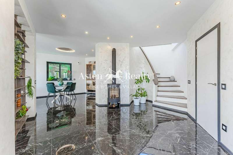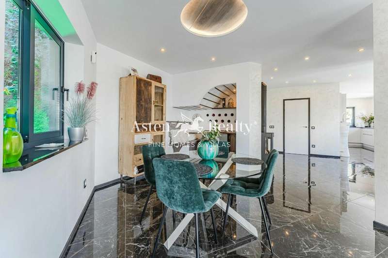 The ground floor consists of a spacious living room with a fireplace, a bar, a dining room, a guest toilet, and a fully equipped, high-quality Leicht kitchen with a pantry. This floor is surrounded by a large terrace with several shaded areas and a barbecue area.