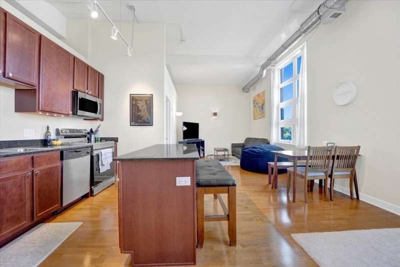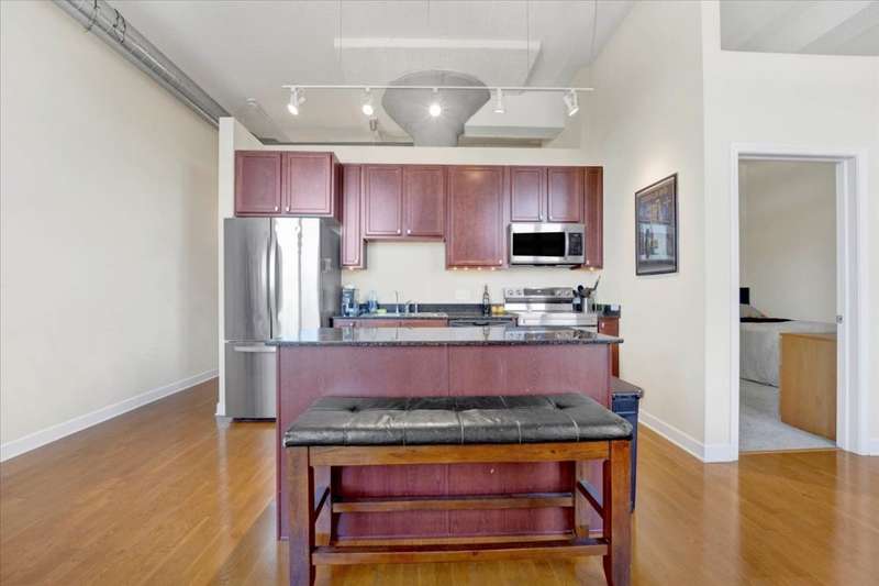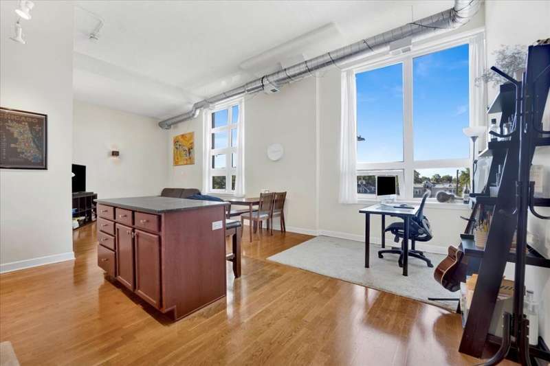 This unit will take your breath away! Filled with natural light coming through huge, North facing windows, features high ceilings and hardwood floors in the living area; this very spacious unit can be configured as a 2 bedroom or a 1 bedroom with an office/den; the modern kitchen features an island, SS appliances including a dishwasher and 42 cabinets; separate dining area, and a vast living room, ideal for true loft living; exposed beams, concrete pillars, high ceilings, all contribute to the uniqueness of this space; the large primary bedroom closet leads to a Jack & Jill bathroom with a walk in shower; hardwood floors, granite countertops, stainless steel appliances, and the convenience of an in-unit washer and dryer all add to the appeal of this fantastic home; Garage parking is included in the price! Tenant pays electric only.