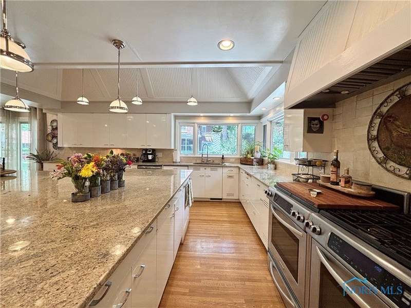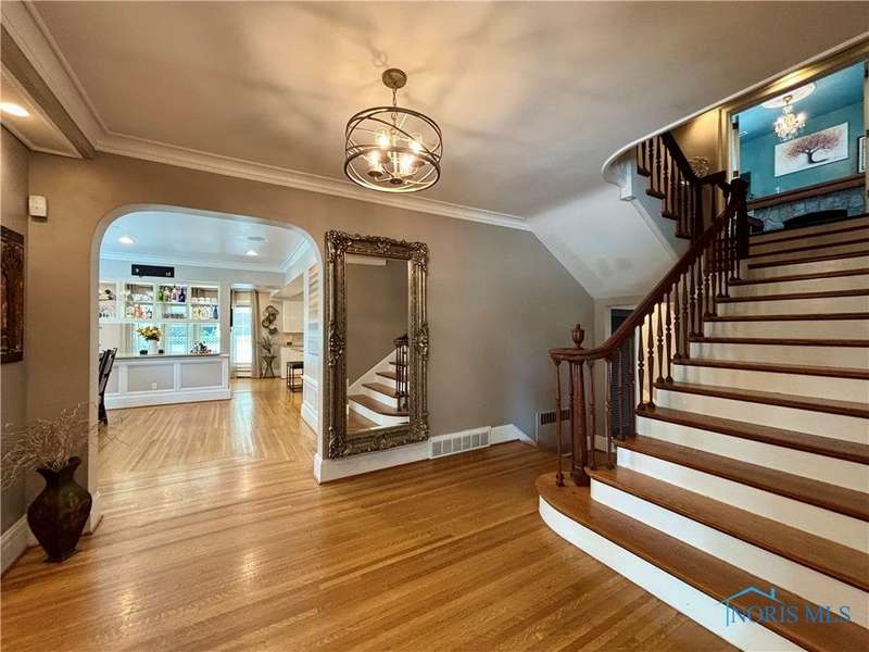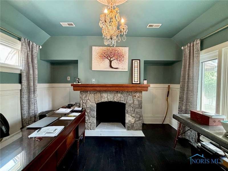 Old world charm w/ modern conveniences! This beautiful home includes an office w/ a fireplace, formal dining, 1st floor laundry, kitchen w/ pantry, finished basement, 4 beds, w/ potential 5th, and a living room / family room features a pass-through fireplace. The stunning kitchen has an island that was built for gatherings. Sunroom on main floor. Primary bed has walk-in closet w/ built-in vanity. Original hardwood and heated travertine floors. Irrigation system. Newer roof. The den has ventilation that can be used for a cigar lounge. Located on a double lot and close to the Maumee River.