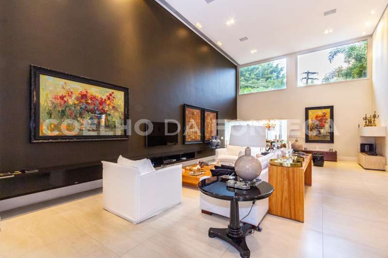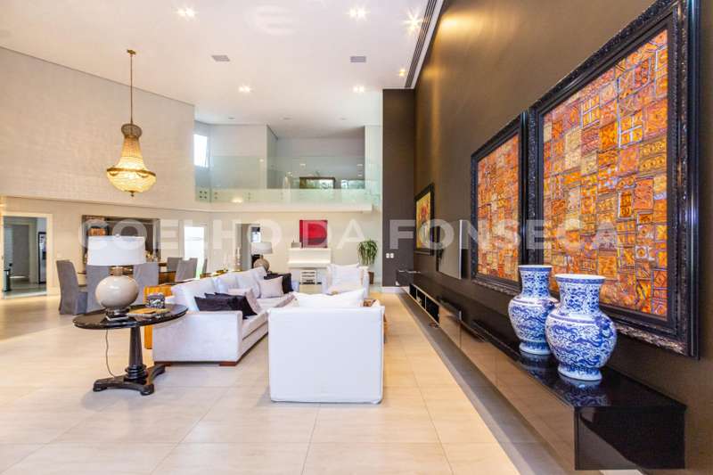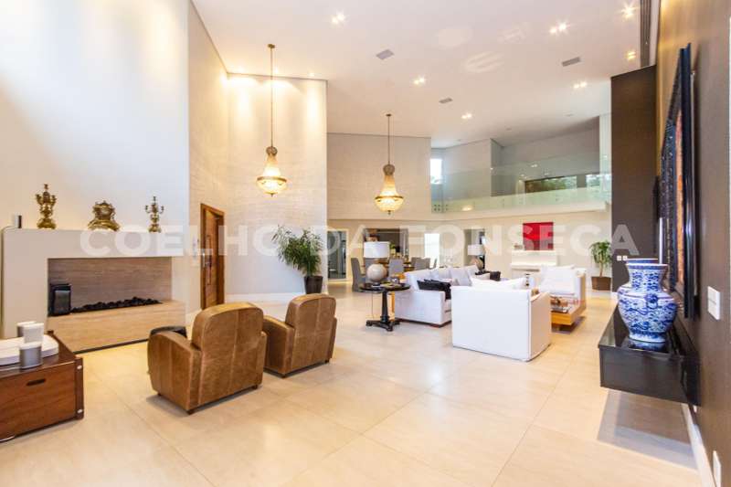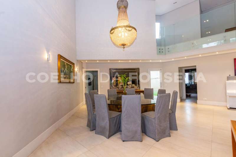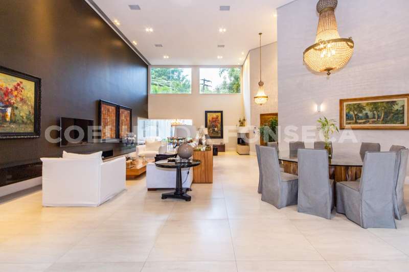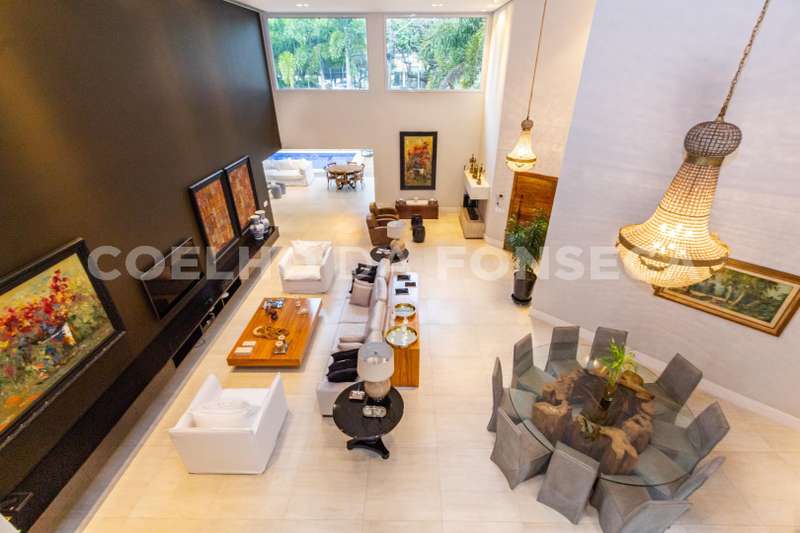 A área social, com impressionante pé-direito duplo, integra as salas de estar, jantar e TV, criando uma atmosfera espaçosa e elegante. O pé-direito elevado conecta os dois andares da casa, complementado por belíssimos lustres que capturam a atenção.
