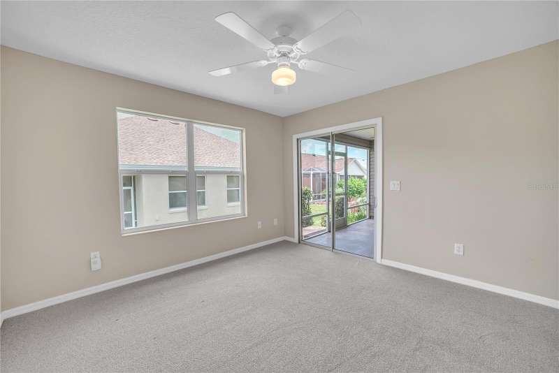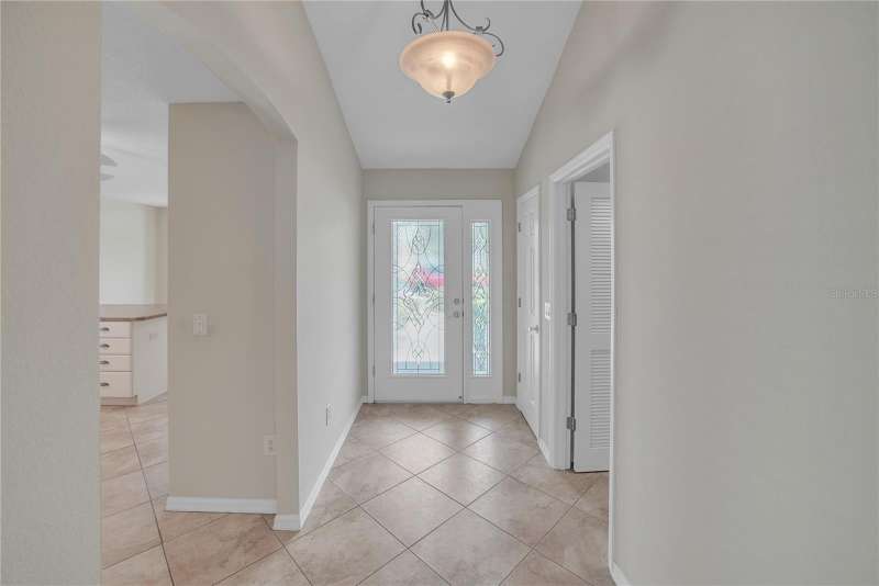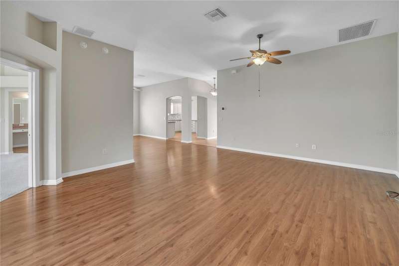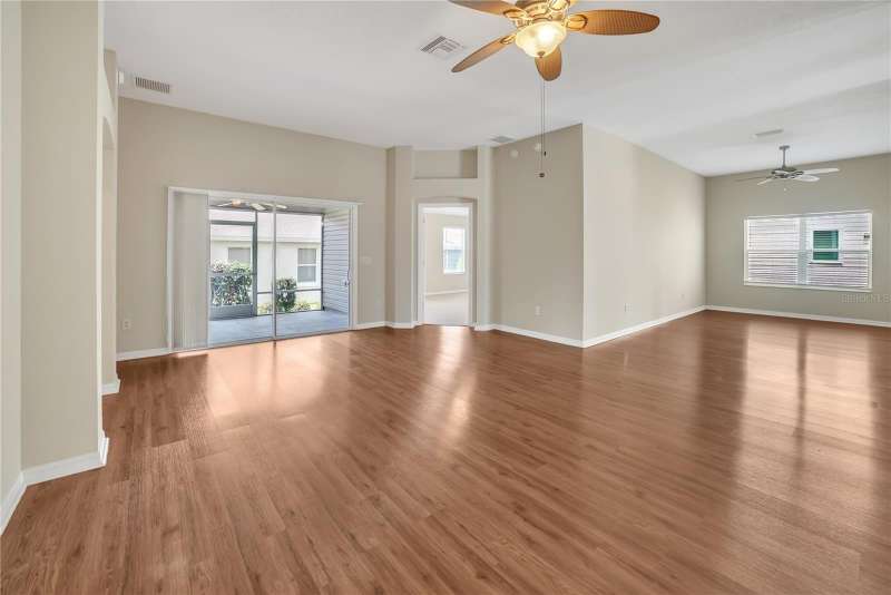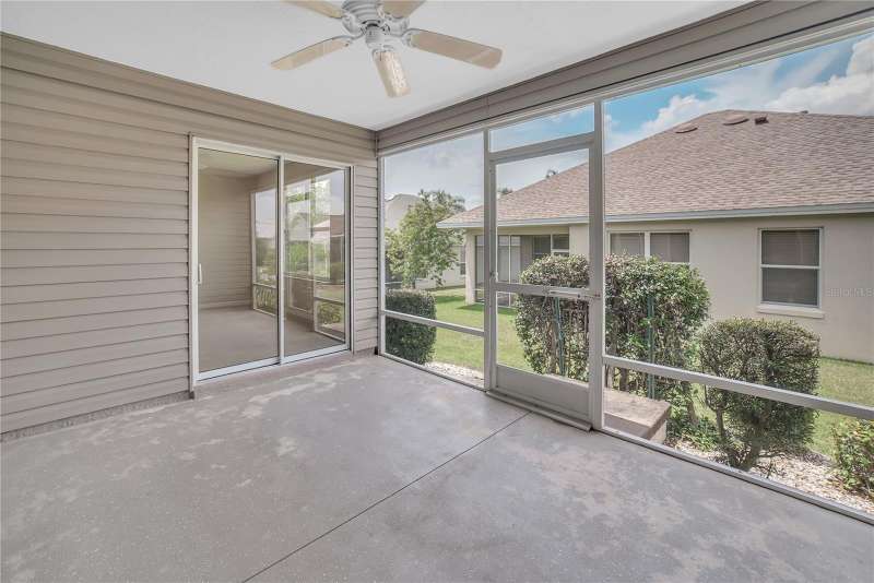 Welcome to Florida living at its finest in The Villages, Florida’s premiere retirement community! Located in the highly sought-after Village of Sabal Chase, this beautifully maintained, move-in ready home offers comfort, convenience, and charm just 1 mile from Lake Sumter Landing. This inviting residence boasts great curb appeal with low-maintenance vinyl siding and a welcoming front entry. Step inside to discover an open floor plan highlighted by volume ceilings and warm, rich hardwood floors that flow seamlessly through the spacious living and dining areas—perfect for entertaining or relaxing in style. The generously sized kitchen is a delight with ample cabinet and counter space, along with a cheerful eat-in area ideal for enjoying your morning coffee. A thoughtfully designed split-bedroom layout ensures privacy, with the primary suite featuring dual walk-in closets and an en suite bath complete with dual vanities, a private toilet room, and a separate shower. Two additional bedrooms with built-in closets share a convenient hall bathroom, offering comfortable accommodations for guests or hobbies. The laundry room is smartly positioned just off the garage for easy everyday living. At the end of a busy day filled with golf, pickleball, or socializing, you’ll love unwinding on your fully screen-enclosed porch—perfect for enjoying a peaceful evening breeze or entertaining friends in comfort.Additional highlights include a newer HVAC system (2021) and brand-new hot water heater (2025) for added peace of mind. Perfectly situated near Bacall & Bogart Executive Golf Courses, Lake Miona Recreation Center, and just minutes from both CR 466 and 466A—this home places you close to everything The Villages has to offer: golf, pickleball, pools, shopping, dining, medical facilities, and two of the area’s most vibrant town squares. Don’t miss this opportunity to own a slice of paradise in one of the most desirable neighborhoods in The Villages!