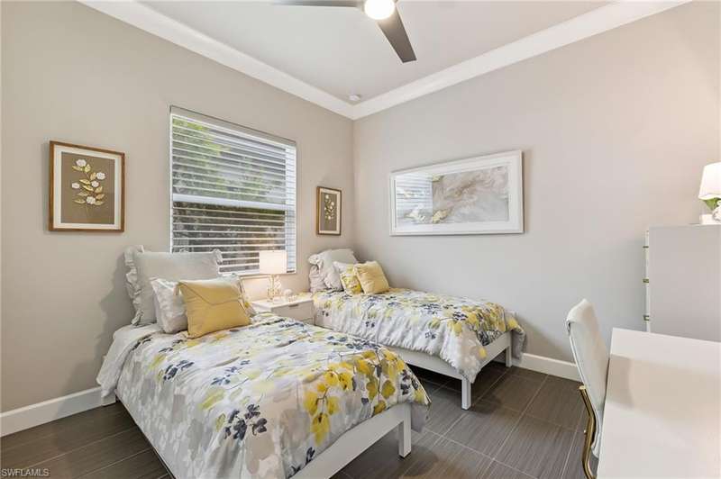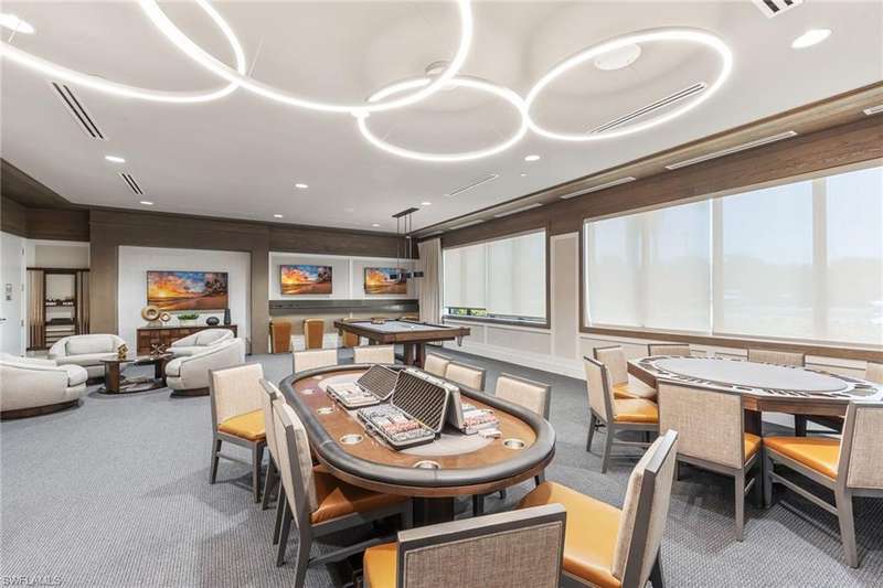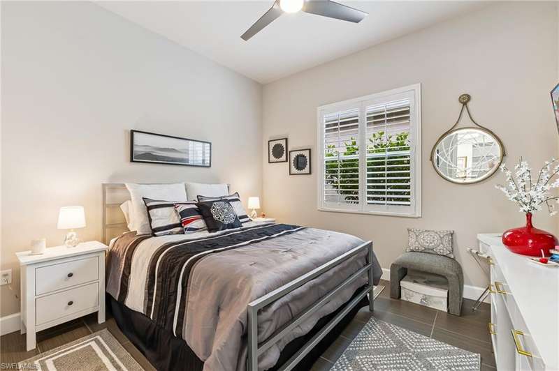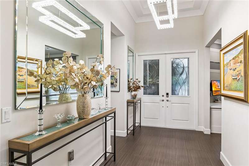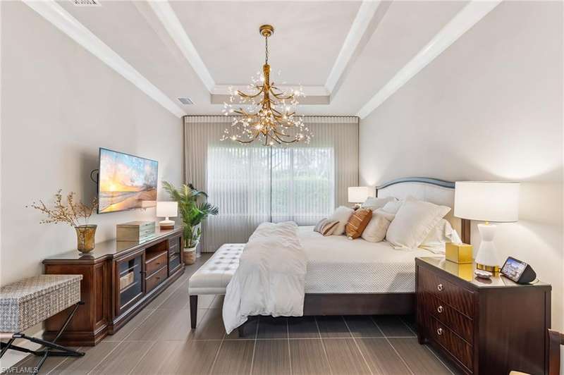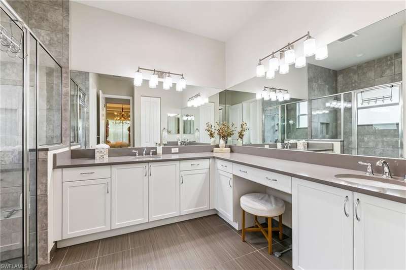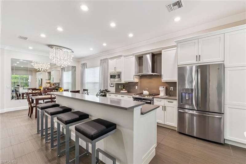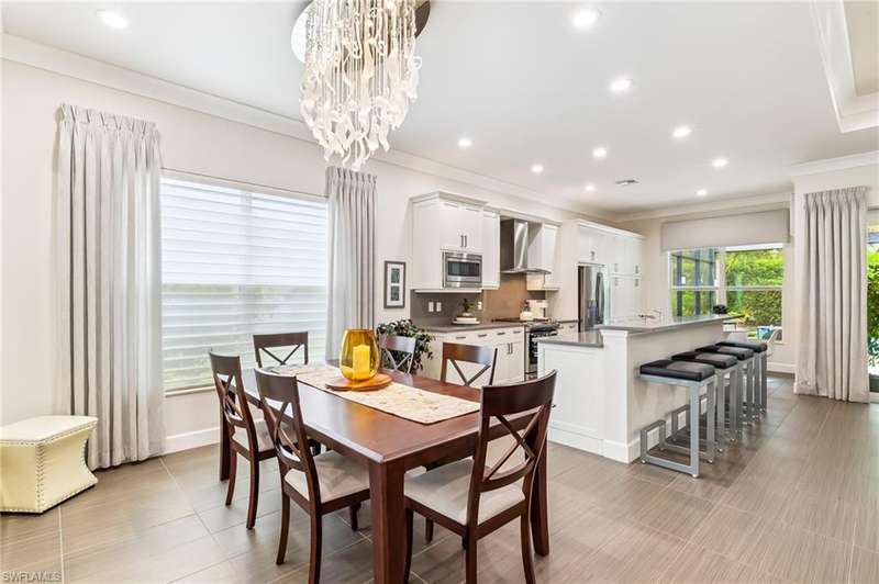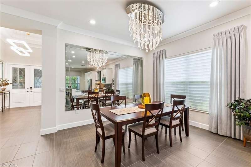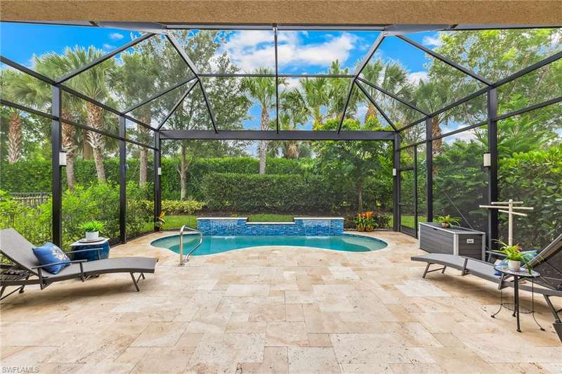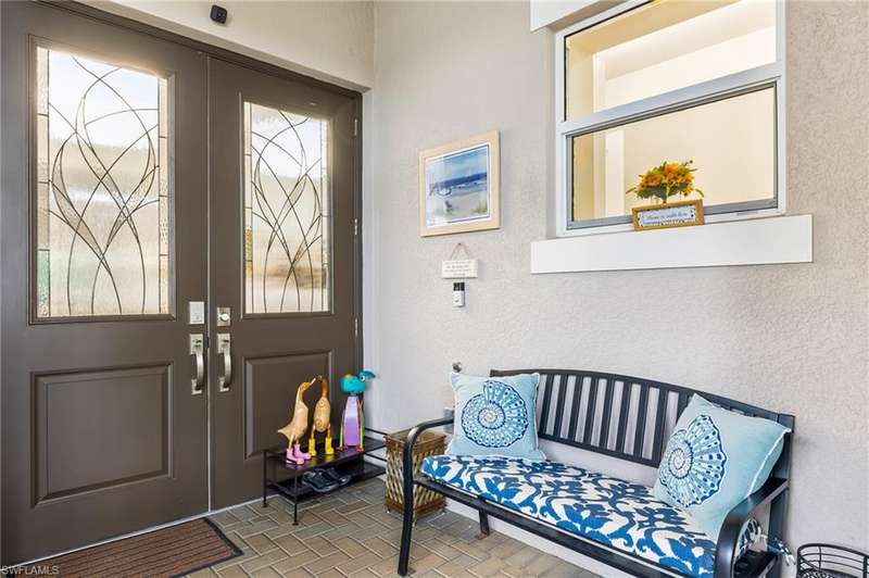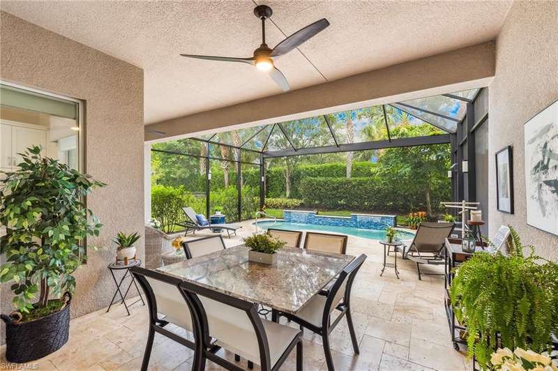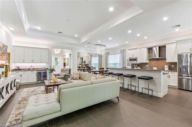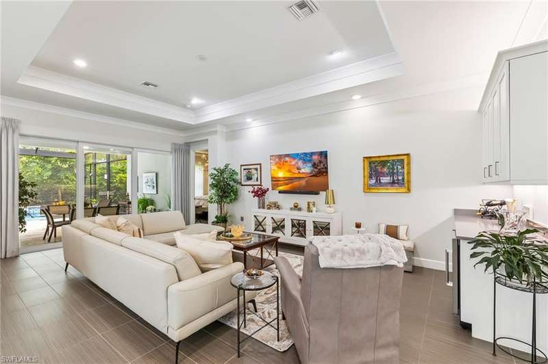 Price Improvement! Is the active adult lifestyle calling you? This well-appointed move-in ready Cabernet floorplan is positioned on a lushly landscaped PRIVATE lot with no homes behind. Built with storm protection in mind, the home includes hurricane-impact windows and doors as well as Storm Smart hurricane-rated motorized shades and a WHOLE-HOUSE NATURAL GAS GENERATOR (providing uninterrupted power and peace of mind). Throughout the home you will see embellishments of designer LED lighting, premium fixtures and ceiling fans, crown molding, and custom motorized window treatments, tankless hot water heater, whole-house water treatment system, and landscape lighting. The great room features a custom bar with cabinetry and a wine refrigerator, perfect for hosting guests. Offering nearly 2,200 square feet of refined living space, this residence features gorgeous porcelain tile flooring throughout (no carpet anywhere) creating a sleek, clean, and low-maintenance environment that enhance