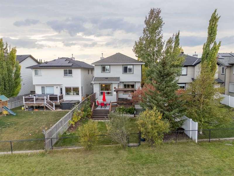 A rare find in the beautiful community of Tuscany! This meticulously maintained 4 bedroom, 3.5 bathroom home backs directly onto green space with direct views of COP. From the moment you walk in, you’ll be impressed by the open-to-above foyer and the warmth of the freshly refinished natural hardwood floors throughout the main level. The open-concept kitchen features a central island, corner pantry, and stainless steel appliances, overlooking the inviting living room with its elegant gas fireplace. A spacious dining area flows seamlessly onto the massive backyard, complete with a two-tiered deck and ultimate privacy thanks to the greenspace behind. The main floor is rounded out with a 2-pc bathroom and a convenient laundry room. Upstairs, you’ll find a bright and spacious bonus room featuring large west-facing windows and a built-in surround sound setup—perfect for entertaining or as a family play area. The primary retreat includes a 4-pc ensuite with a relaxing soaker tub, walk-in closet, and built-in wardrobe. Two more generously sized bedrooms and another full bathroom complete the upper level. The fully finished basement (2022) offers a large family room with a cozy electric fireplace, an additional bedroom, a 4-pc bathroom, and ample storage. Step outside into your private backyard oasis with lush landscaping, a two-tiered deck, and a hot tub overlooking the green space—with no neighbours behind. Other updates include: Refinished hardwood flooring (2025), new roof (2023), washer (2022), dryer (2024), dishwasher (2023), and hot water tank (2025). Perfectly located just minutes from Stoney Trail, top schools, shopping, restaurants, and Calgary’s extensive bike path system—this is the ideal home for family living.