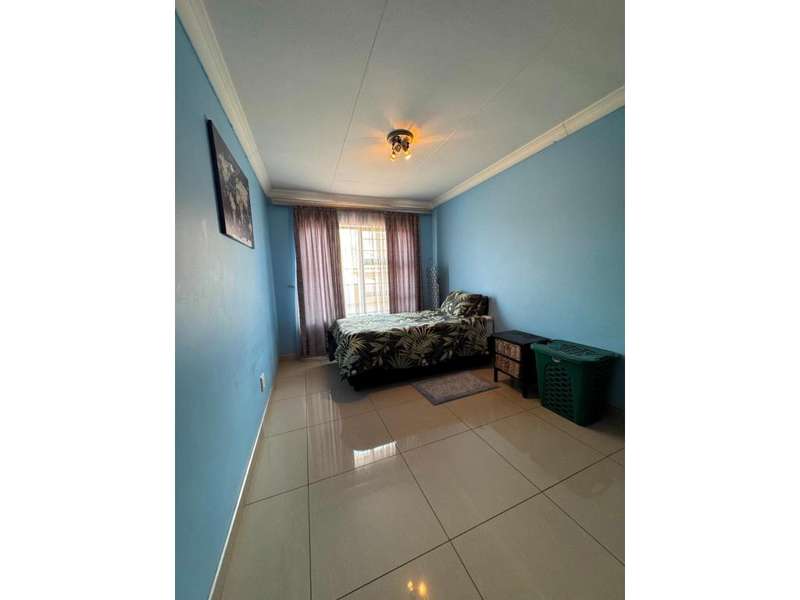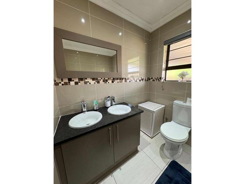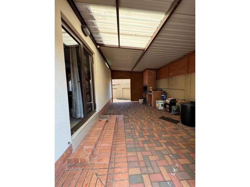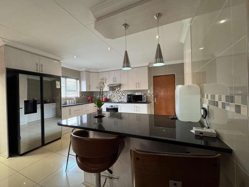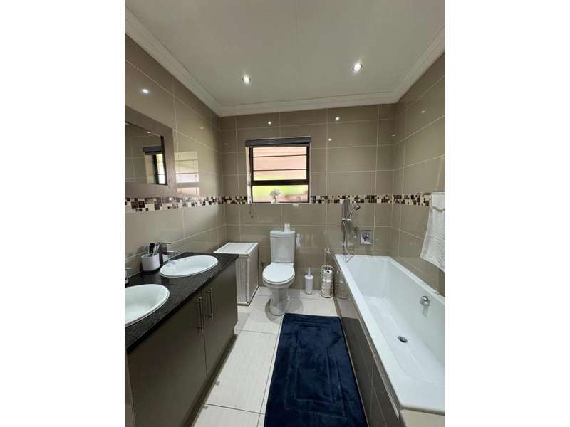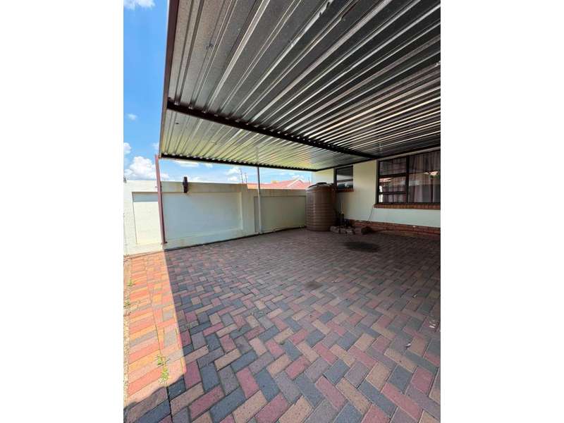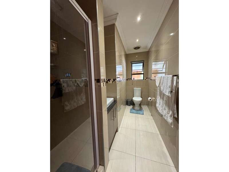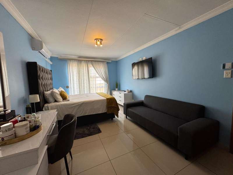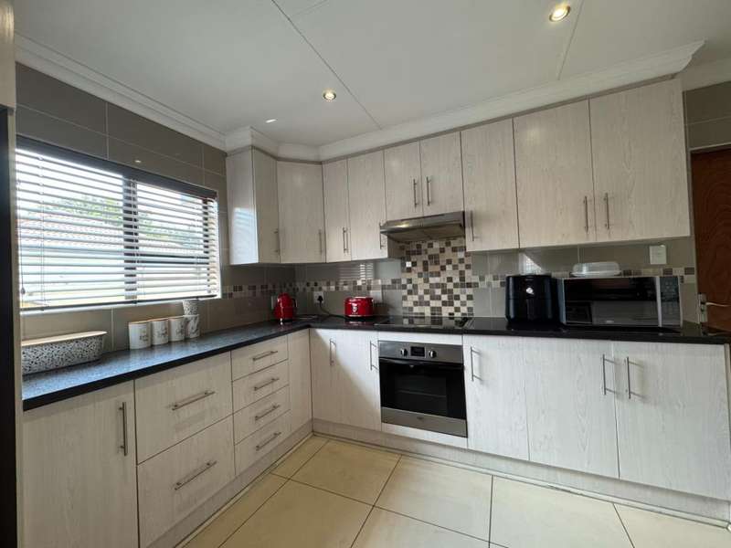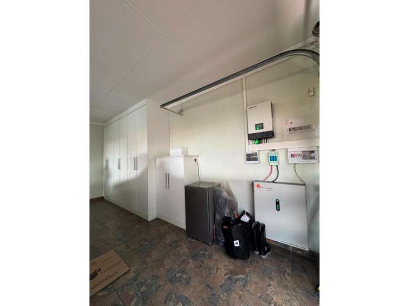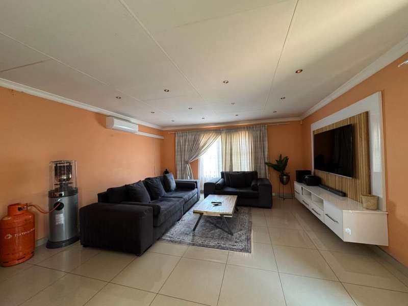 Modern Family Home with Exceptional Features Welcome to this stunning 3-bedroom, 2-bathroom family home, complete with a spacious 4-car garage, offering the perfect blend of comfort, convenience, and style. Interior Features: The heart of the home is a modern, open-plan kitchen and lounge area. The kitchen boasts sleek finishes, an electric stove, and ample counter space. A long passage from the living area leads to: A family bathroom featuring a shower, toilet, and basin. Three generously sized bedrooms, all fitted with built-in cupboards. A luxurious ensuite master bedroom with ample storage space. The ensuite bathroom is equipped with his-and-her basins, a bathtub, and a toilet. Outdoor Features: Step out from the lounge to a covered, built-in braai area, perfect for entertaining guests. A well-maintained garden offers a peaceful retreat for relaxation and play. Additional Amenities: Stay comfortable year-round with air conditioning. The property is equipped with a JoJo tank, ensuring water security, and a 7.5 kVA solar inverter system for energy efficiency. For added safety, the home is surrounded by an electric fence. This property is perfect for families seeking a modern lifestyle in a secure and serene environment. Don?ÇÖt miss the opportunity to make this your forever home!