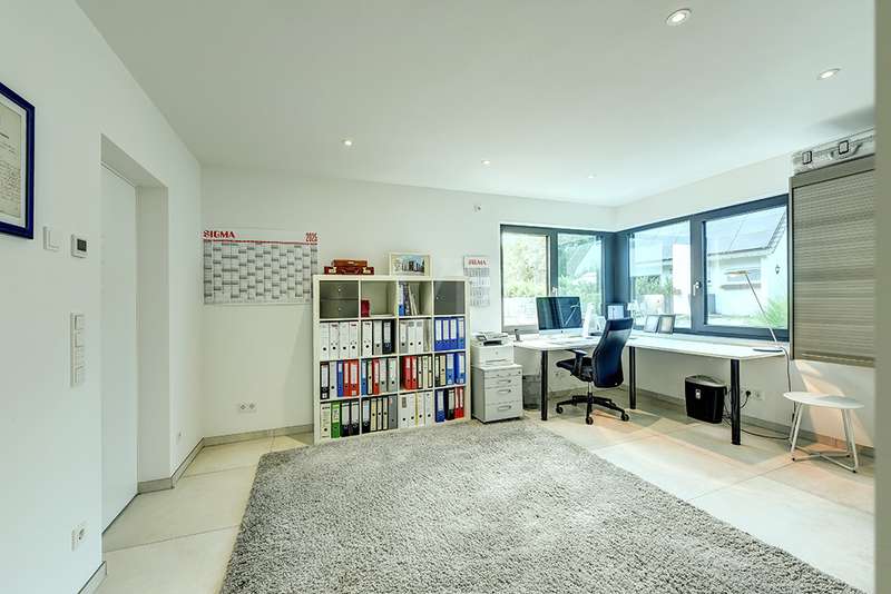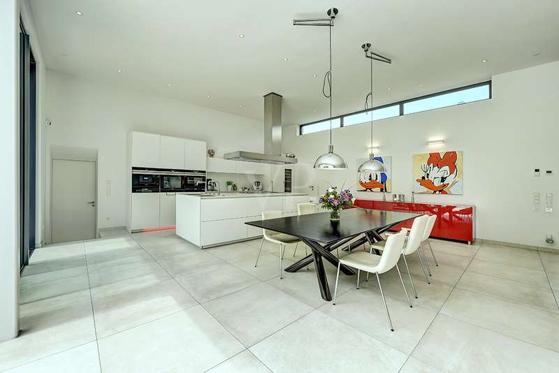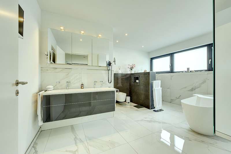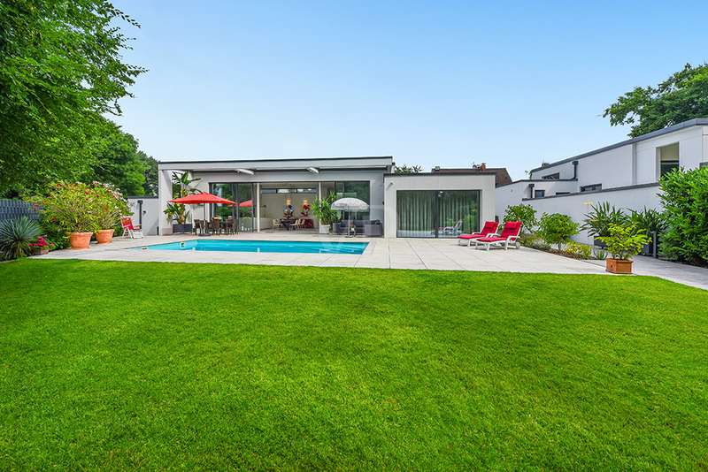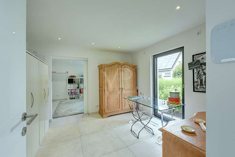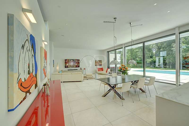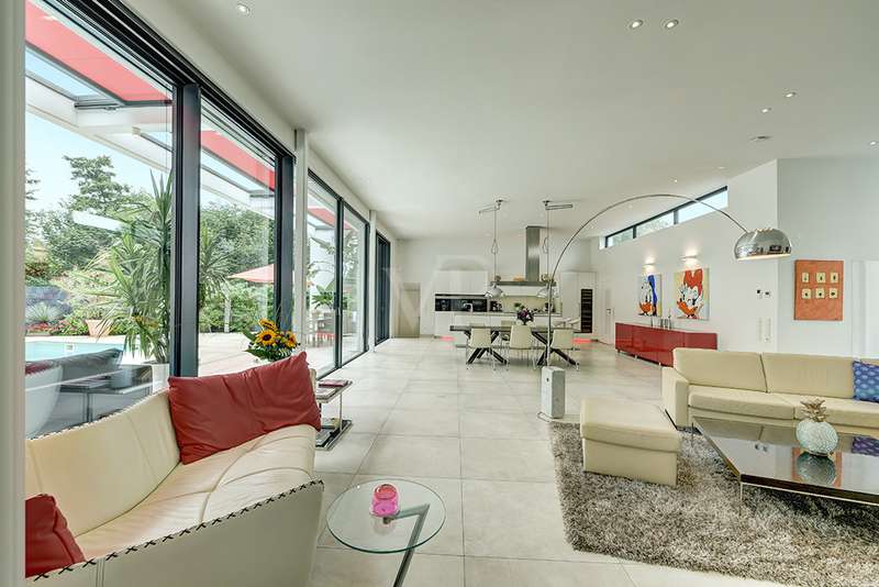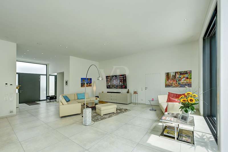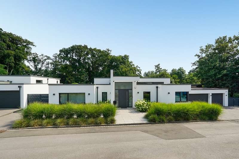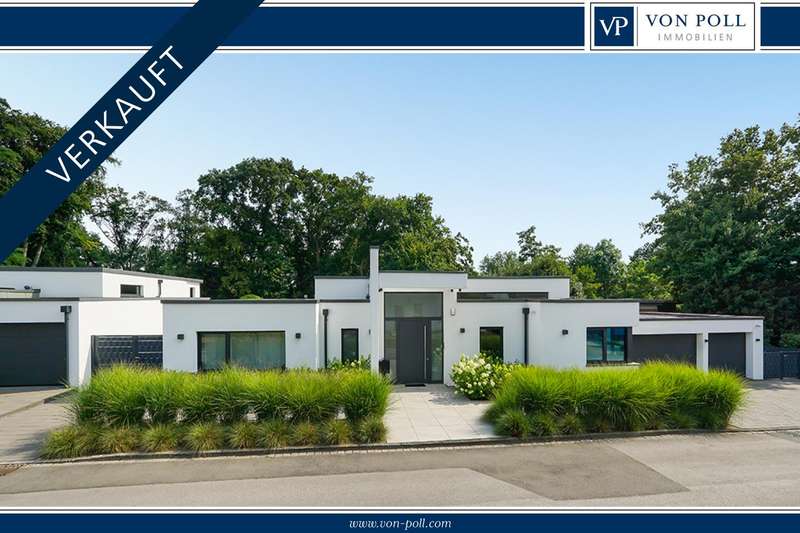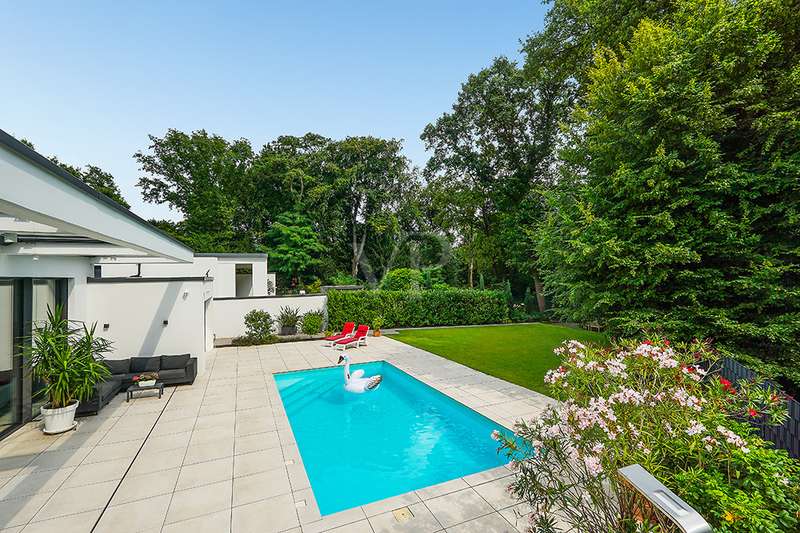 Welcome to a unique opportunity that combines the highest standards of modern living with exceptional architecture. This as-new Bauhaus-style villa was completed in 2021 and is located in a quiet cul-de-sac right on the edge of the forest. With a living space of approx. 212 m² on a generous plot of approx. 1,586 m², this property combines solid construction - including partial concrete and KS masonry with a thickness of 36.5 - 54.5 cm in a thermal insulation system - with innovative technology and exclusive furnishings. The house thus achieves the Kfw 40 standard as an A-plus house with excellent energy values!!! The prestigious driveway and the impressive entrance lead into the heart of the property: cooking, dining and living are harmoniously combined in a spacious loft-like room concept. The Thelen design kitchen, equipped with high-quality branded electrical appliances, offers a cooking island with induction wok tepanyiaki hob, oven, steam cooker, wine fridge, refrigerator, dishwasher, two sinks and a powerful extractor fan. The floor coverings made of high-quality porcelain stoneware in 80x80 format were laid uniformly inside and out and underline the homogeneous appearance. Large, 3.20-metre-high aluminum windows with the highest insulation level and safety glass, electric external blinds or aluminum roller shutters (insulated and controllable via Bluetooth), as well as skylights flood the entire house with light. Over-height, flush-fitting interior doors (invasive flat closing) and impressive ceiling heights create a special sense of space. The master bedroom boasts custom-made built-in closets and direct access to the garden. The adjoining master bathroom is equipped with Keuco furniture and sanitary ware and features exquisite marble-look surfaces, an experience shower, WC and bidet as well as a free-standing bathtub. A total of 5.5 rooms are spread over the living space. Two further rooms are connected by a sliding door and can also be accessed separately from the hallway and living area. A guest bathroom with a walk-in shower is conveniently located next to an additional bedroom. A custom-made built-in wardrobe in the hallway provides storage space. The property includes an oversized terrace across the entire width of the house. The floating concrete elements along the living room are a special feature. Three electrically operated awnings can be controlled individually and, if desired, fill the open interior spaces to provide you with sun and rain protection on the terrace. Here you will find space to create your lounge seating set and your outdoor dining area. Another highlight is the 8.00 x 4.00 m pool with pool heating, automatic water quality control, pool robot and cover), outdoor shower and another terrace at the edge of the forest. The garden is equipped with a fully automatic irrigation and lighting system as well as a lawn robot and offers a variety of uses. A separate forest terrace invites you to linger. A 3-car garage with electric sectional doors and built-in cupboards, four outdoor parking spaces and a gate access to the garden are available for your vehicle fleet. Particularly suitable for driving into the garden with a trailer or for parking additional cars. The utility room and laundry room are accessible via the garage and the living area. The highest security standards are guaranteed by a video surveillance system. An energy-efficient Buderus geothermal heat pump with underfloor cooling meets the KfW 40 standard and guarantees sustainable heating and cooling technology by means of underfloor heating throughout the house. This property represents luxury of the highest living standards at all levels - come and see for yourself during a personal viewing.