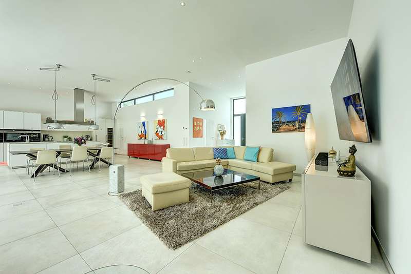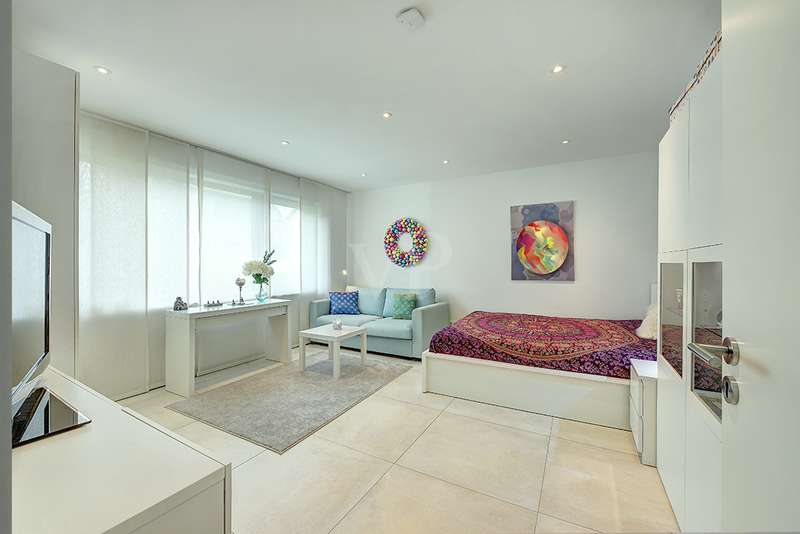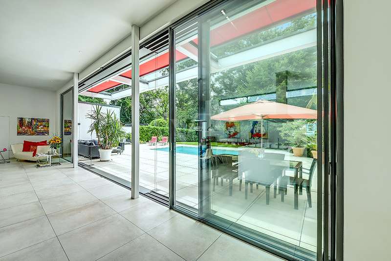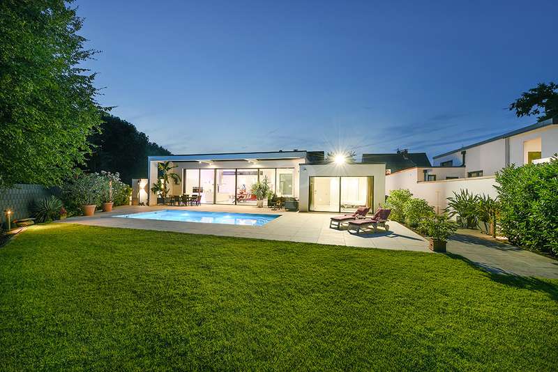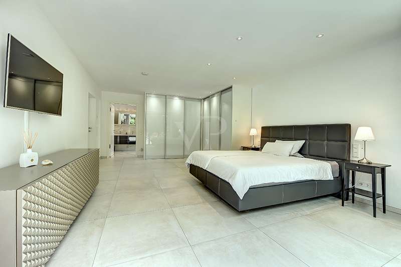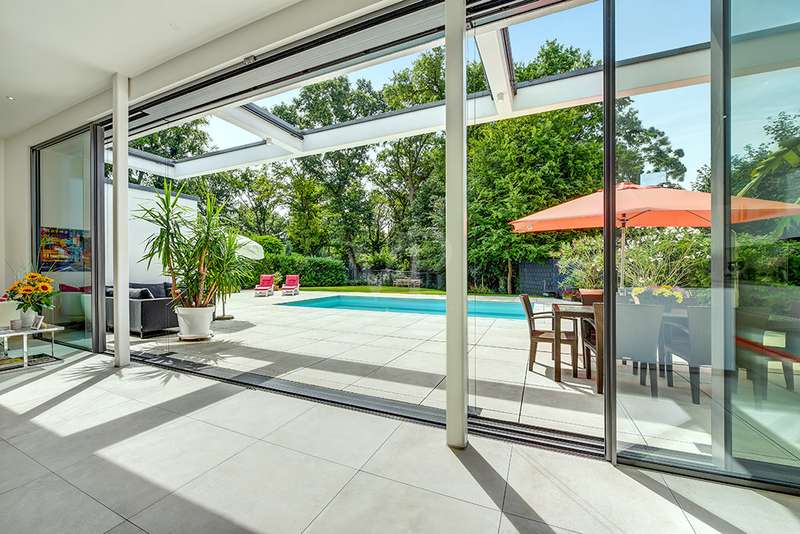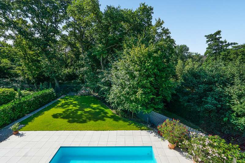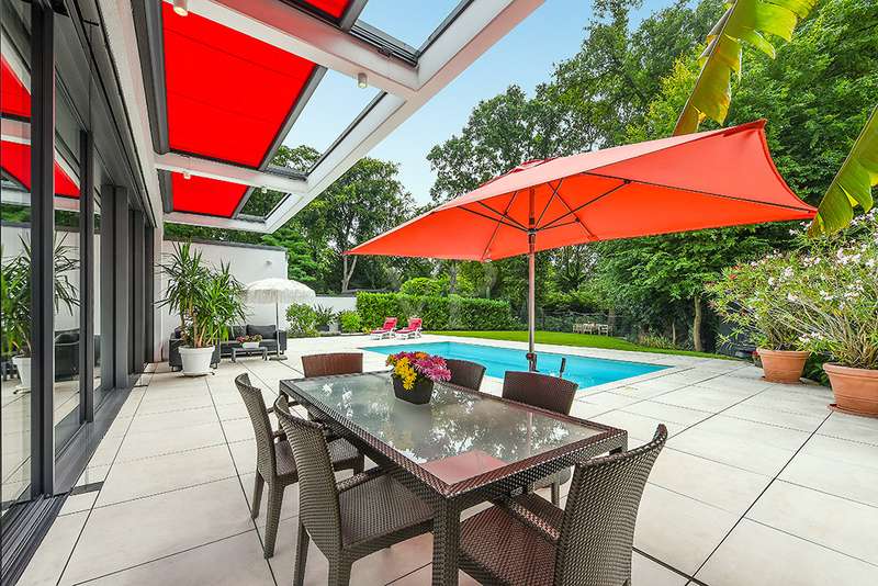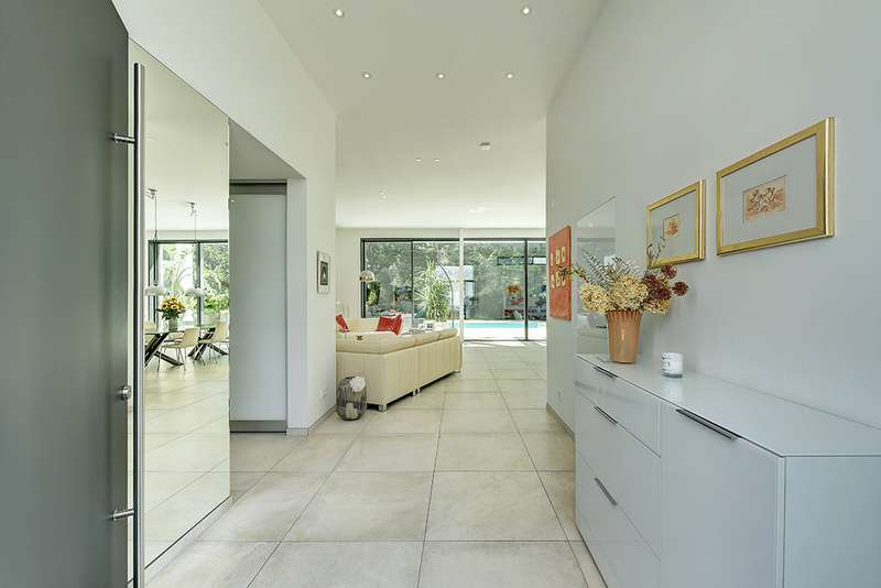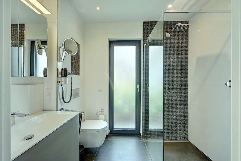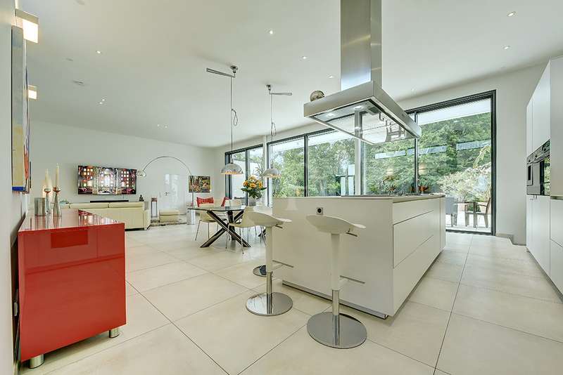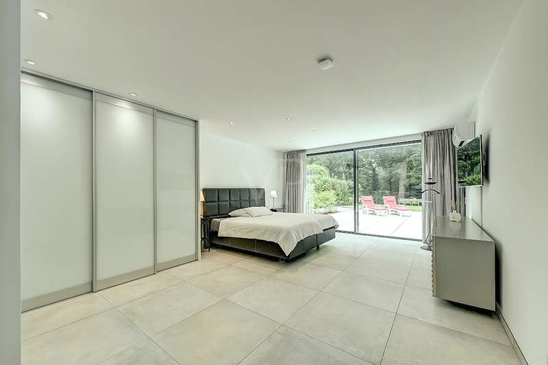 Welcome to a unique opportunity that combines the highest standards of modern living with exceptional architecture. This as-new Bauhaus-style villa was completed in 2021 and is located in a quiet cul-de-sac right on the edge of the forest. With a living space of approx. 212 m² on a generous plot of approx. 1,586 m², this property combines solid construction - including partial concrete and KS masonry with a thickness of 36.5 - 54.5 cm in a thermal insulation system - with innovative technology and exclusive furnishings. The house thus achieves the Kfw 40 standard as an A-plus house with excellent energy values!!! The prestigious driveway and the impressive entrance lead into the heart of the property: cooking, dining and living are harmoniously combined in a spacious loft-like room concept. The Thelen design kitchen, equipped with high-quality branded electrical appliances, offers a cooking island with induction wok tepanyiaki hob, oven, steam cooker, wine fridge, refrigerator, dishwasher, two sinks and a powerful extractor fan. The floor coverings made of high-quality porcelain stoneware in 80x80 format were laid uniformly inside and out and underline the homogeneous appearance. Large, 3.20-metre-high aluminum windows with the highest insulation level and safety glass, electric external blinds or aluminum roller shutters (insulated and controllable via Bluetooth), as well as skylights flood the entire house with light. Over-height, flush-fitting interior doors (invasive flat closing) and impressive ceiling heights create a special sense of space. The master bedroom boasts custom-made built-in closets and direct access to the garden. The adjoining master bathroom is equipped with Keuco furniture and sanitary ware and features exquisite marble-look surfaces, an experience shower, WC and bidet as well as a free-standing bathtub. A total of 5.5 rooms are spread over the living space. Two further rooms are connected by a sliding door and can also be accessed separately from the hallway and living area. A guest bathroom with a walk-in shower is conveniently located next to an additional bedroom. A custom-made built-in wardrobe in the hallway provides storage space. The property includes an oversized terrace across the entire width of the house. The floating concrete elements along the living room are a special feature. Three electrically operated awnings can be controlled individually and, if desired, fill the open interior spaces to provide you with sun and rain protection on the terrace. Here you will find space to create your lounge seating set and your outdoor dining area. Another highlight is the 8.00 x 4.00 m pool with pool heating, automatic water quality control, pool robot and cover), outdoor shower and another terrace at the edge of the forest. The garden is equipped with a fully automatic irrigation and lighting system as well as a lawn robot and offers a variety of uses. A separate forest terrace invites you to linger. A 3-car garage with electric sectional doors and built-in cupboards, four outdoor parking spaces and a gate access to the garden are available for your vehicle fleet. Particularly suitable for driving into the garden with a trailer or for parking additional cars. The utility room and laundry room are accessible via the garage and the living area. The highest security standards are guaranteed by a video surveillance system. An energy-efficient Buderus geothermal heat pump with underfloor cooling meets the KfW 40 standard and guarantees sustainable heating and cooling technology by means of underfloor heating throughout the house. This property represents luxury of the highest living standards at all levels - come and see for yourself during a personal viewing.