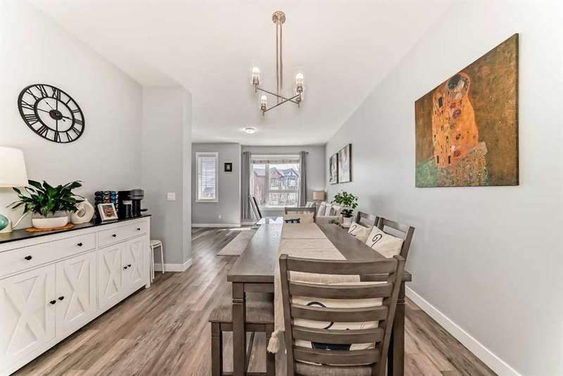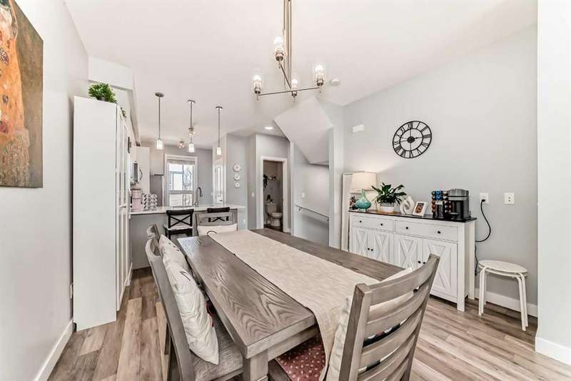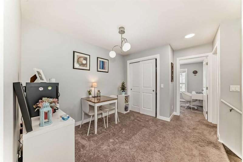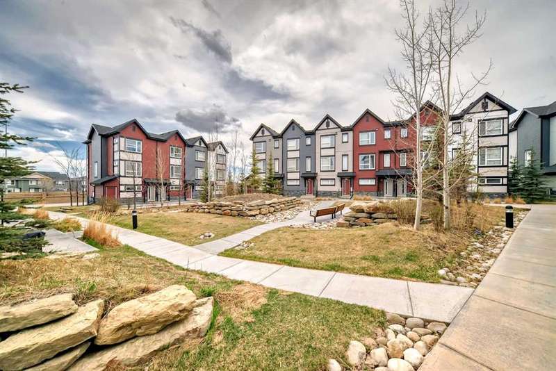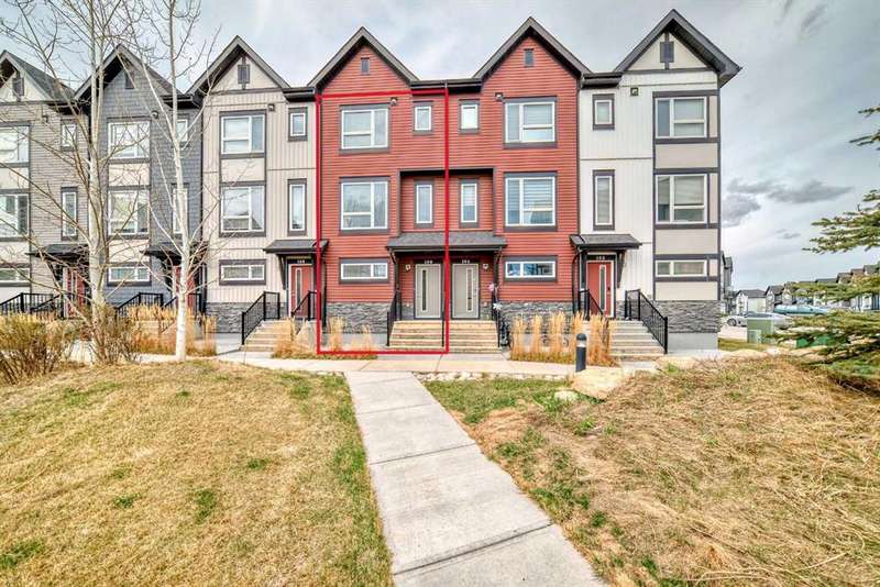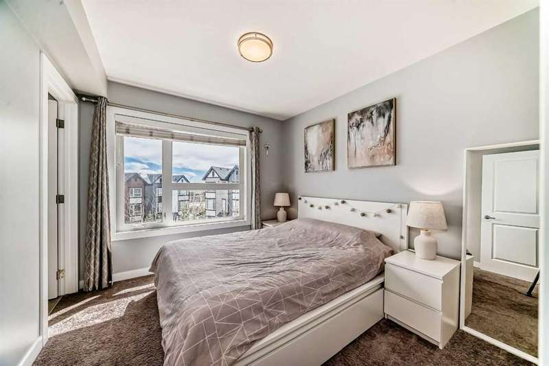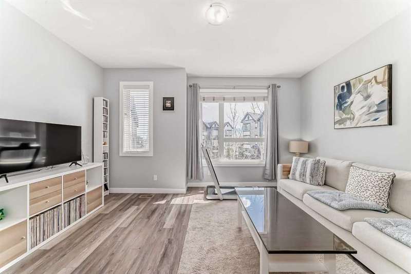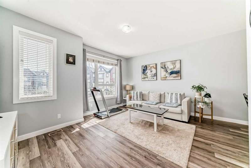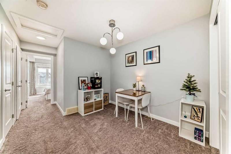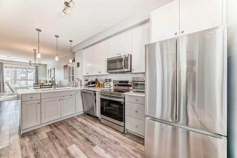 BEAUTIFULLY MAINTAINED Townhouse awaits in the sought-after Evanston neighborhood. This townhome features 2 BEDROOMS, 2.5 BATHS, the addition of a BONUS ROOM/OFFICE on the upper floor, 1,425 sq. ft. of living space. This home also includes the convenience of an oversized double attached garage (tandem parking) with a window. As you enter, you are introduced to a large foyer, utility room and garage all situated on the lower floor. As you walk up the stairs, you will be greeted by the bright and open concept designed for use with NEW PAINT & NEW LIGHTING FIXTURES throughout (Main & upper level), featuring 9 foot ceilings and beautiful vinyl plan floors. The spacious kitchen offers a raised breakfast bar, a closet pantry and stainless steel appliances (NEW DISHWASHER, ELECTRIC STOVE & REFRIGERATOR purchased in 2025). Also, a generously sized kitchen equipped with abundant cabinets and ample counter space. Additionally, there's a half bath, a sizable dining area and a spacious living room flooded with natural light from numerous windows. The balcony is accessed from the kitchen with a gas-line for BBQ completes this level. The upper level features a primary bedroom walk-in closet and 3-piece en-suite. As you follow the hallway, you will find another 4-piece bathroom, and another sizable bedroom with a walk-in closet. These two bedrooms allow a ton of natural light from the large windows, have an extensive amount of room and storage with the closets. A BONUS room which can be used as an office and convenient upper-level laundry complete this level. Excellent location!! Located in a family-friendly neighborhood, this townhouse is close to excellent schools, parks, shopping, and major roadways. It's just minutes from Costco, Wal-mart, T & T supermarket and easy access to the Stoney Trail offering the perfect balance of convenience and comfort. Don't miss the opportunity to make this townhouse your own!